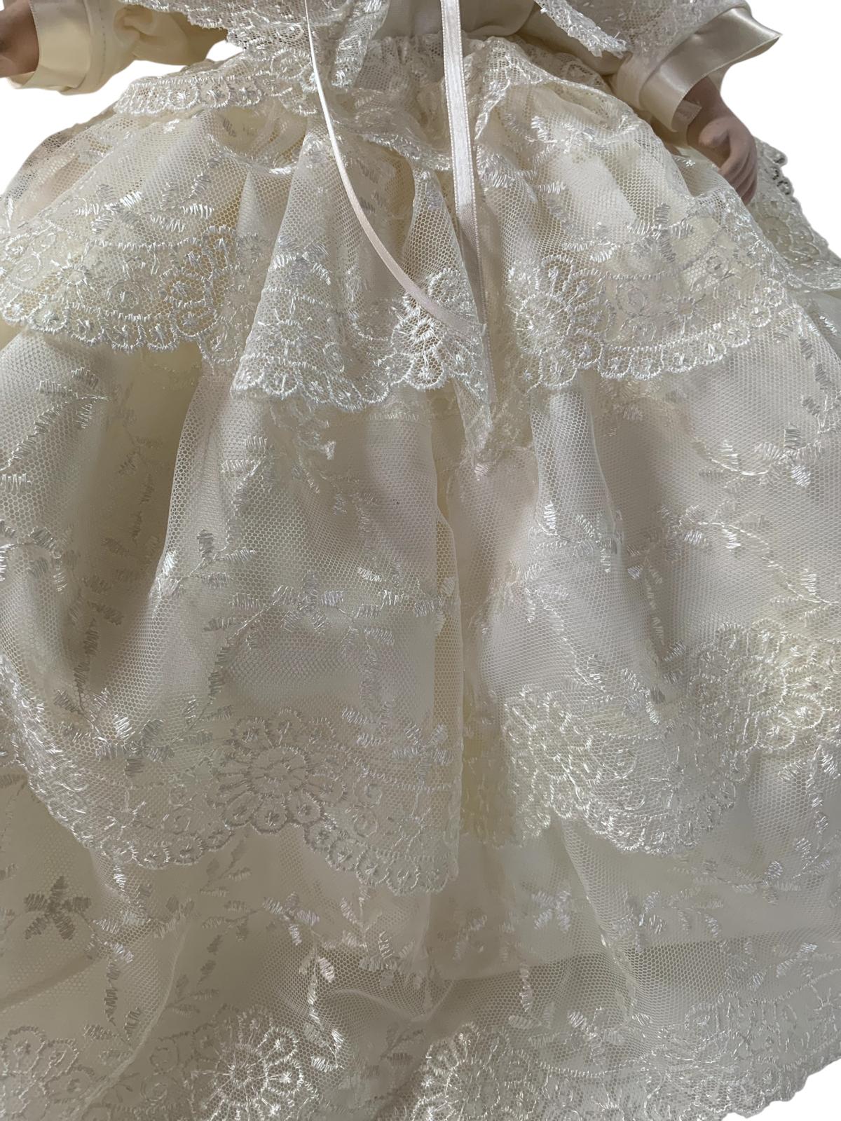 Bambola in porcellana rifinita con damasco in seta e tulle ricamato avorio lavorazione artigianale di nostra produzione.