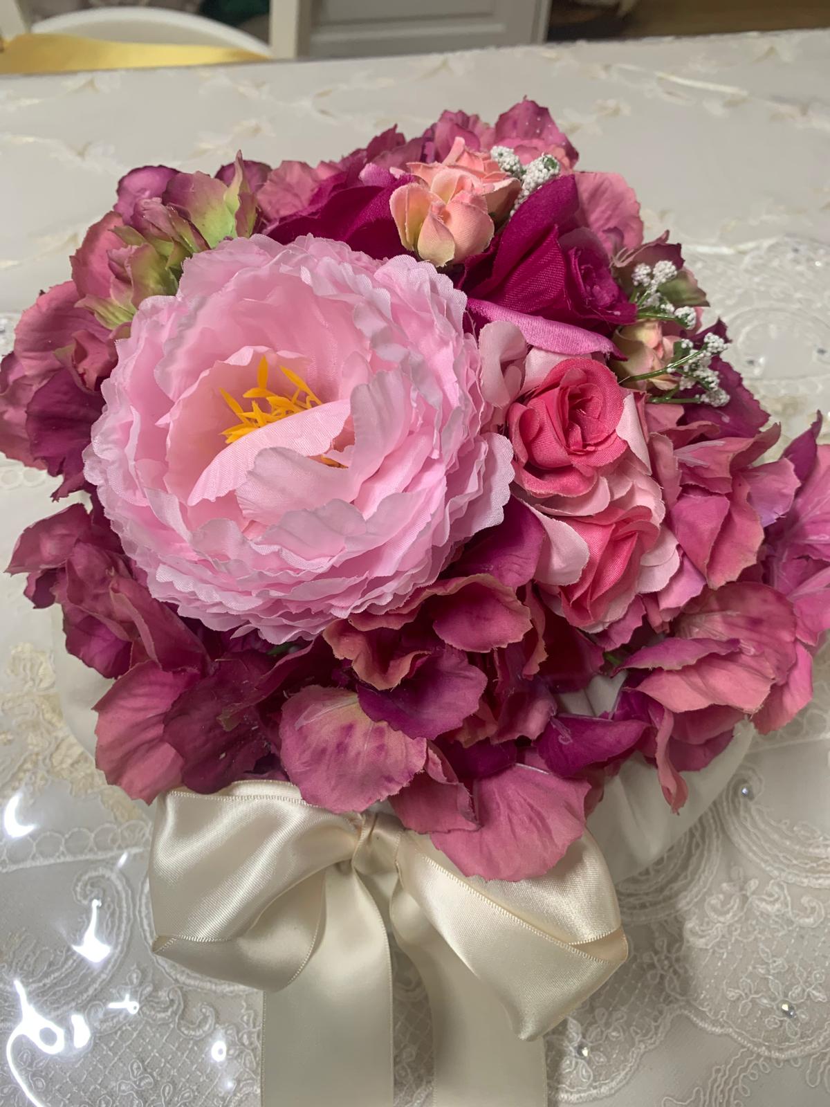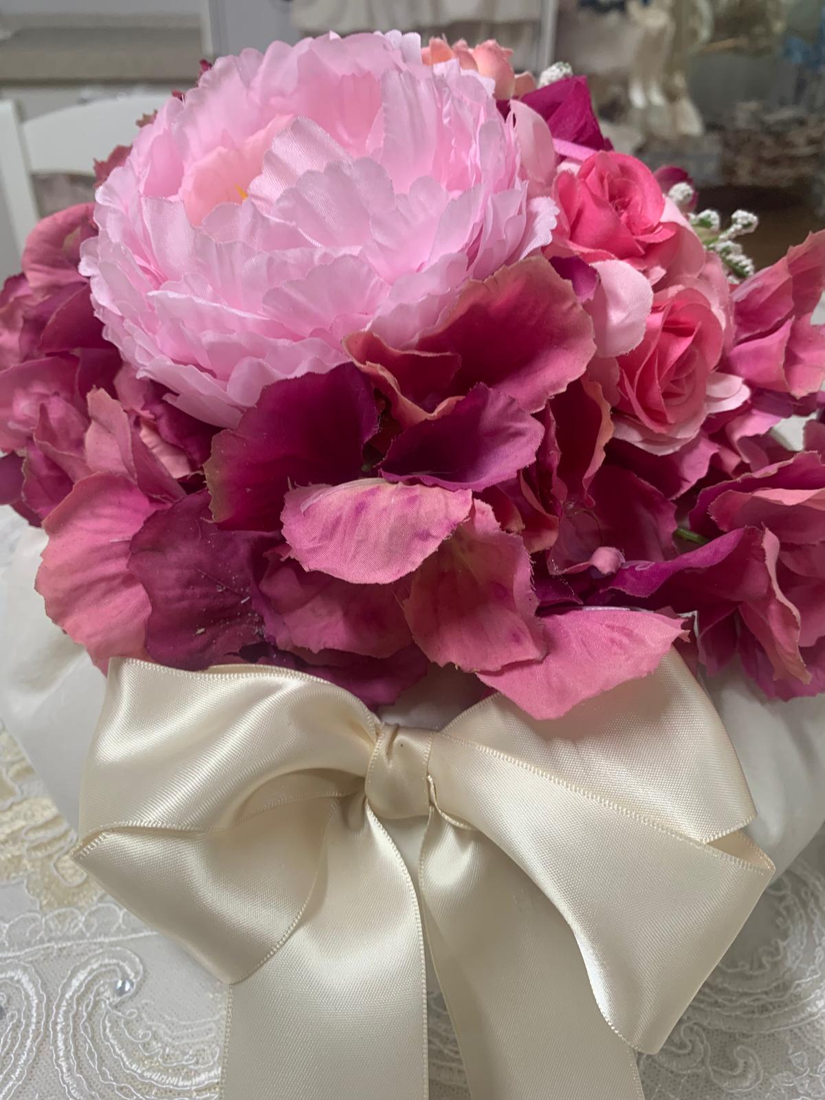 Bonbon velluto avorio rifinito con fiori rosa e fucsia .