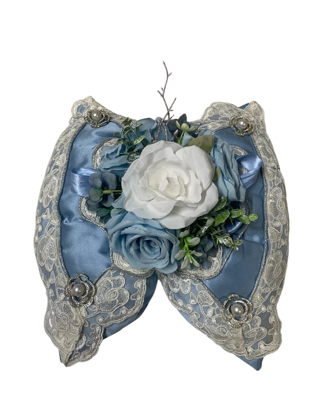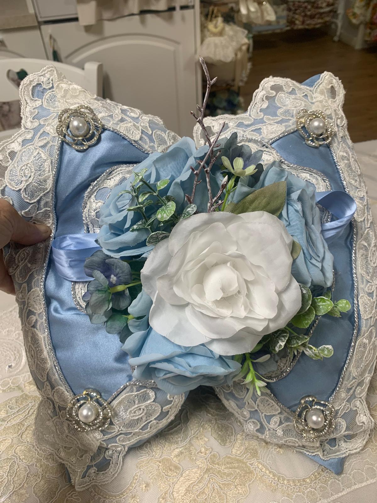 Cuscino fiocco rifinito con pizzo rebrodè avorio fiori panna e celeste quattro gioielli agli angoli e fili di cordoncino lurex argento.