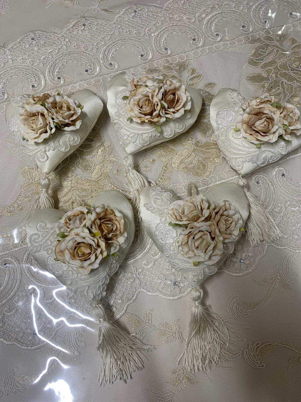 Cuore appendino in damasco in seta con fiori profumato rifinito con pizzo rebrodè panna e nappa panna.