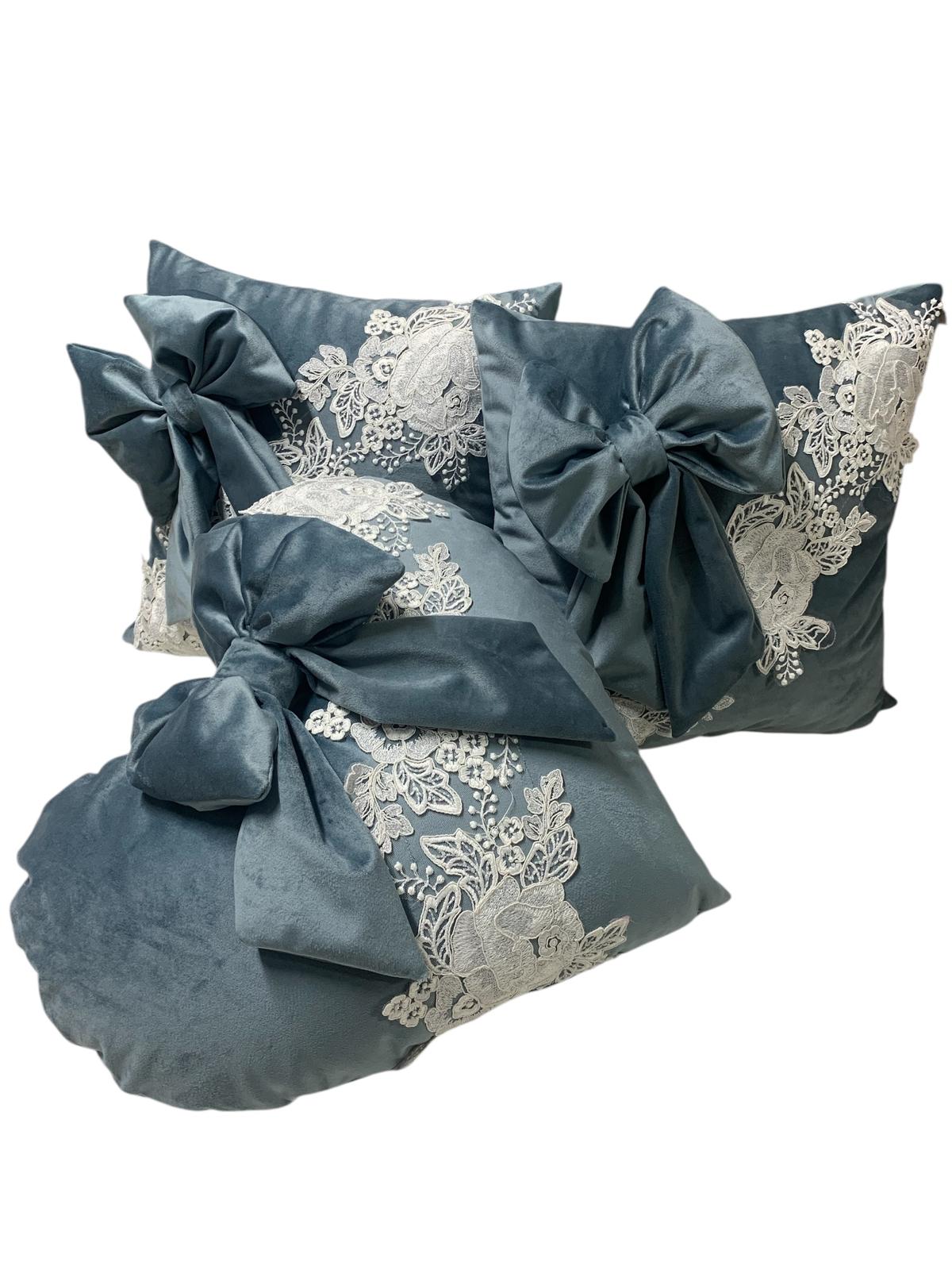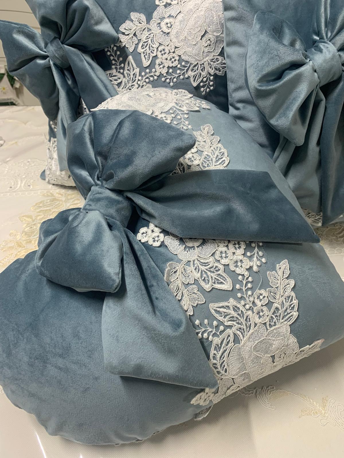 Tris cuscini velluto azzurro polvere rifiniti con pizzo rebrodè panna e argento con fiocco di velluto abbinato staccabile.