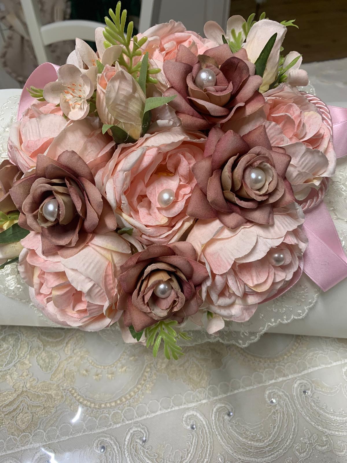 Caramella intessuto avorio decorata con fiori e pizzo in tulle ricamato avorio con applicazioni di perle.