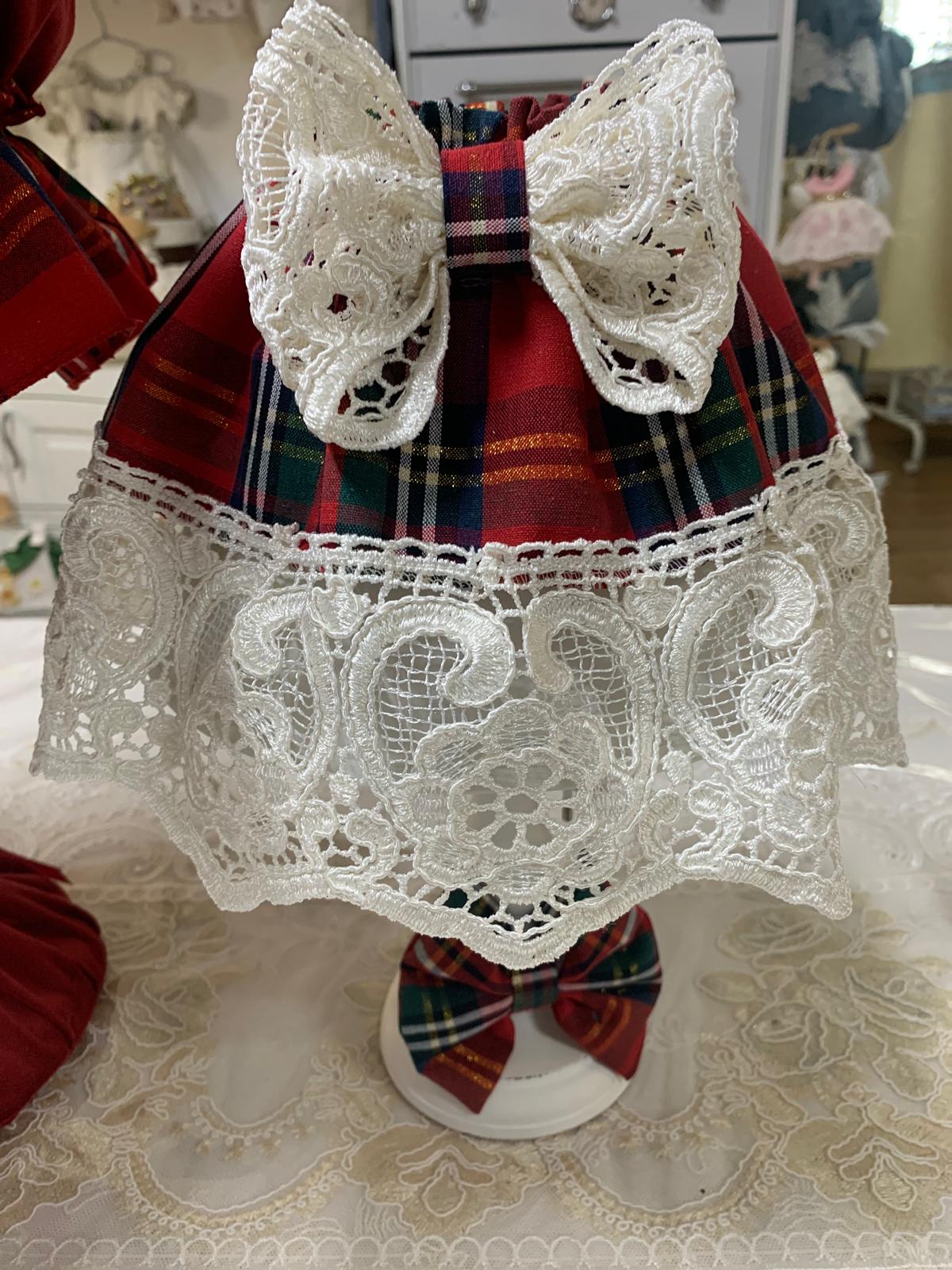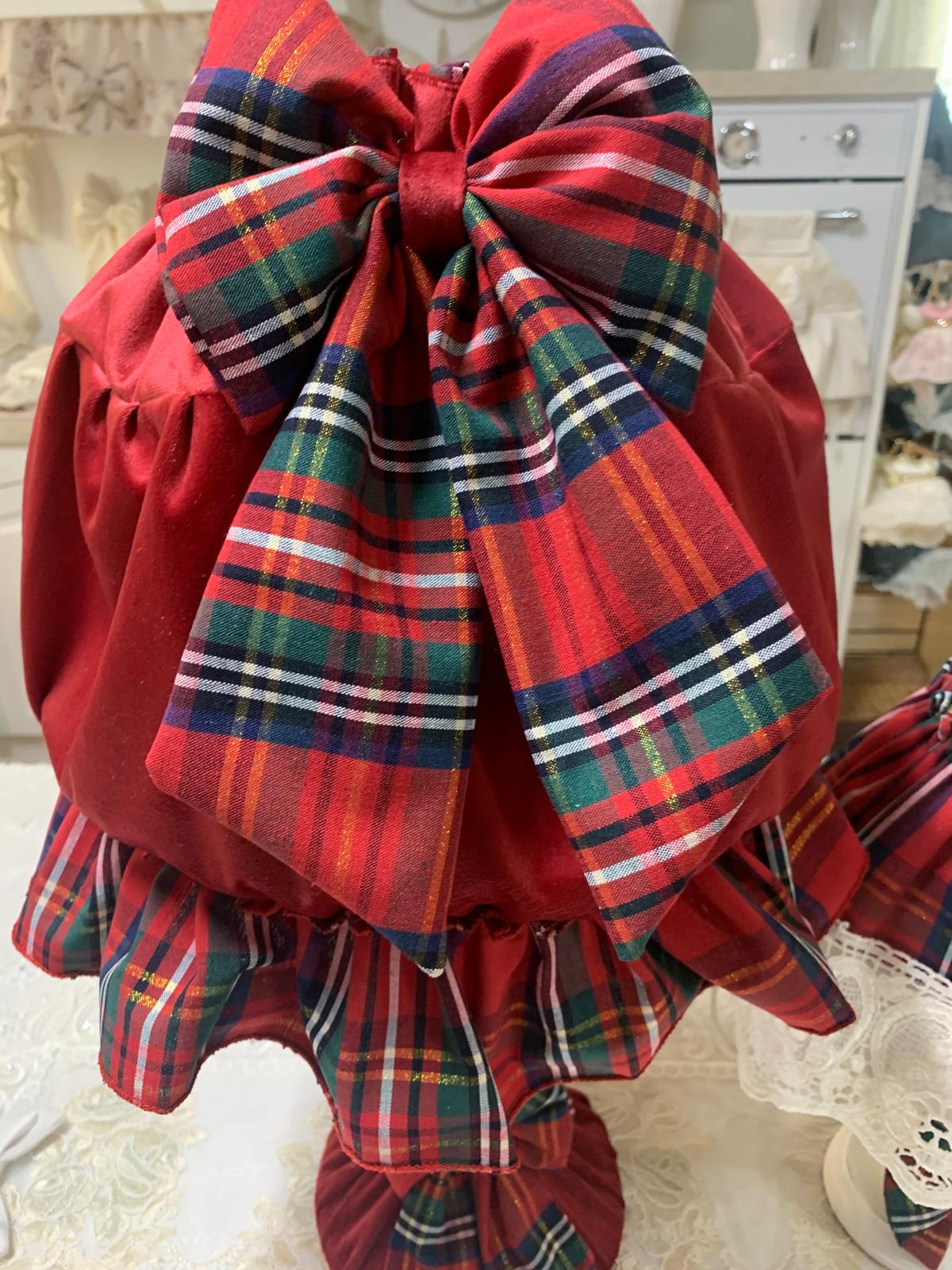Coppia lampade natalizie rifinite in velluto rosse e tessuto scozzese.