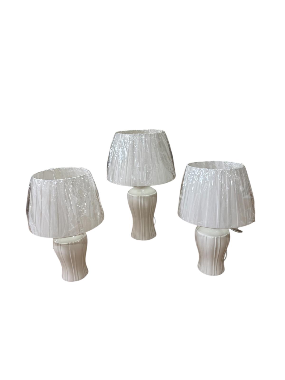 Tris lampade con base in ceramica bianca rigata caratterizzata da linee verticali e con paralume bianco.