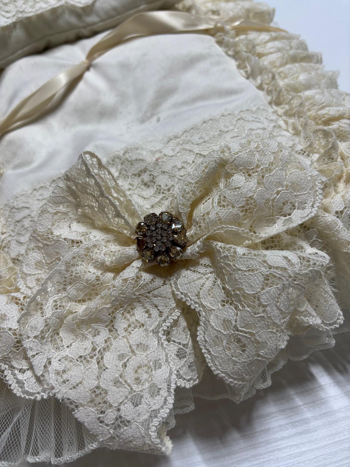 Cuscino in velluto avorio con bambinello rettangolare decorato con pizzo avorio e fiocco in pizzo con brillantino.
