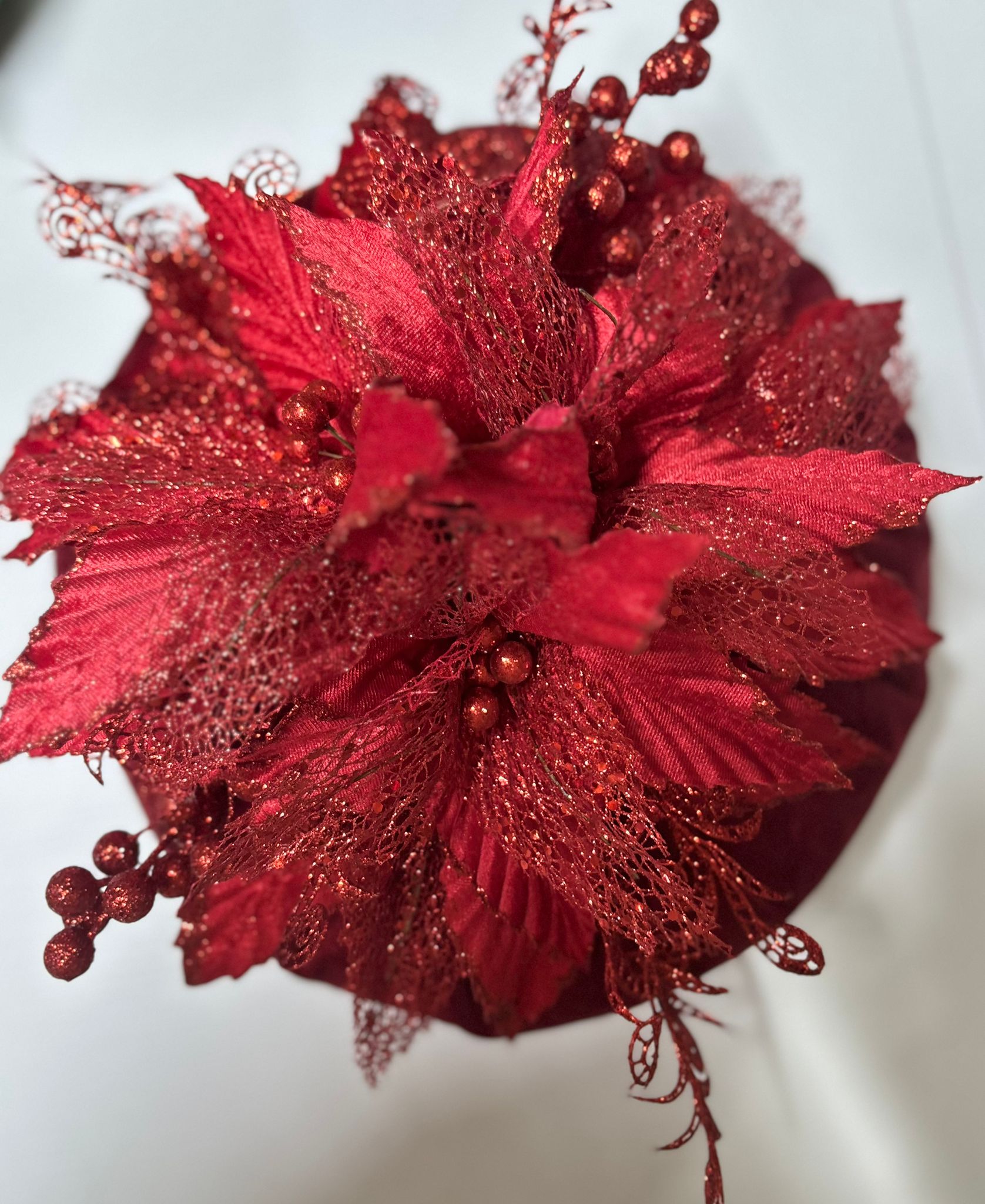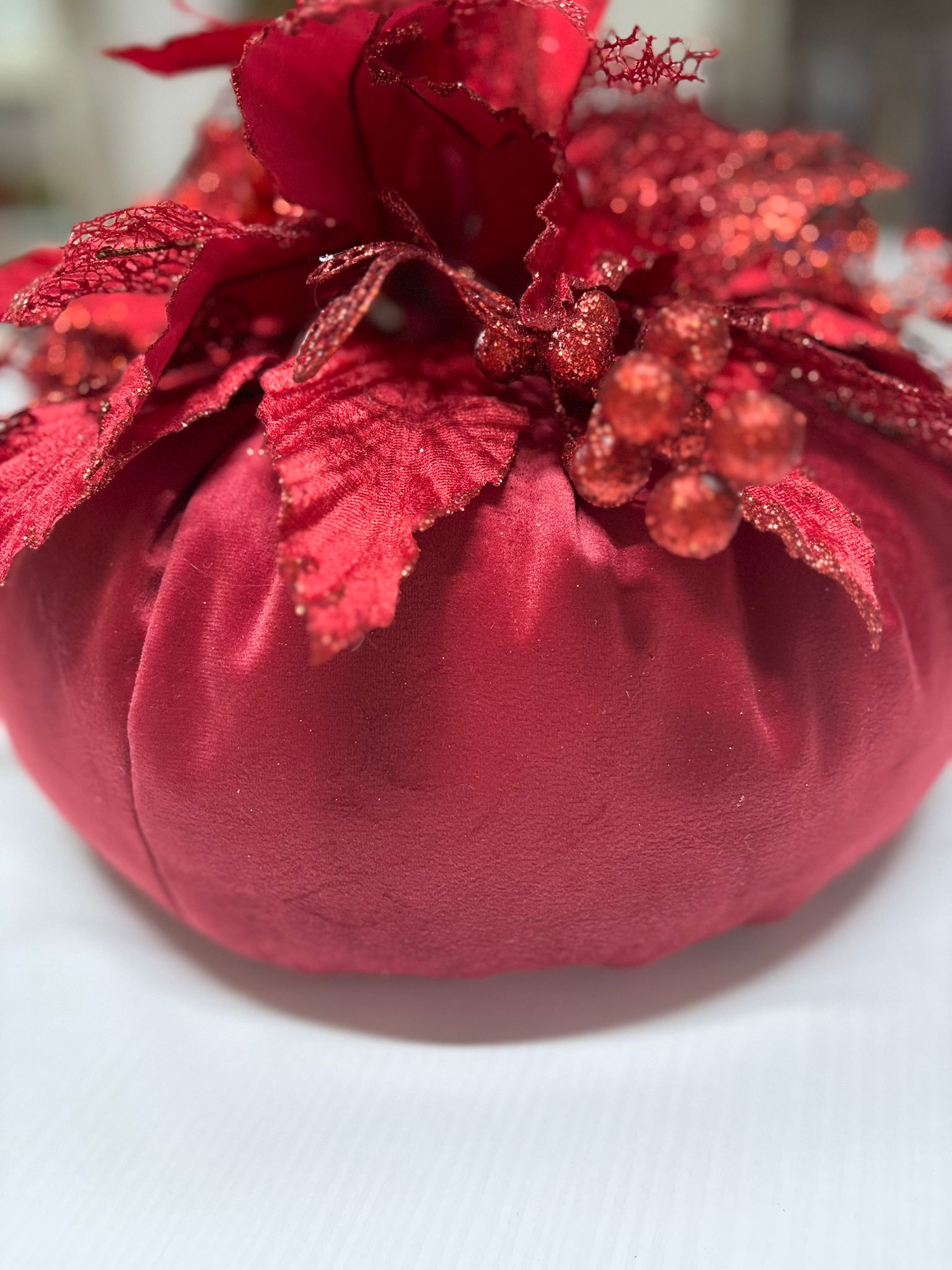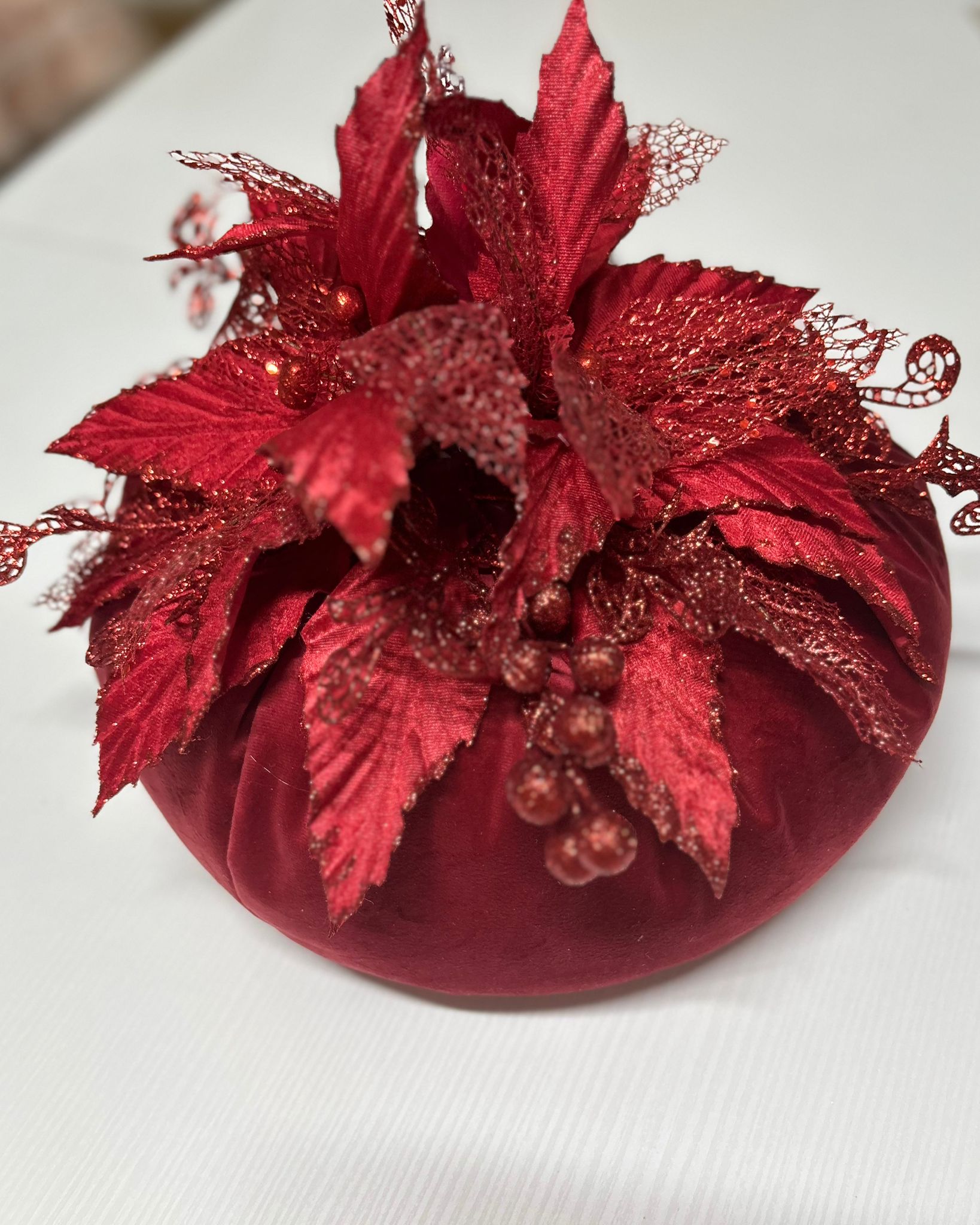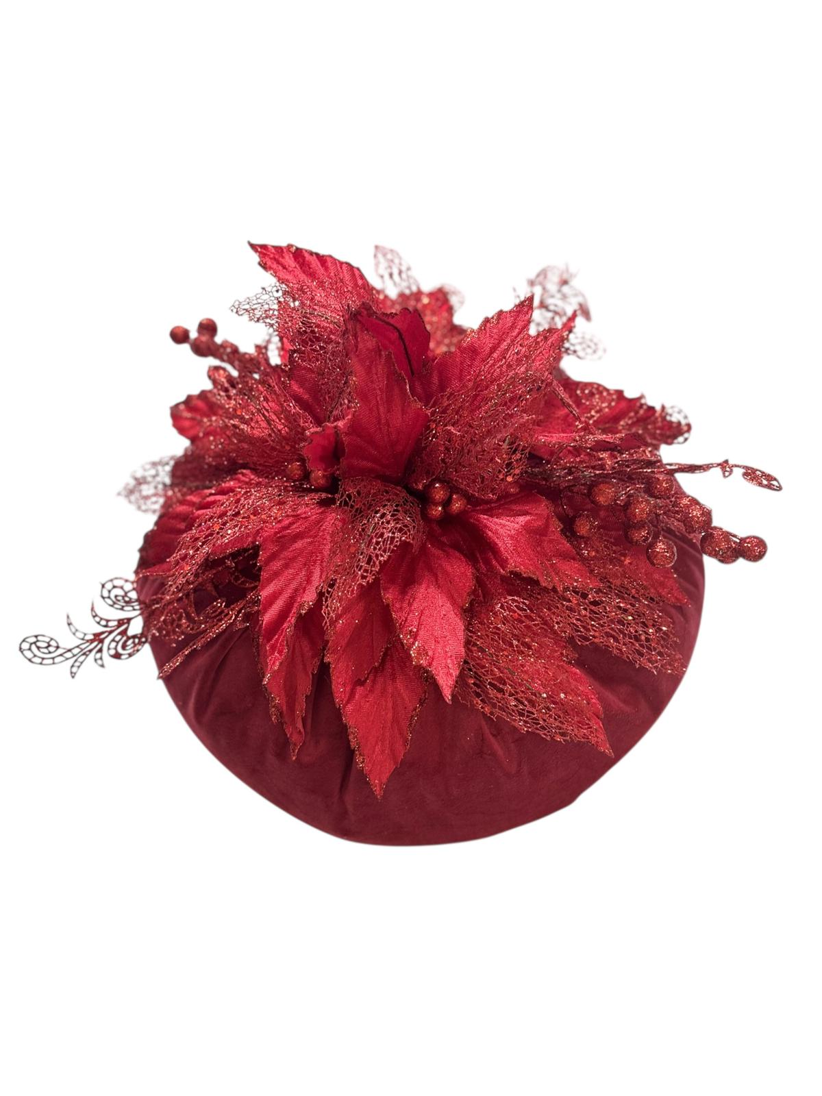 Puffo rosso in velluto decorato con foglie rosse brillantinate.