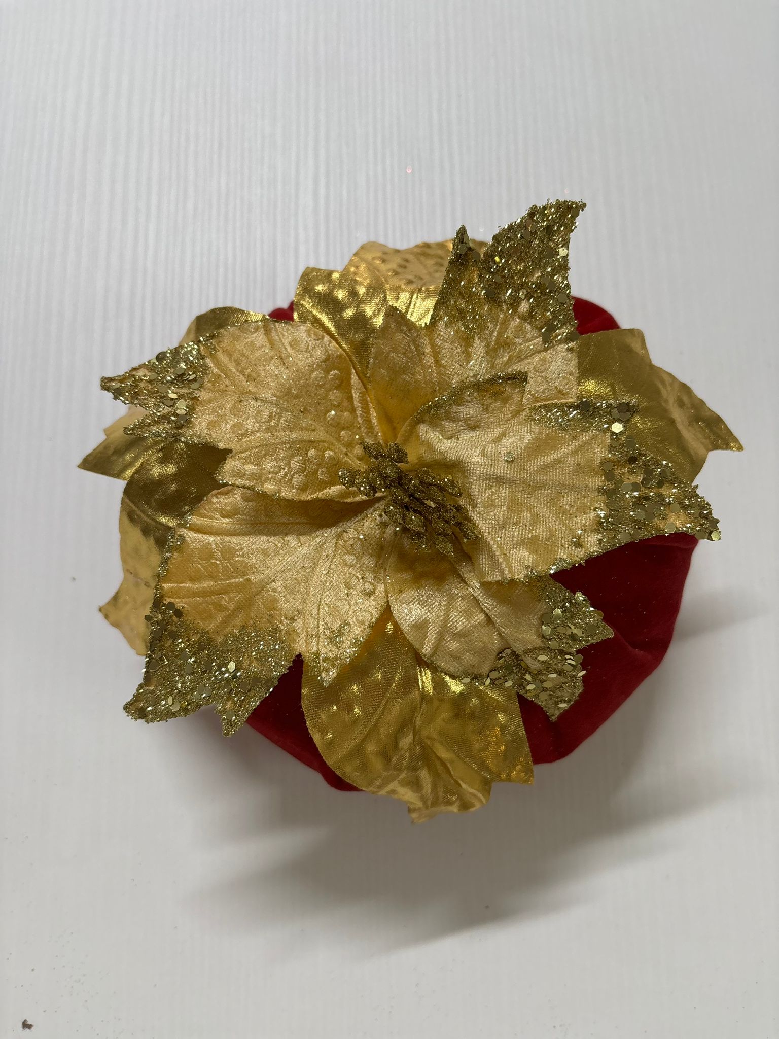 Puffo rosso in velluto decorato con foglie oro brillantinate