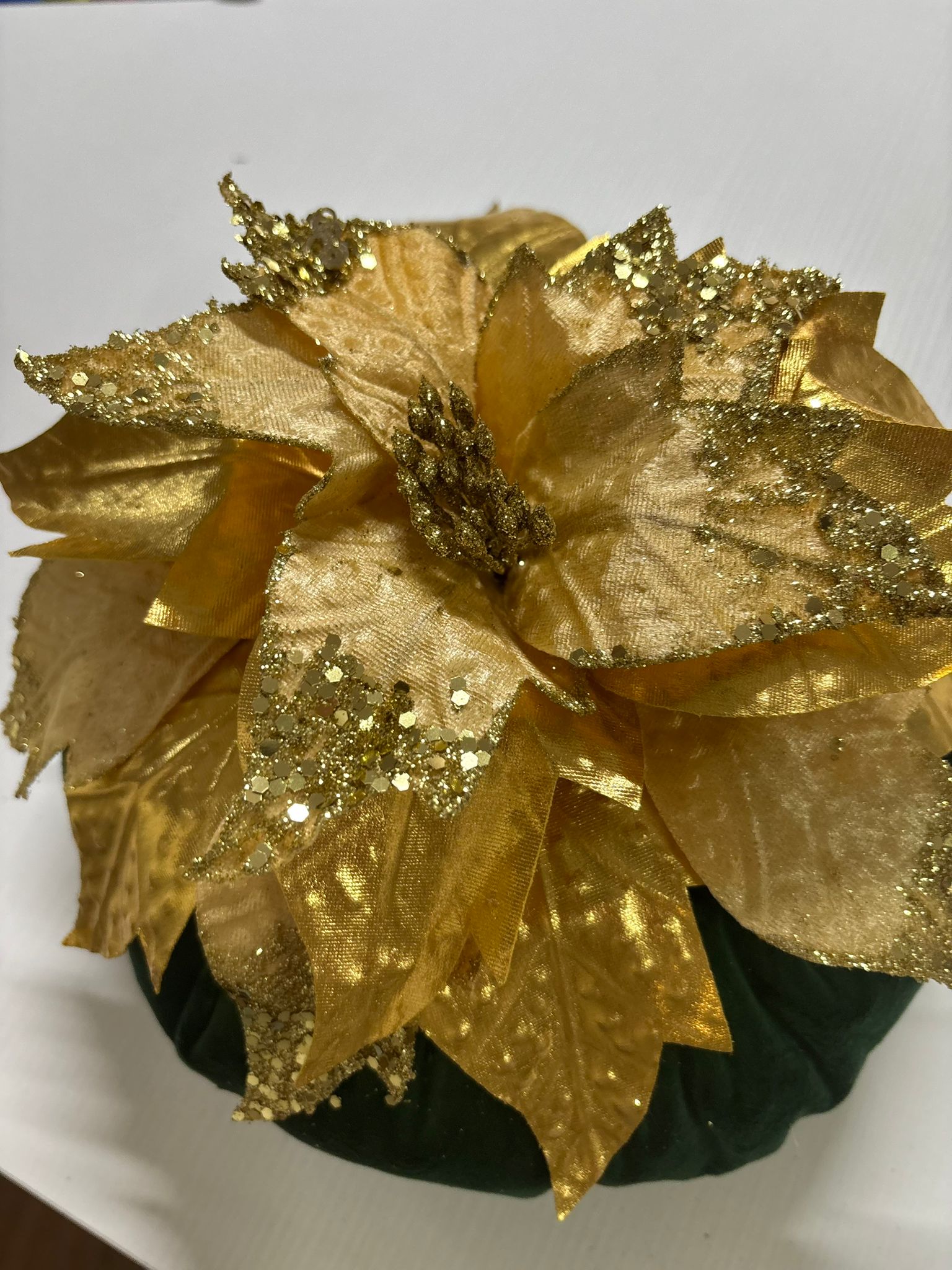 Puffo verde in velluto decorato con foglie oro brillantinate.