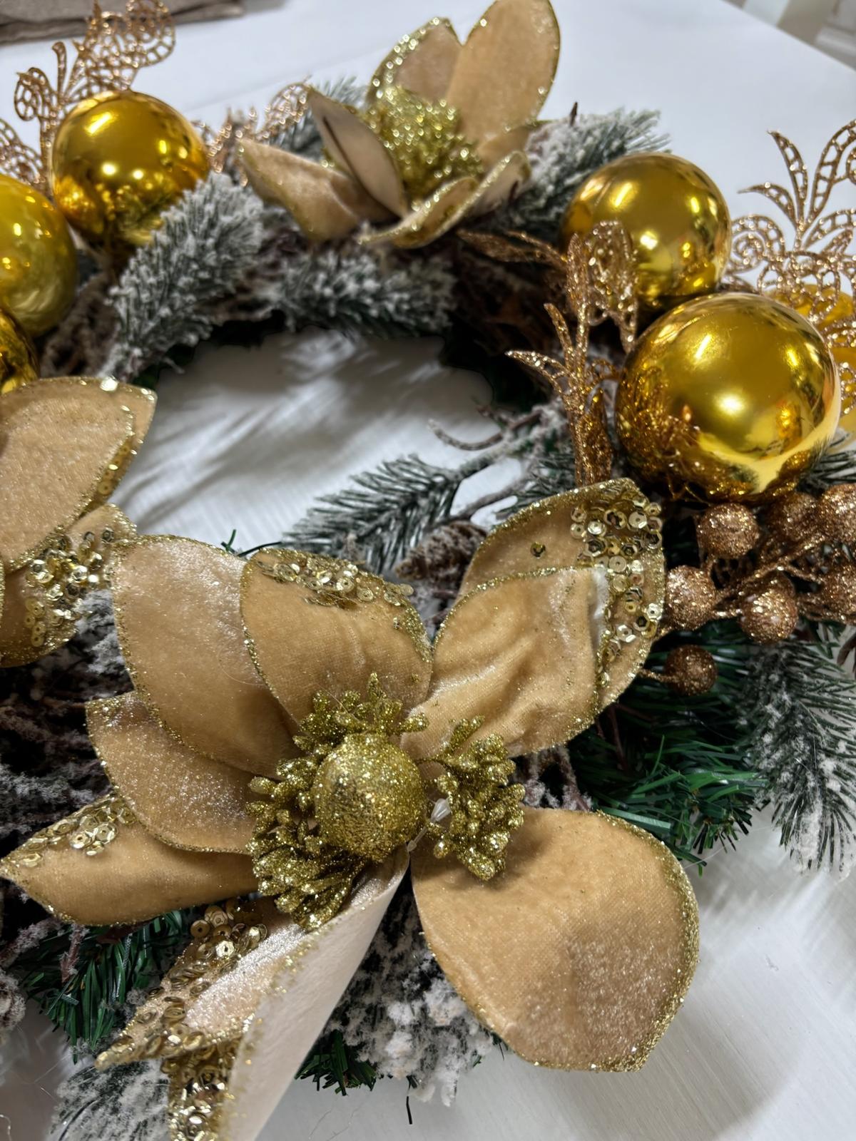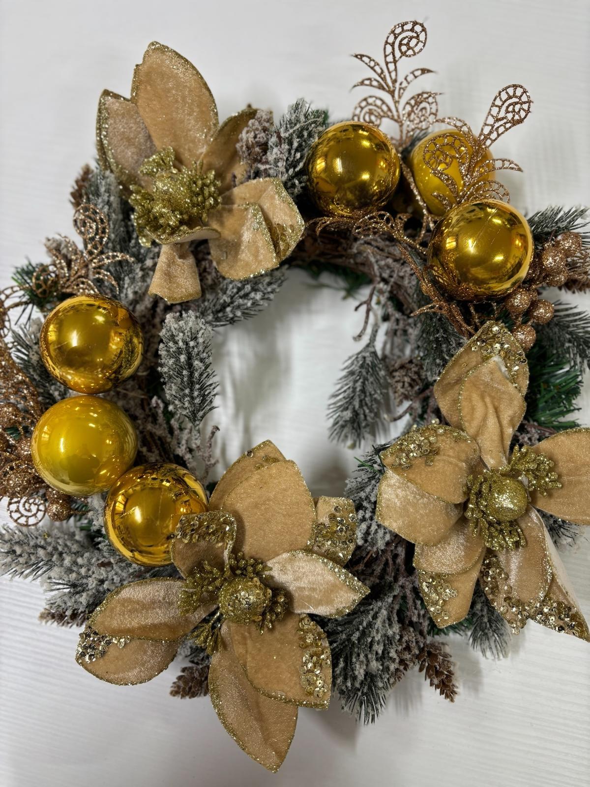 Ghirlanda decorata con fiori finti oro e con palline oro.