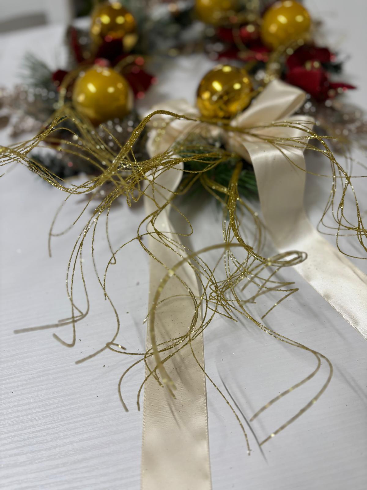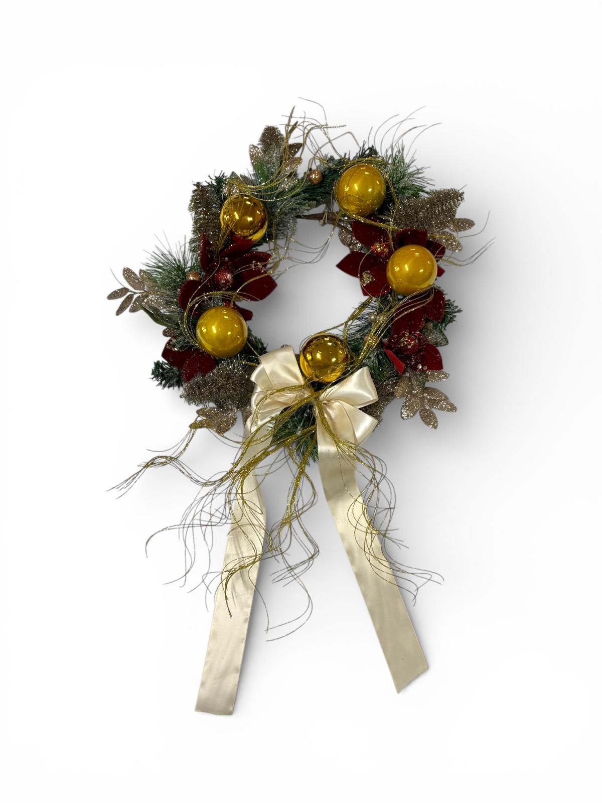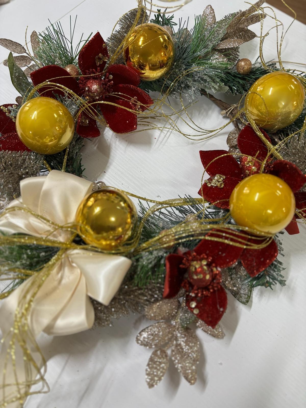 Ghirlanda natalizia decorata con fiocco in raso avorio, con fiori rossi in velluto e con palline oro.