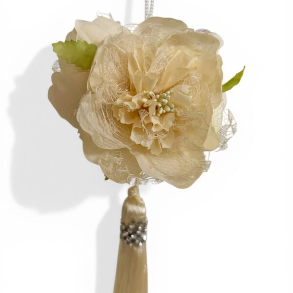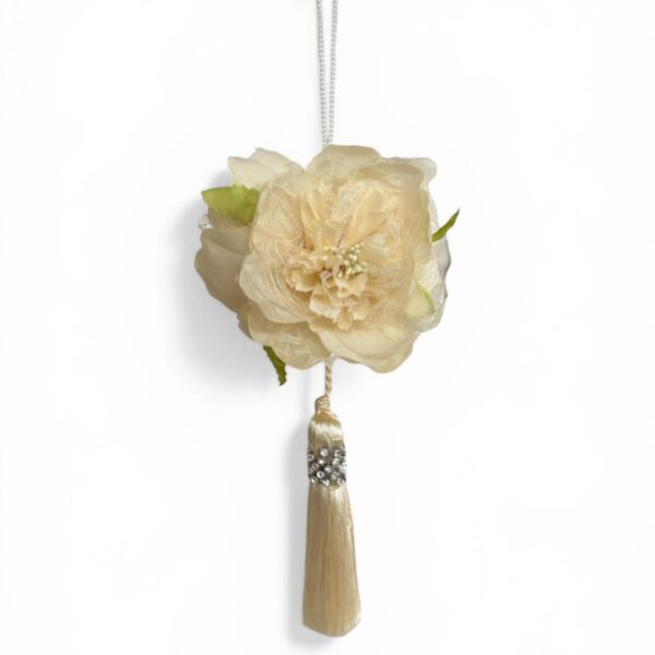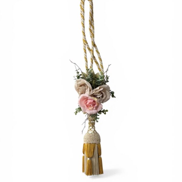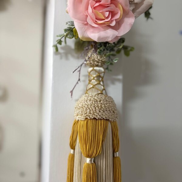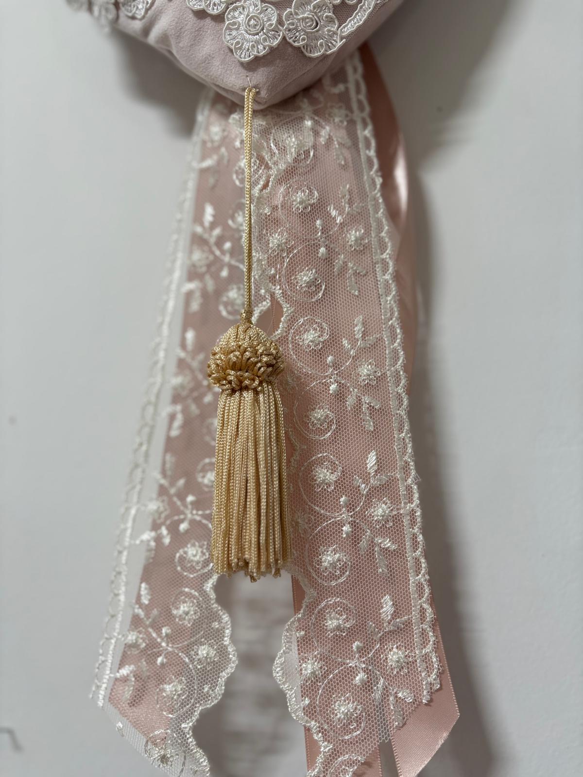 cuore appendino velluto rosa con pizzo rebrodè e rose rosa.
