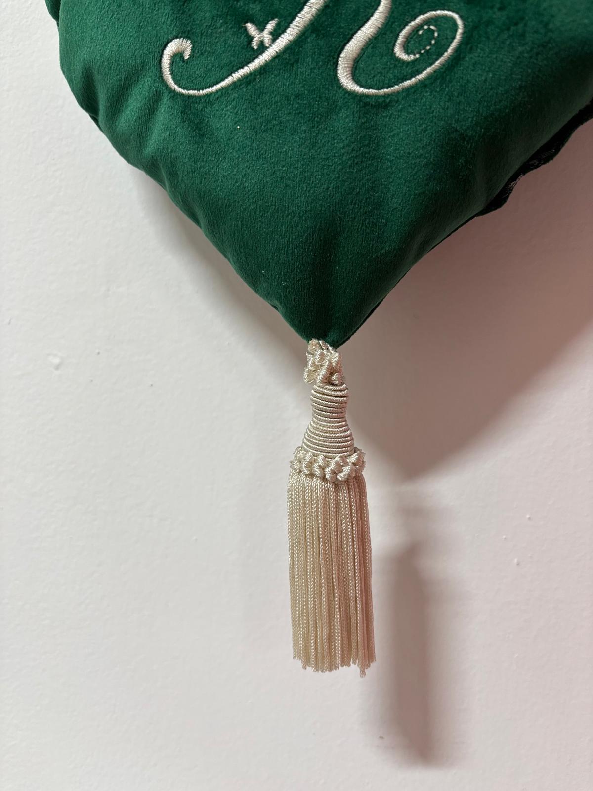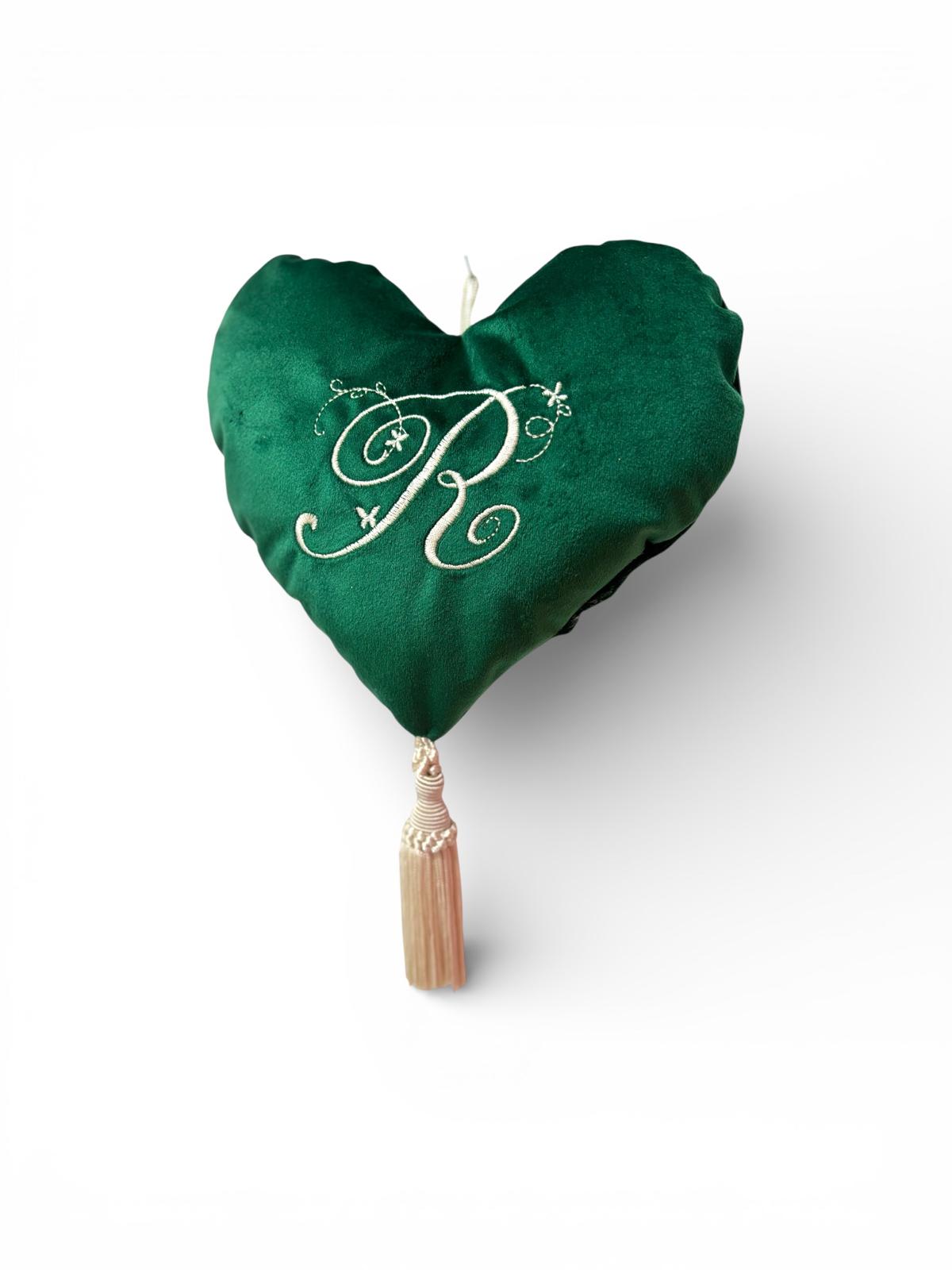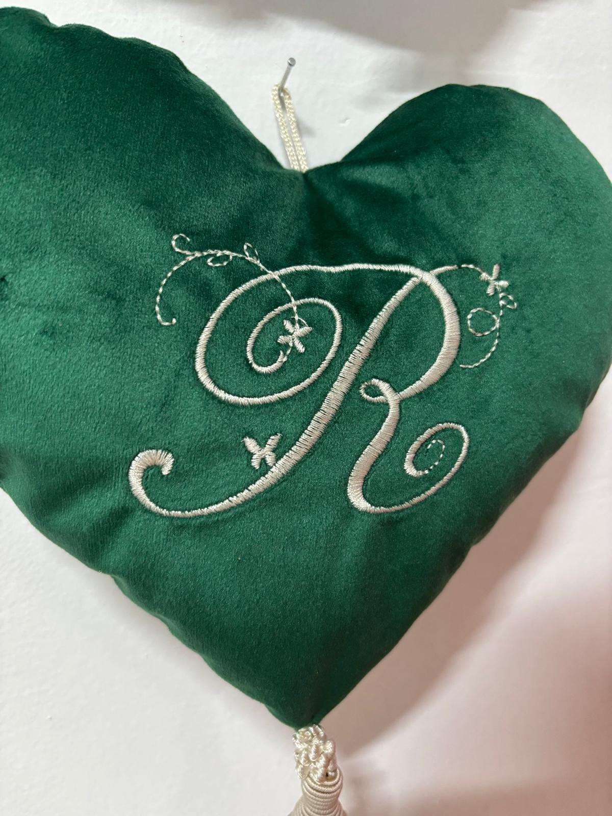 Cuore appendino velluto verde con lettera fatta a mano.