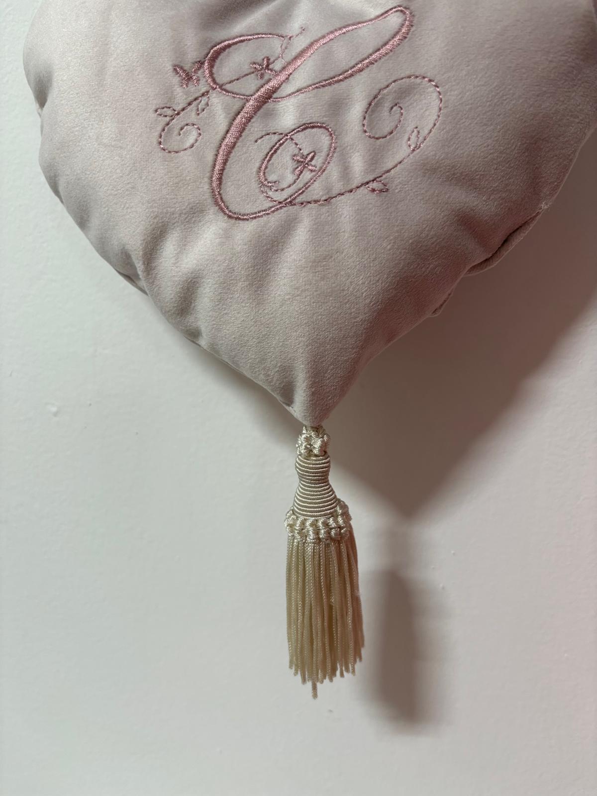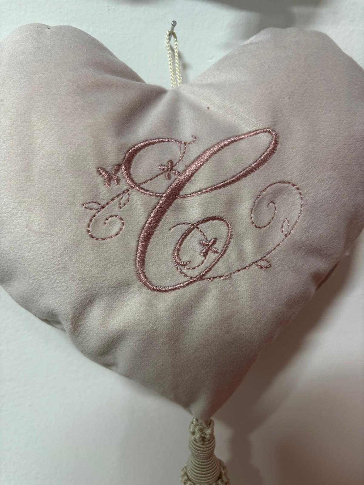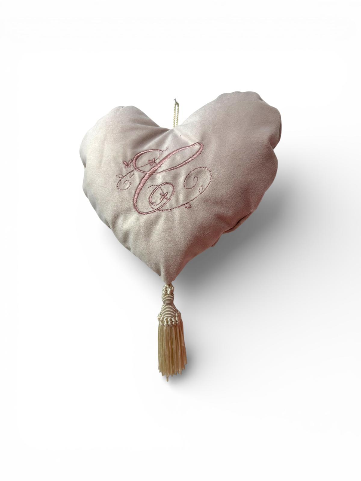 Cuore appendino velluto rosa con lettera fatta a mano.