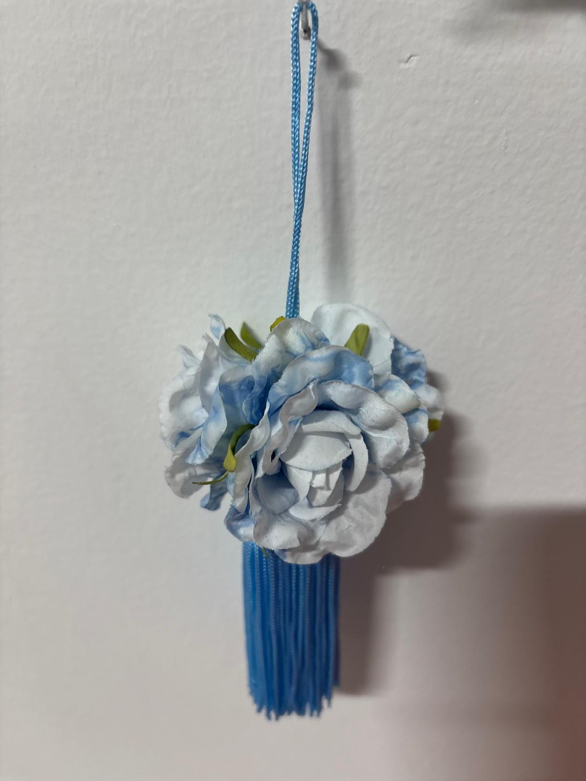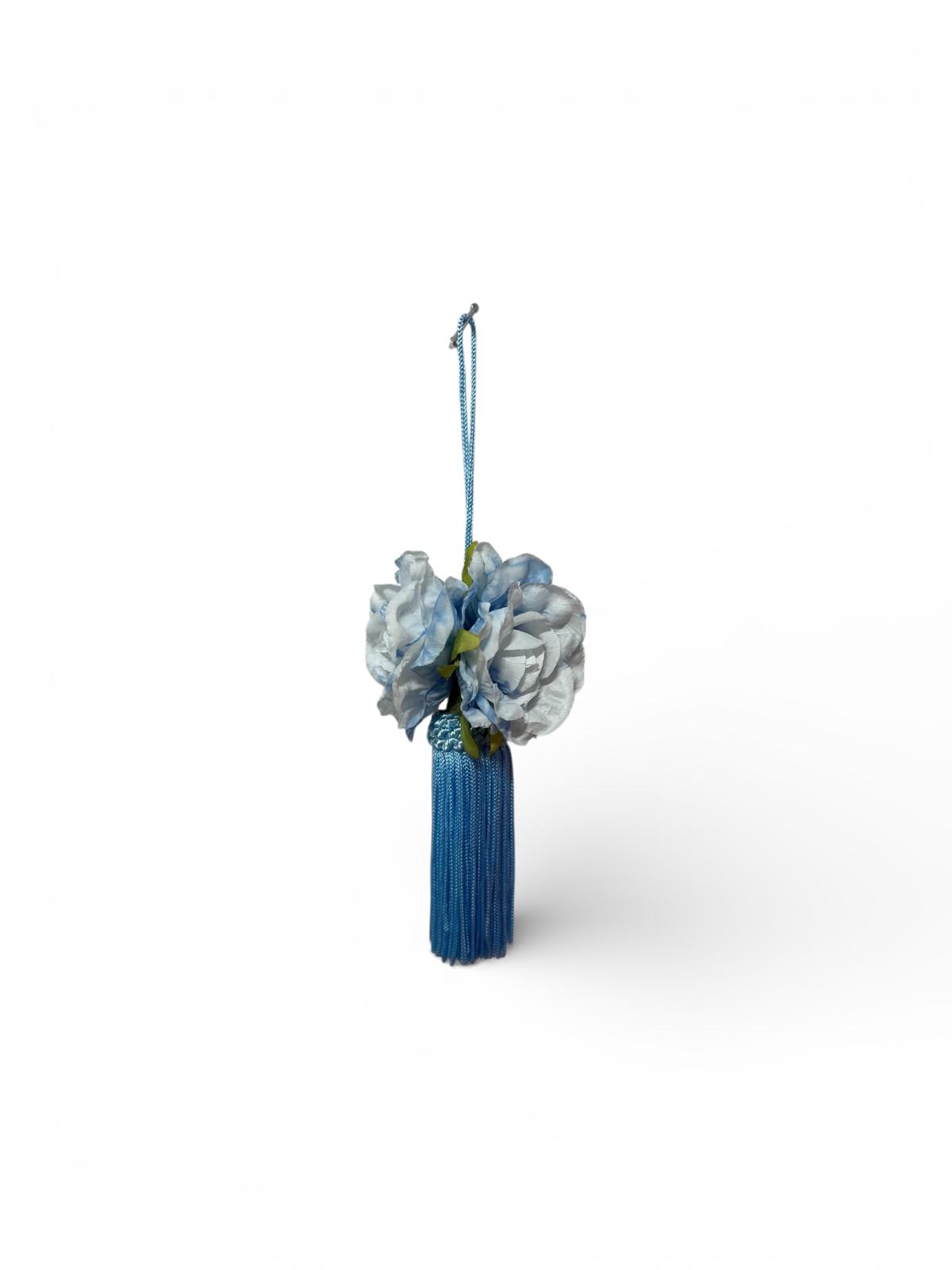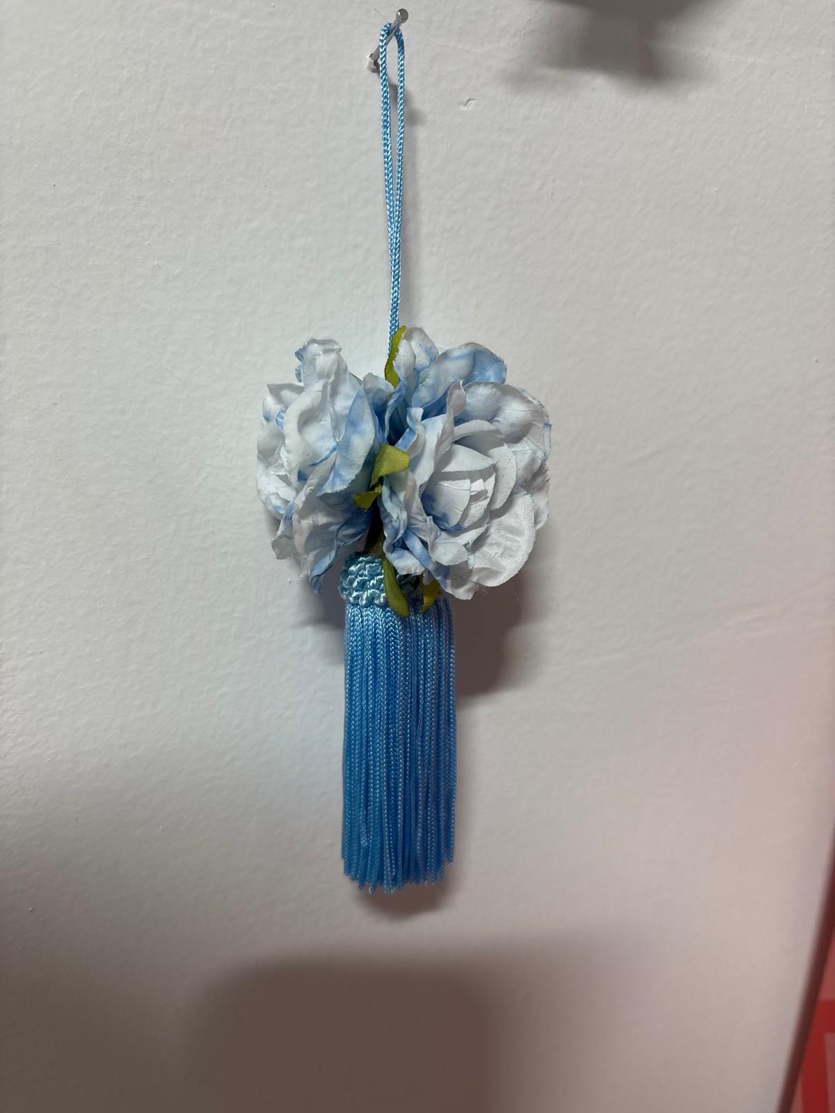Embrasse per chiavi azzurro per impreziosire armadi, decorato con roselline blu e bianche.