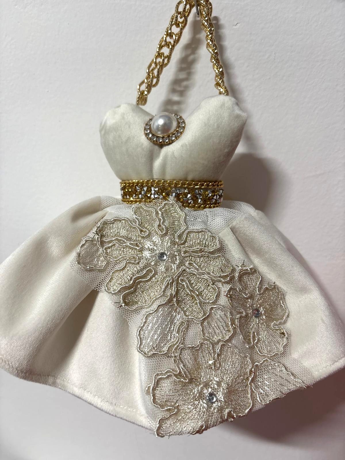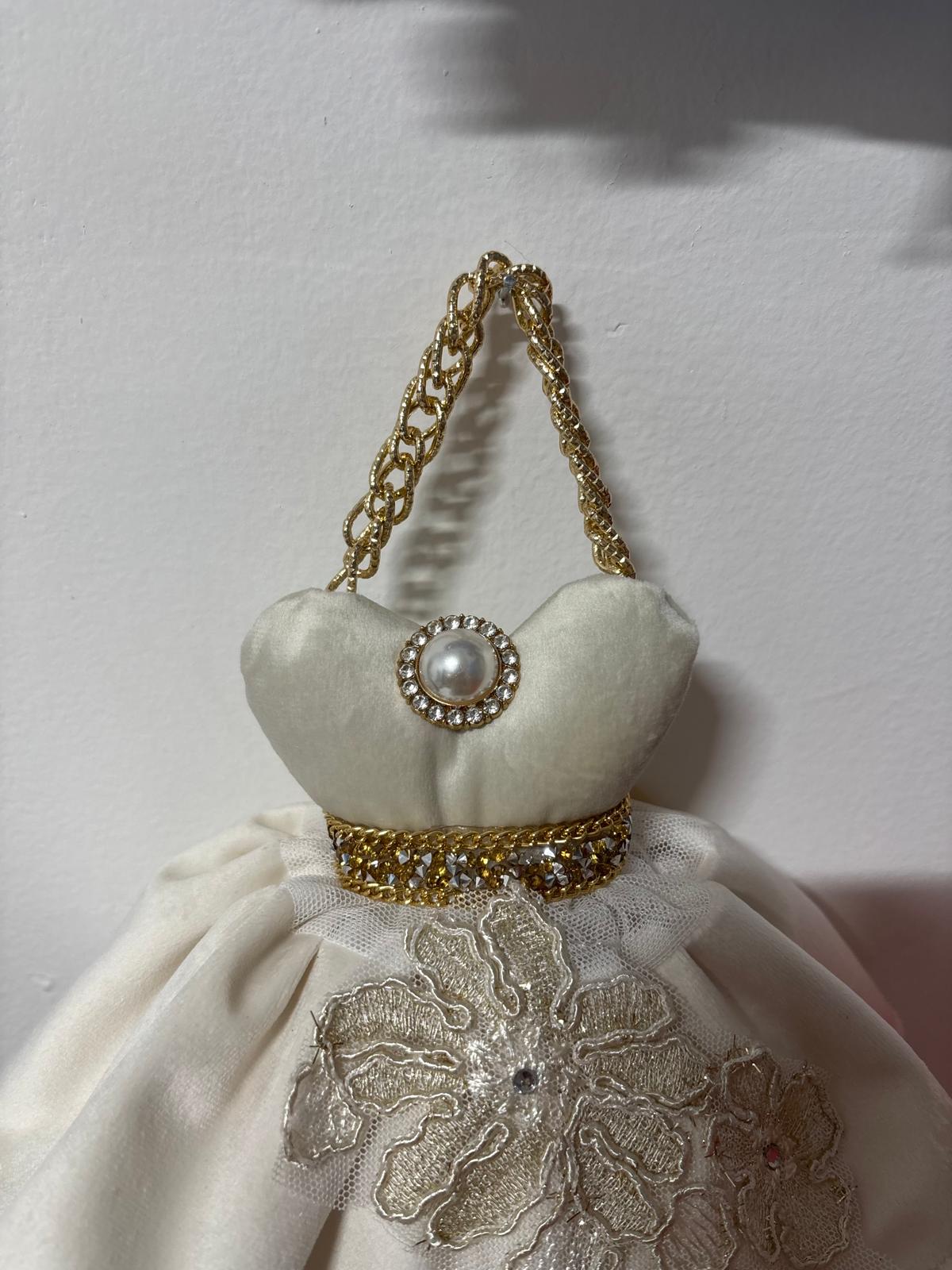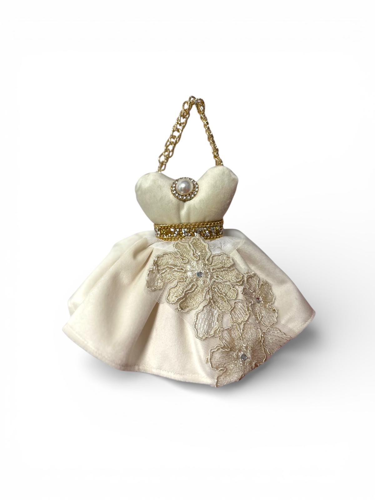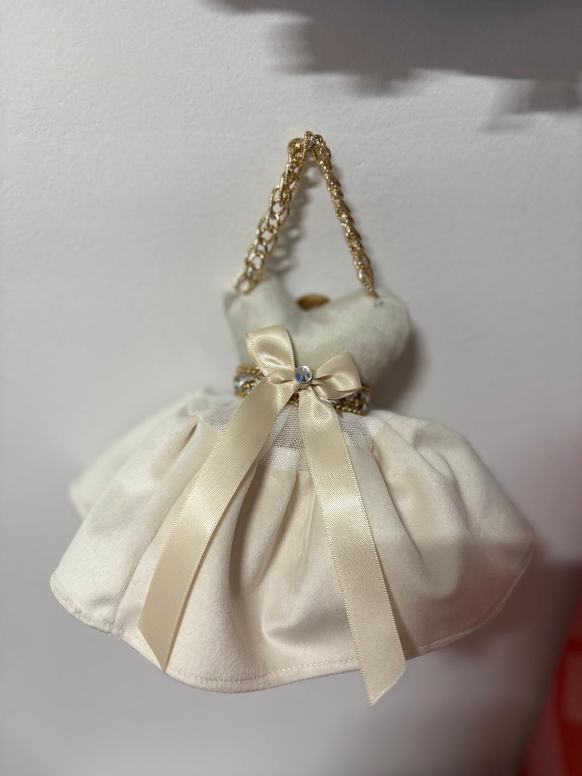Abitino in velluto avorio con sottogonna in tulle bianca e gonnellina acorio con pizzo avorio con decori oro e gioiello.