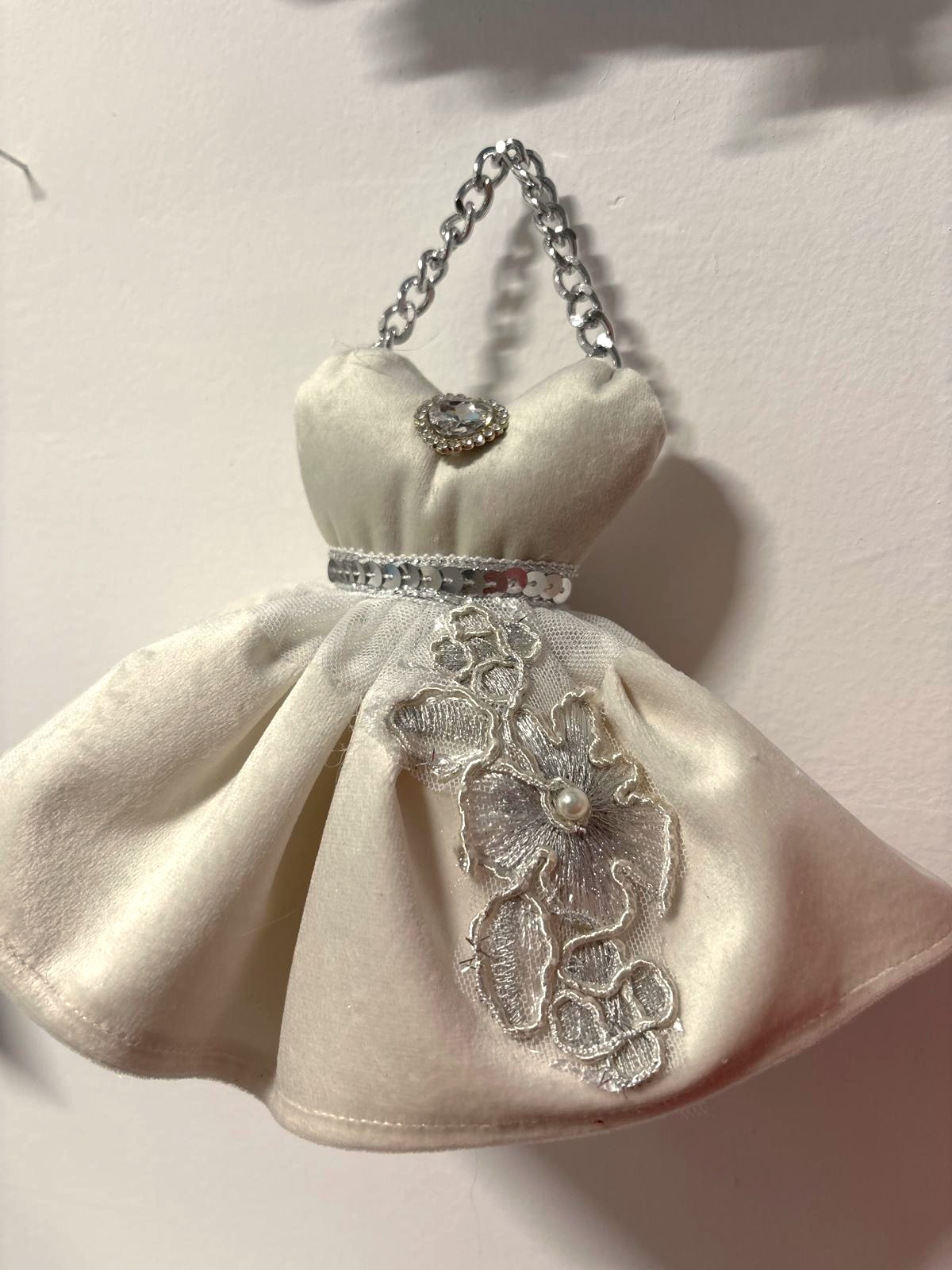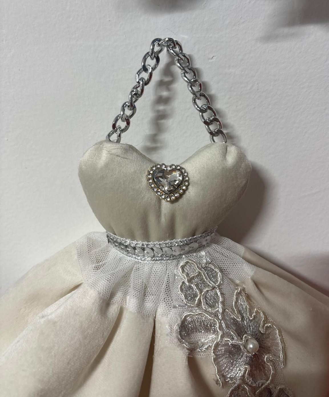 Abitino in velluto avorio con sottogonna in tulle bianca e gonnellina avorio con pizzo avorio con decori argento e gioiello.