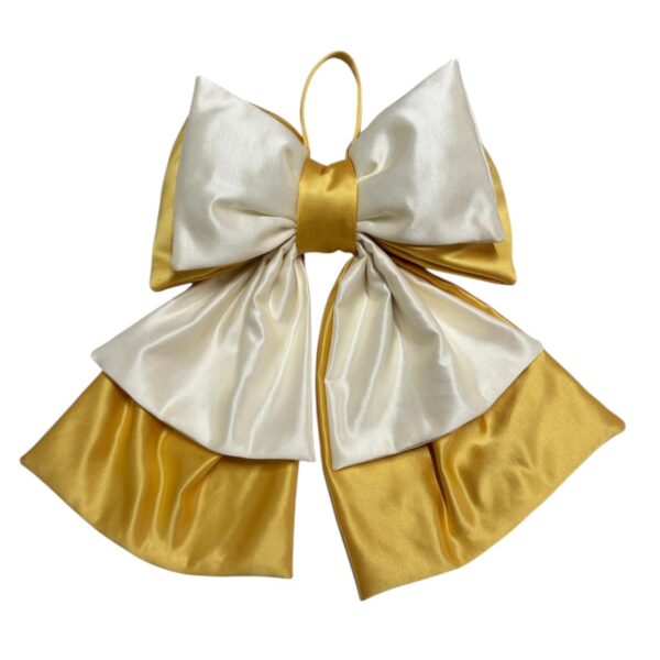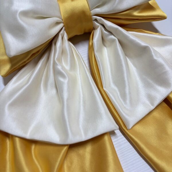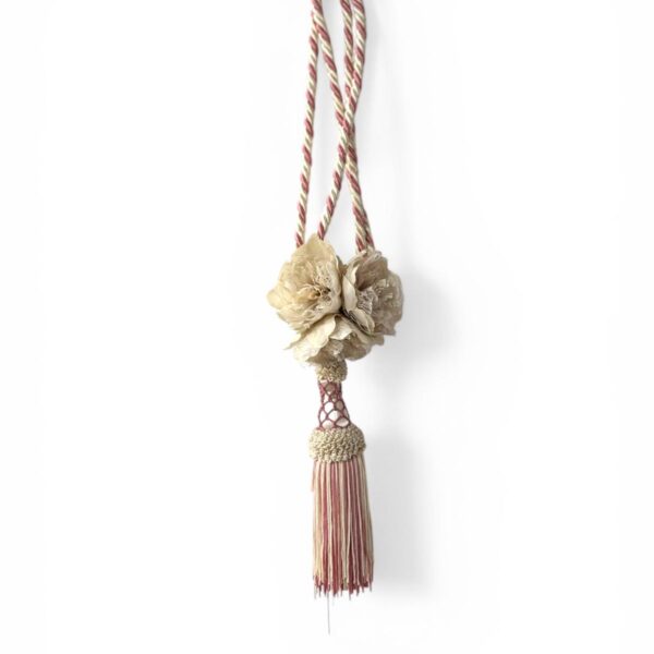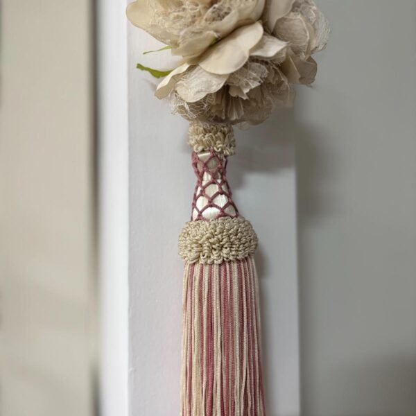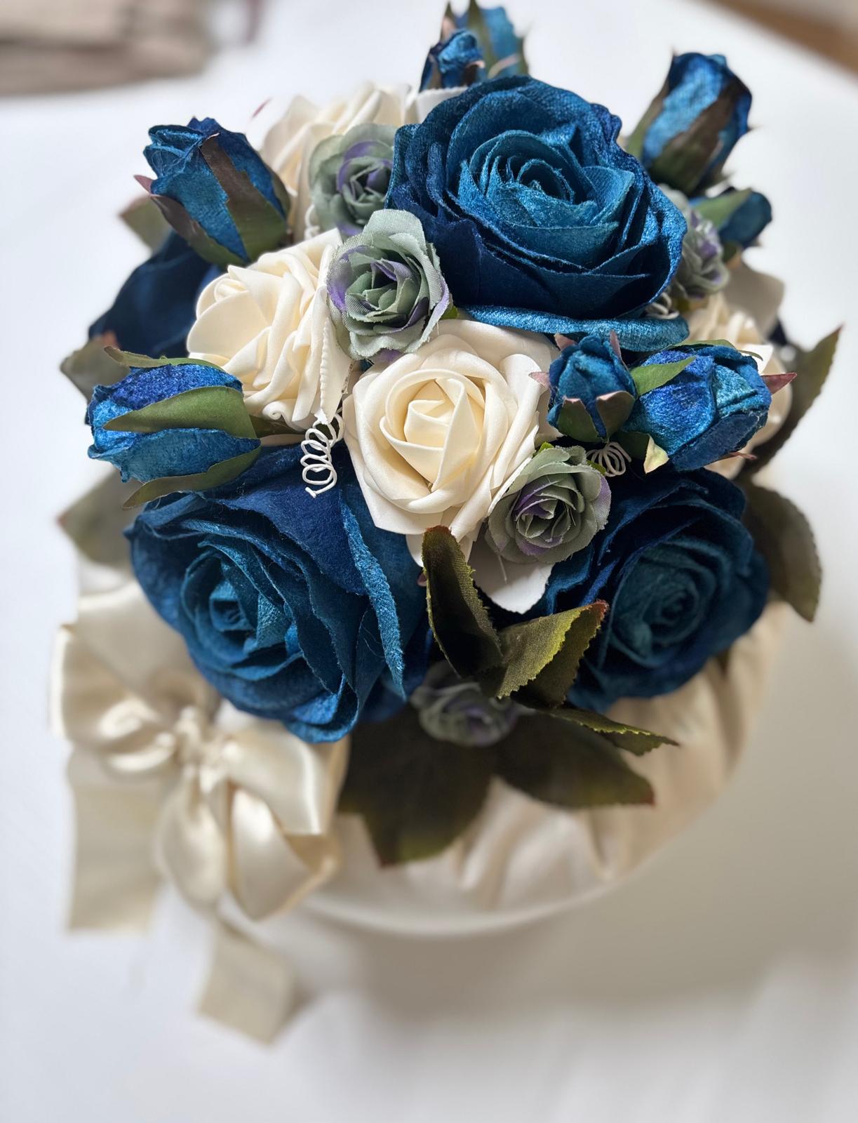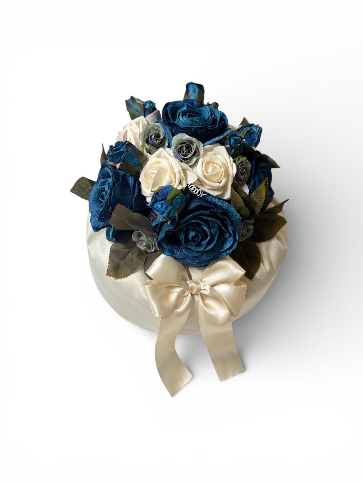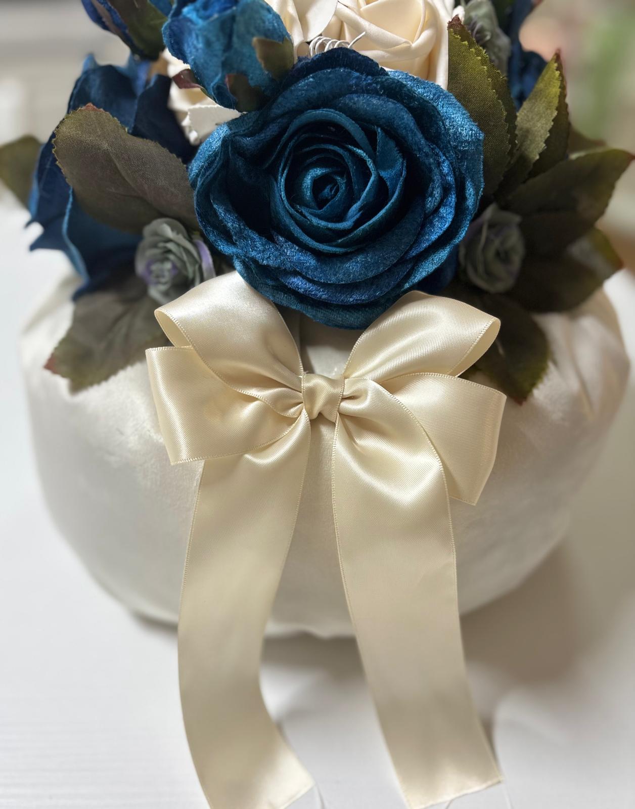 Puffo avorio in velluto con rose blu decorato con doppiofiocco avorio.