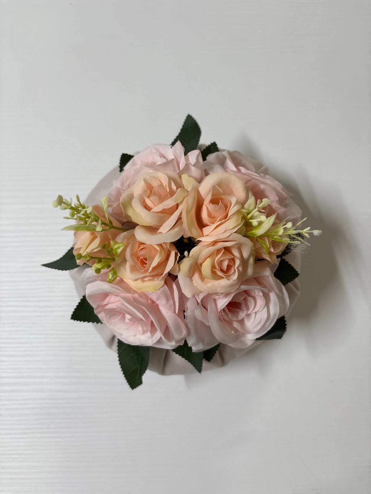 Puffo rosa decorato con rose rosa e pesca.