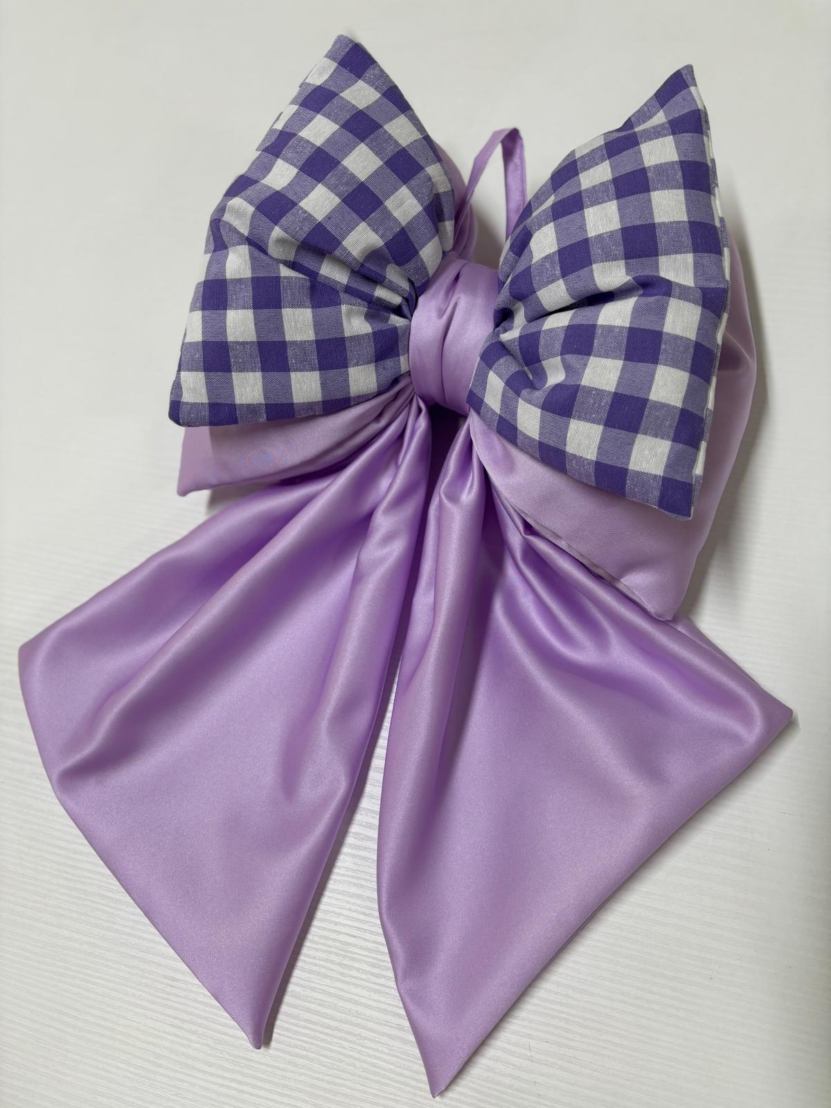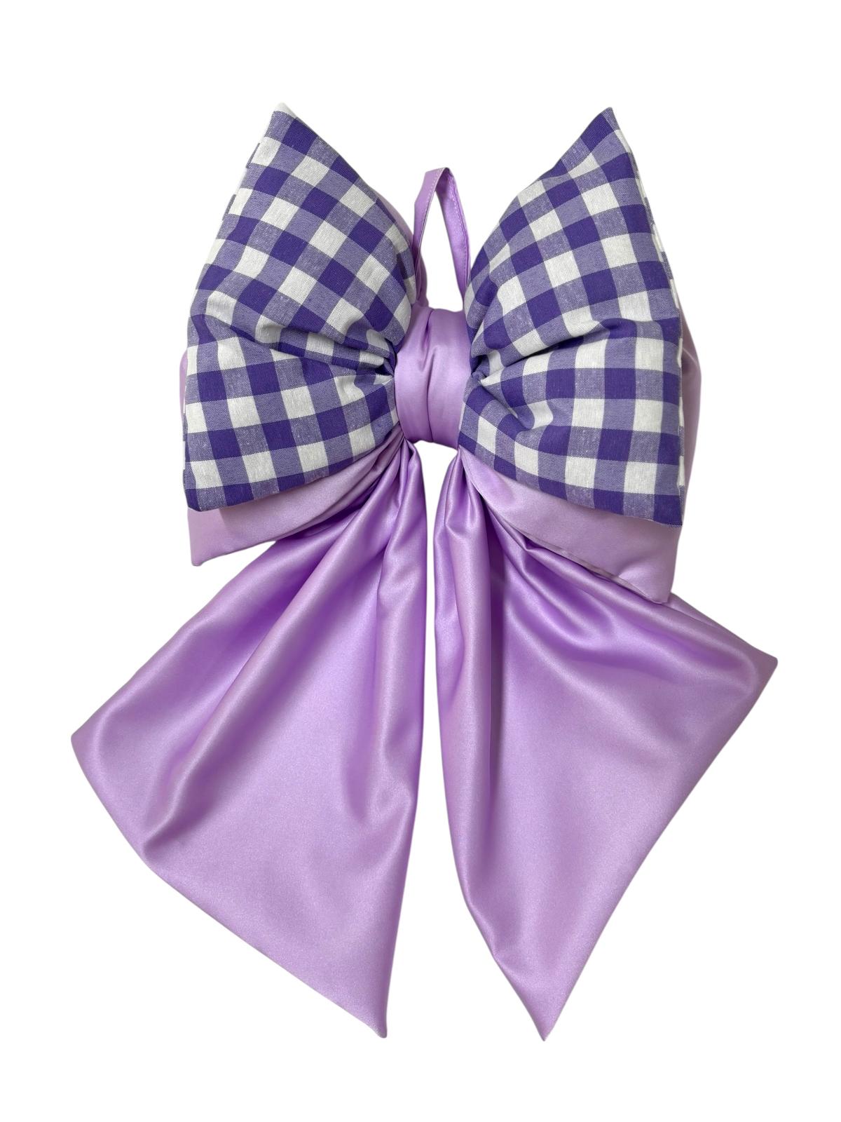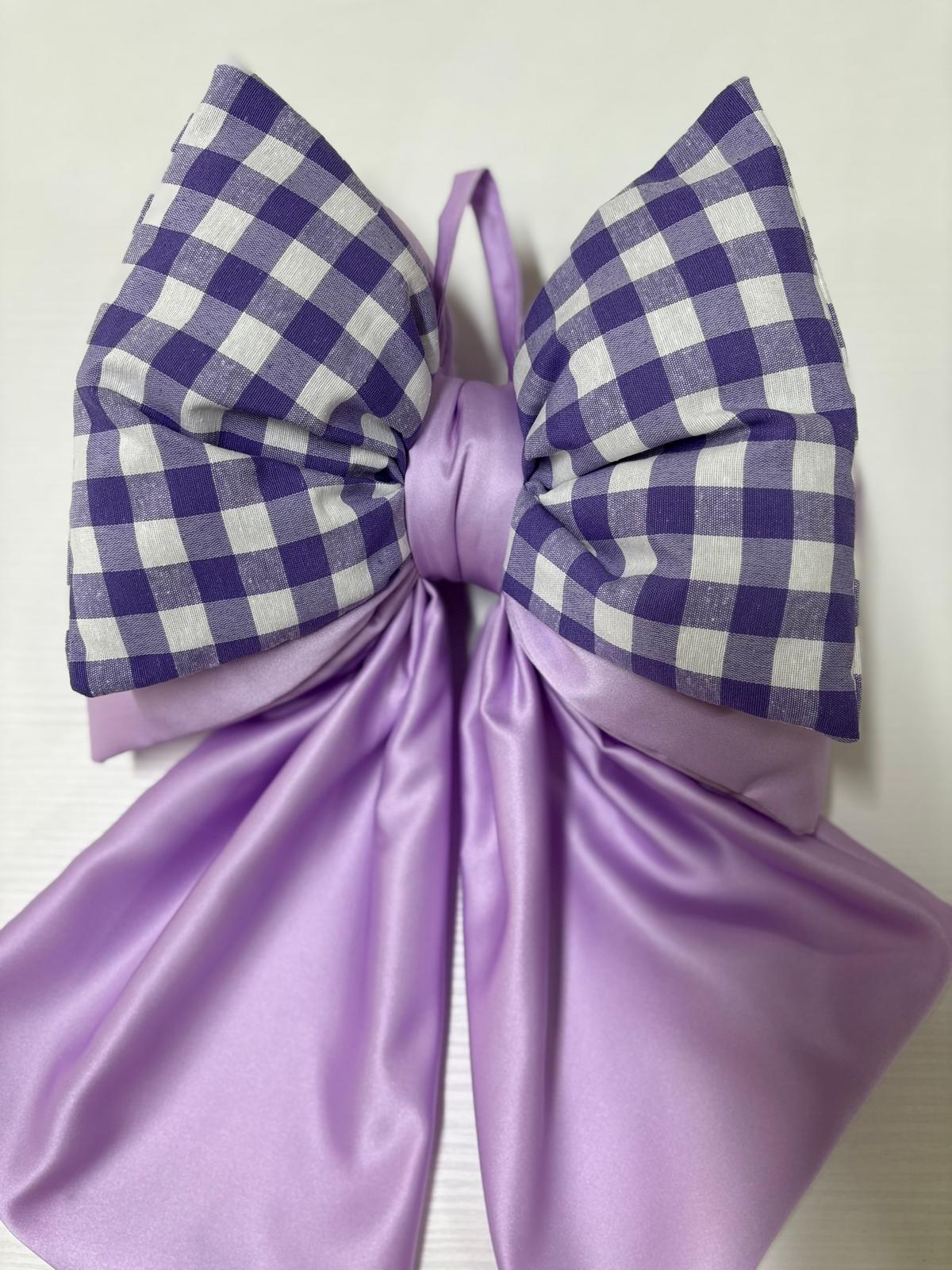 Fiocco glicine in raso con fiocco superiore in cotone a quadretti viola e panna.