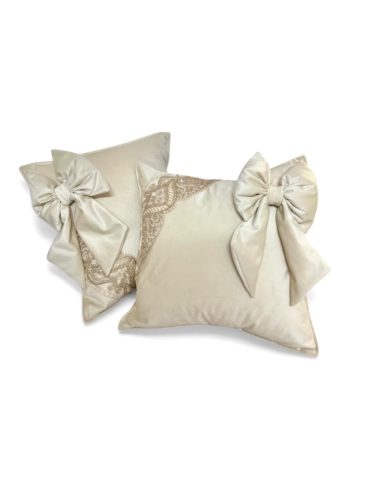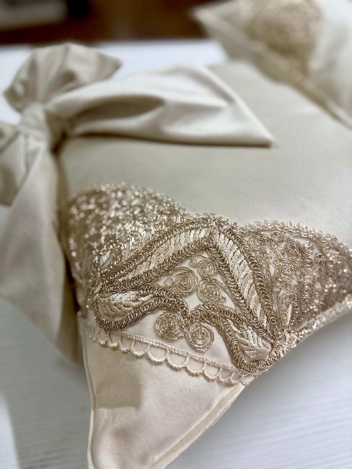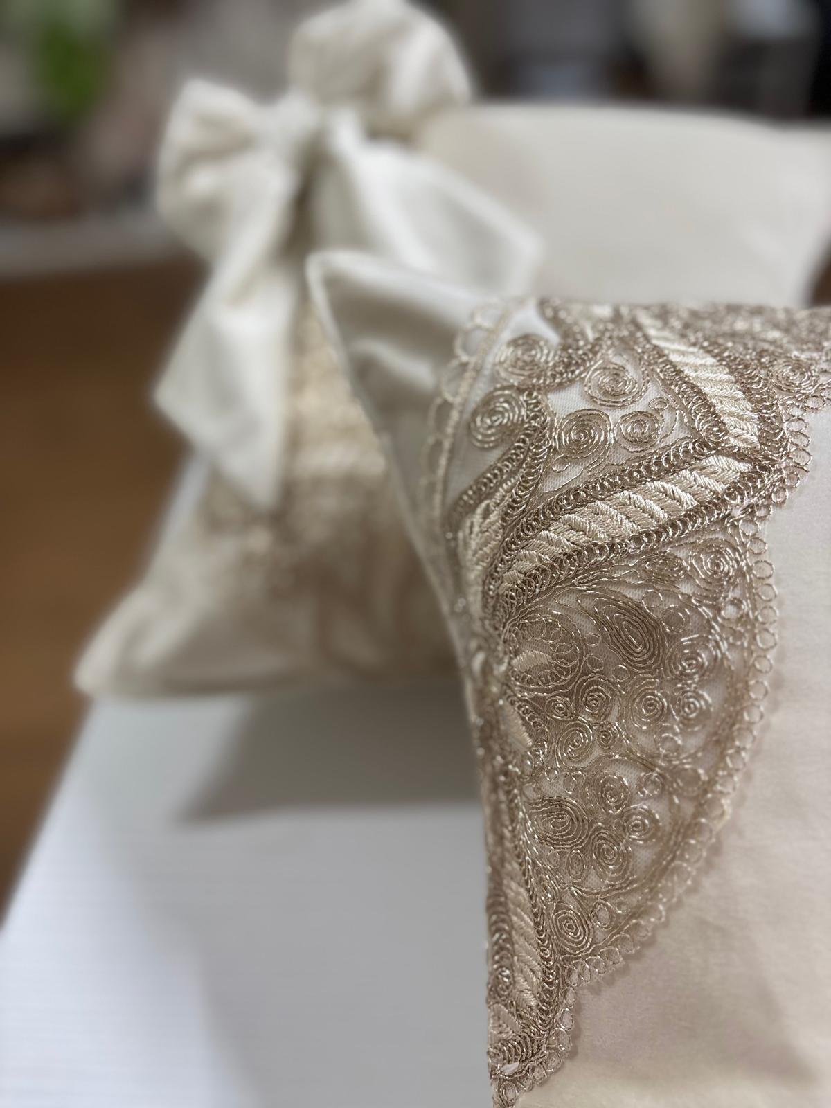 2 cuscini in velluto avorio e pizzo oro.