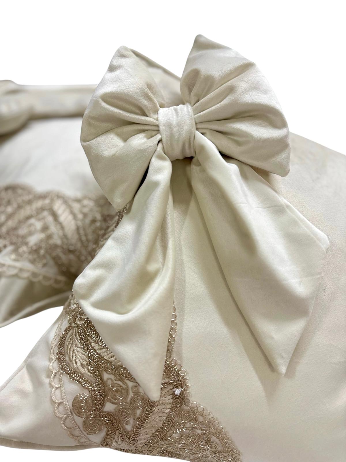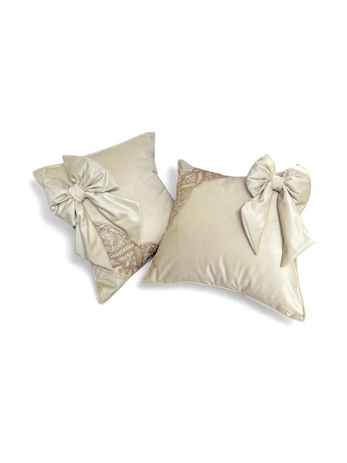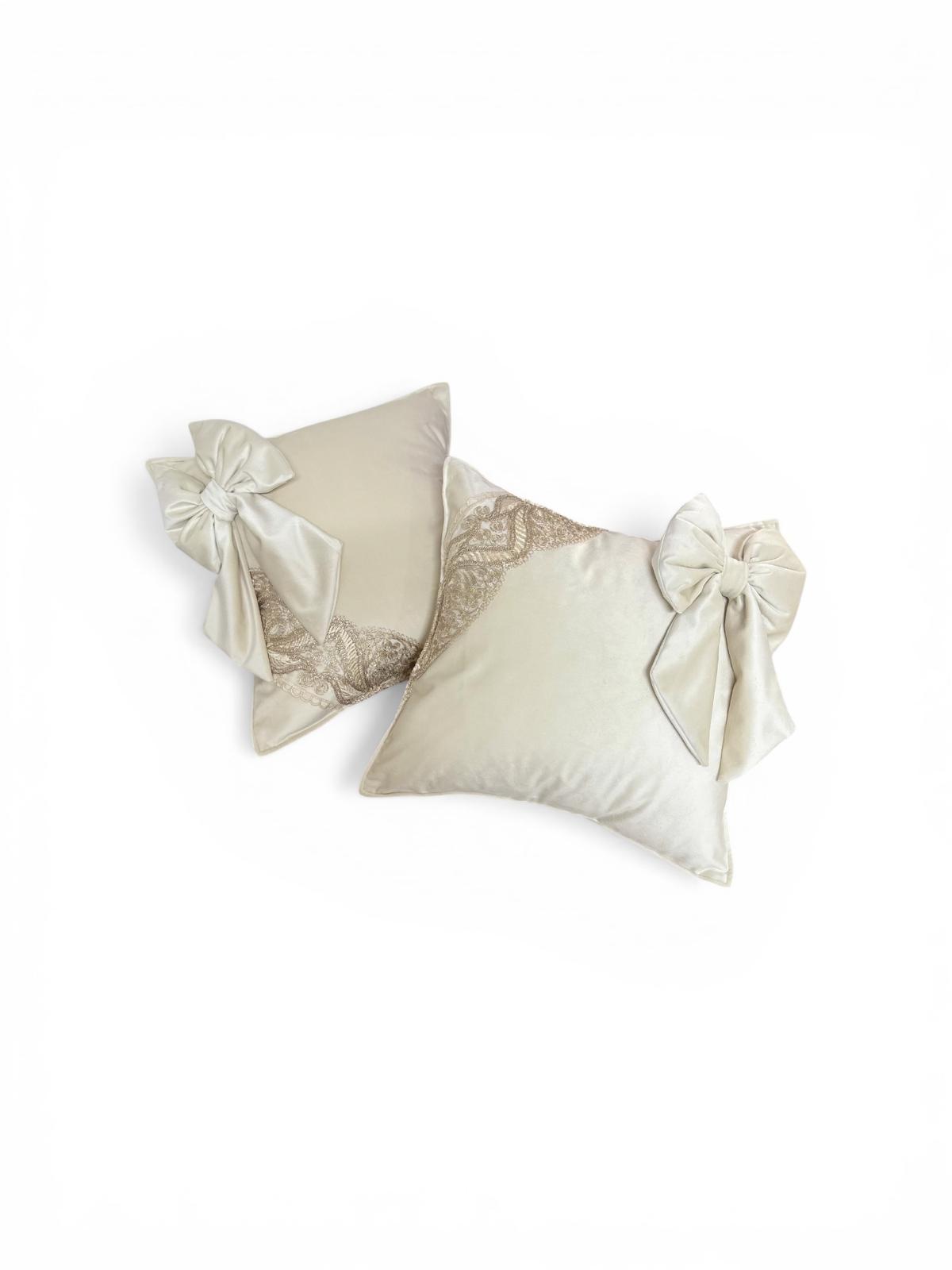 2 cuscini in velluto avorio e pizzo oro.