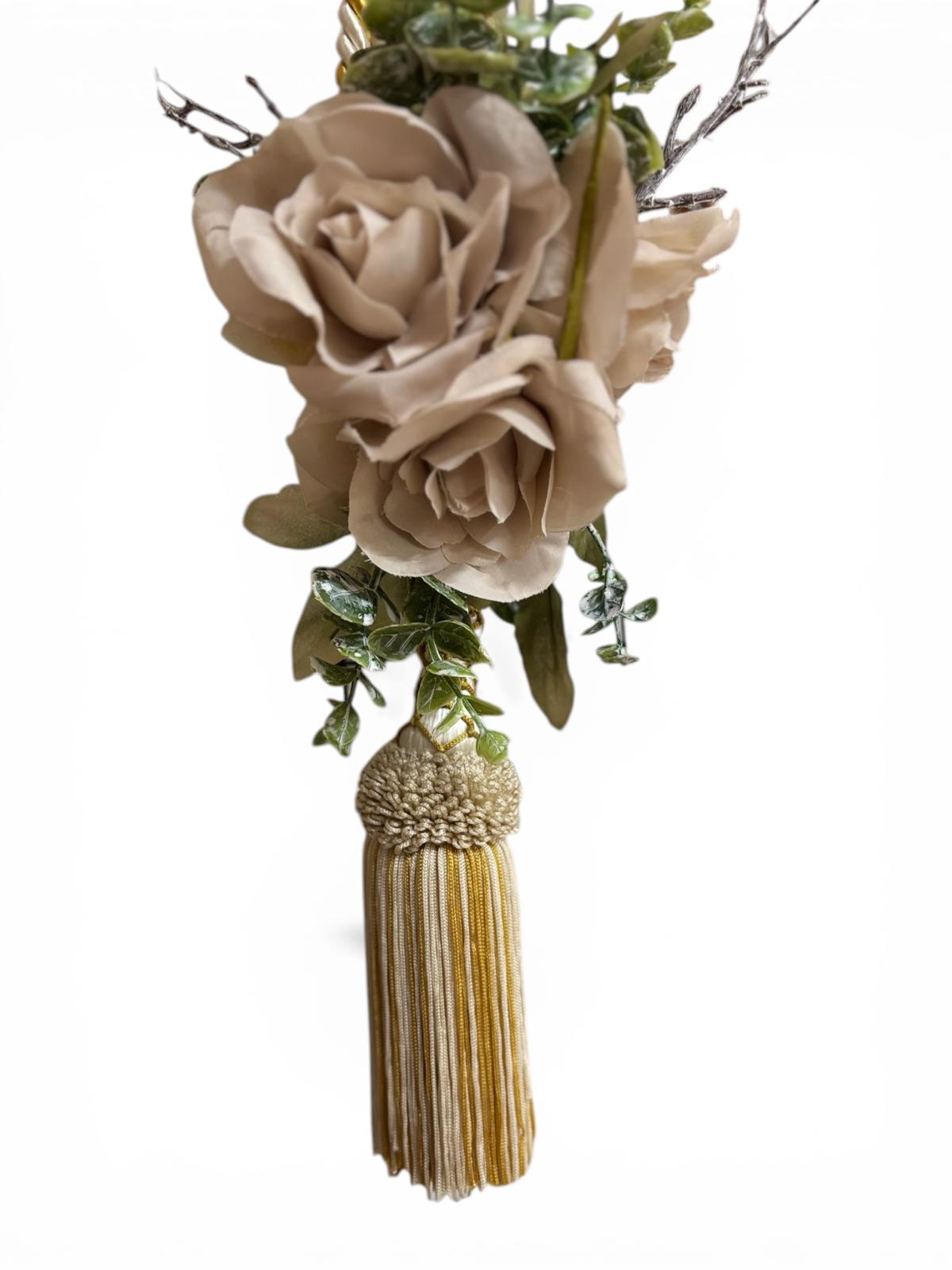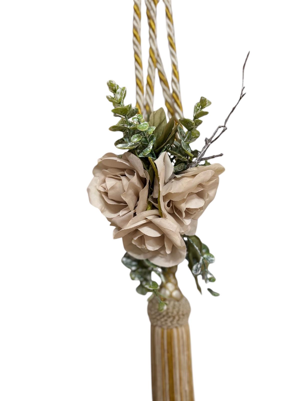 Embrasse per tende oro e bianco con rose tortora. Lavorazione artigianale.