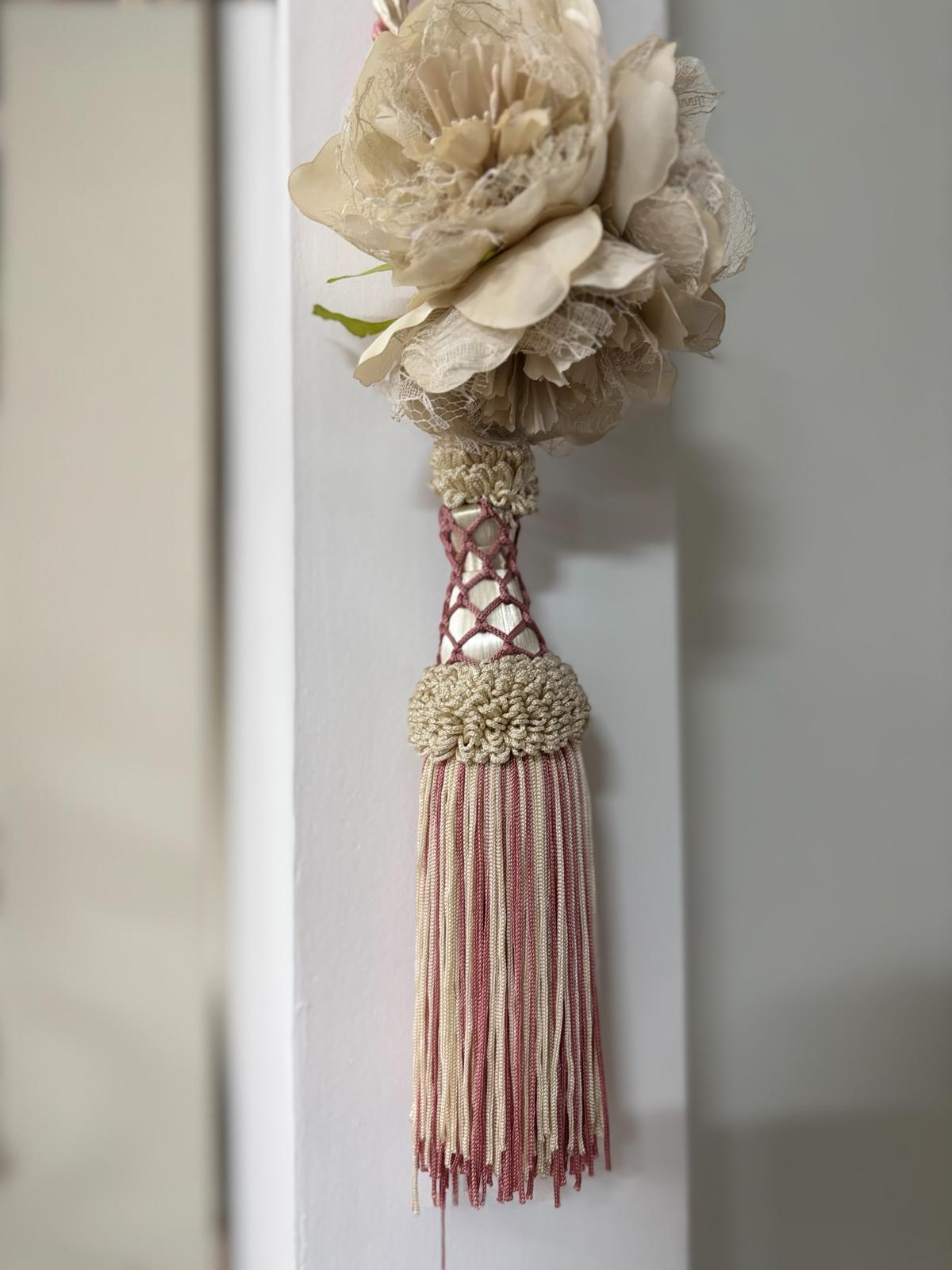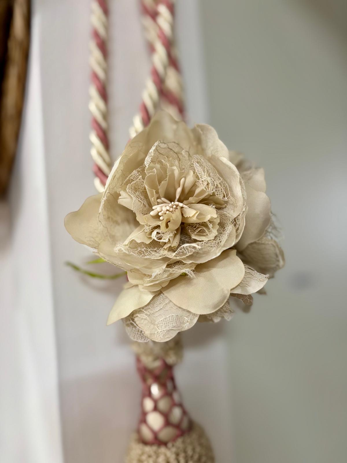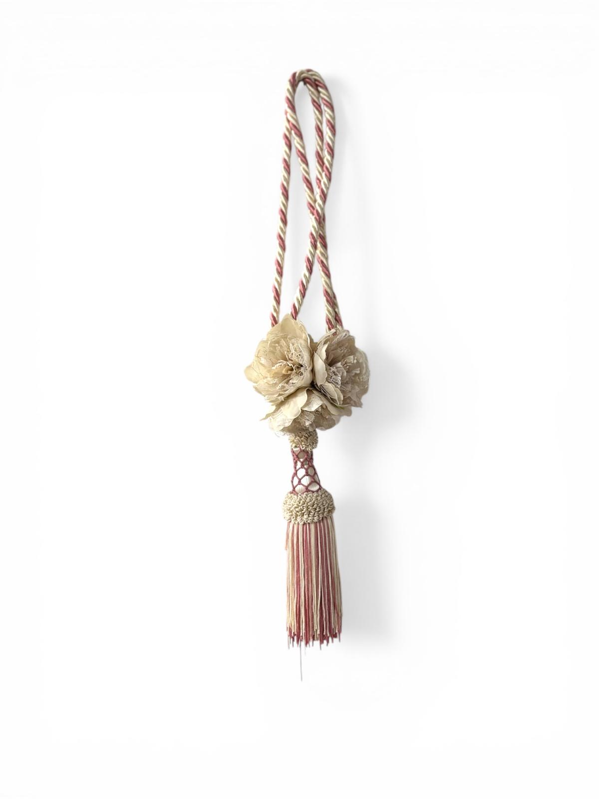 Embrasse per tende bianco e rosa con fiori. Lavorazione artigianale.