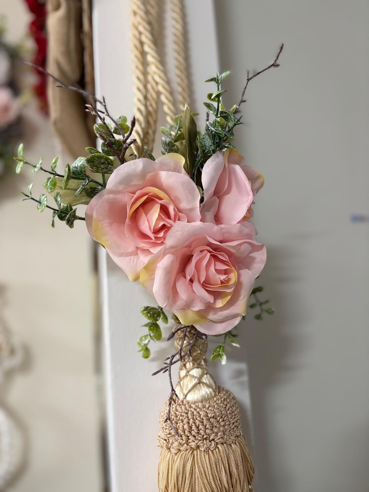 Embrasse per tende avorio con rose rosa. Lavorazione artigianale.