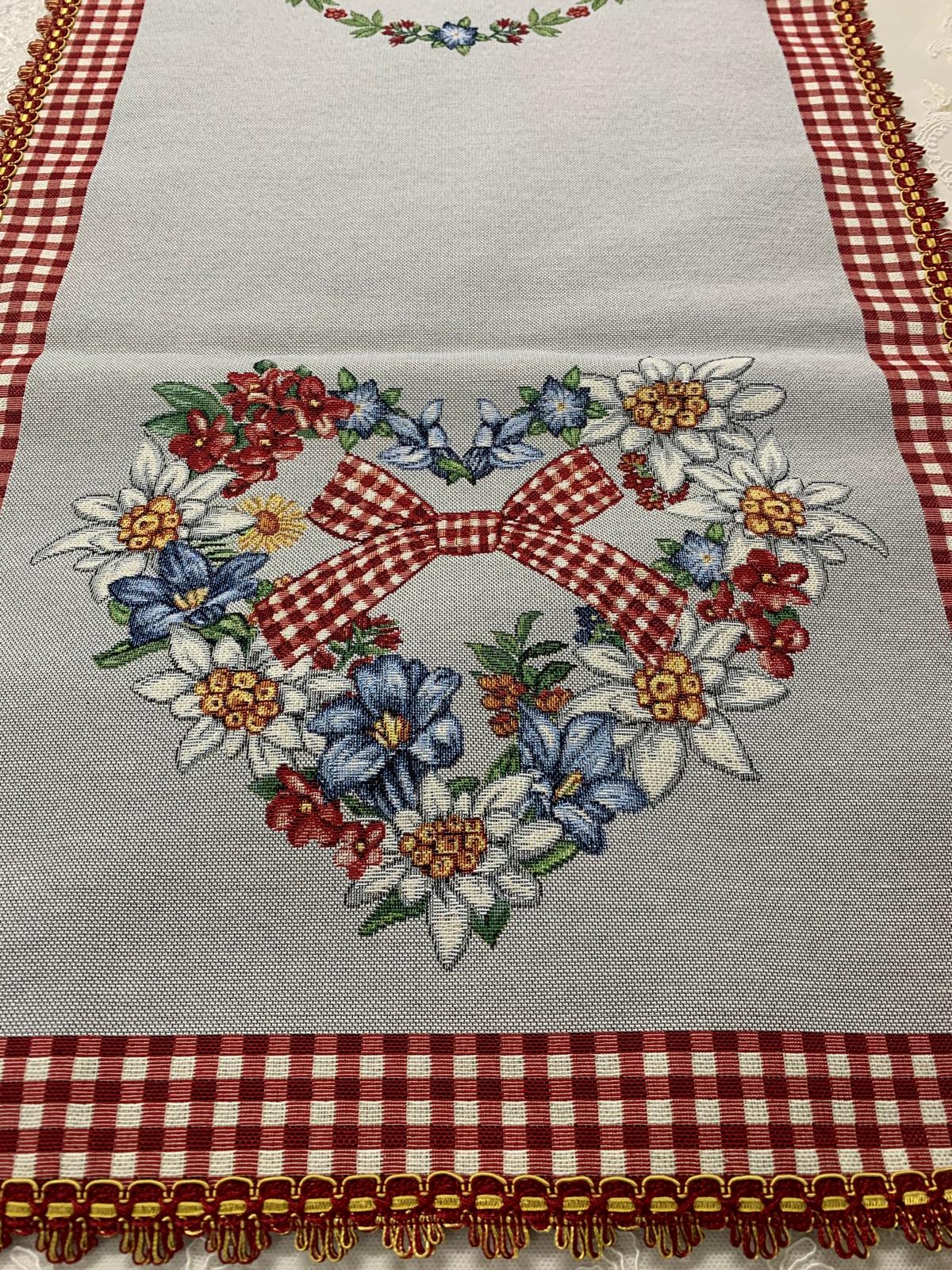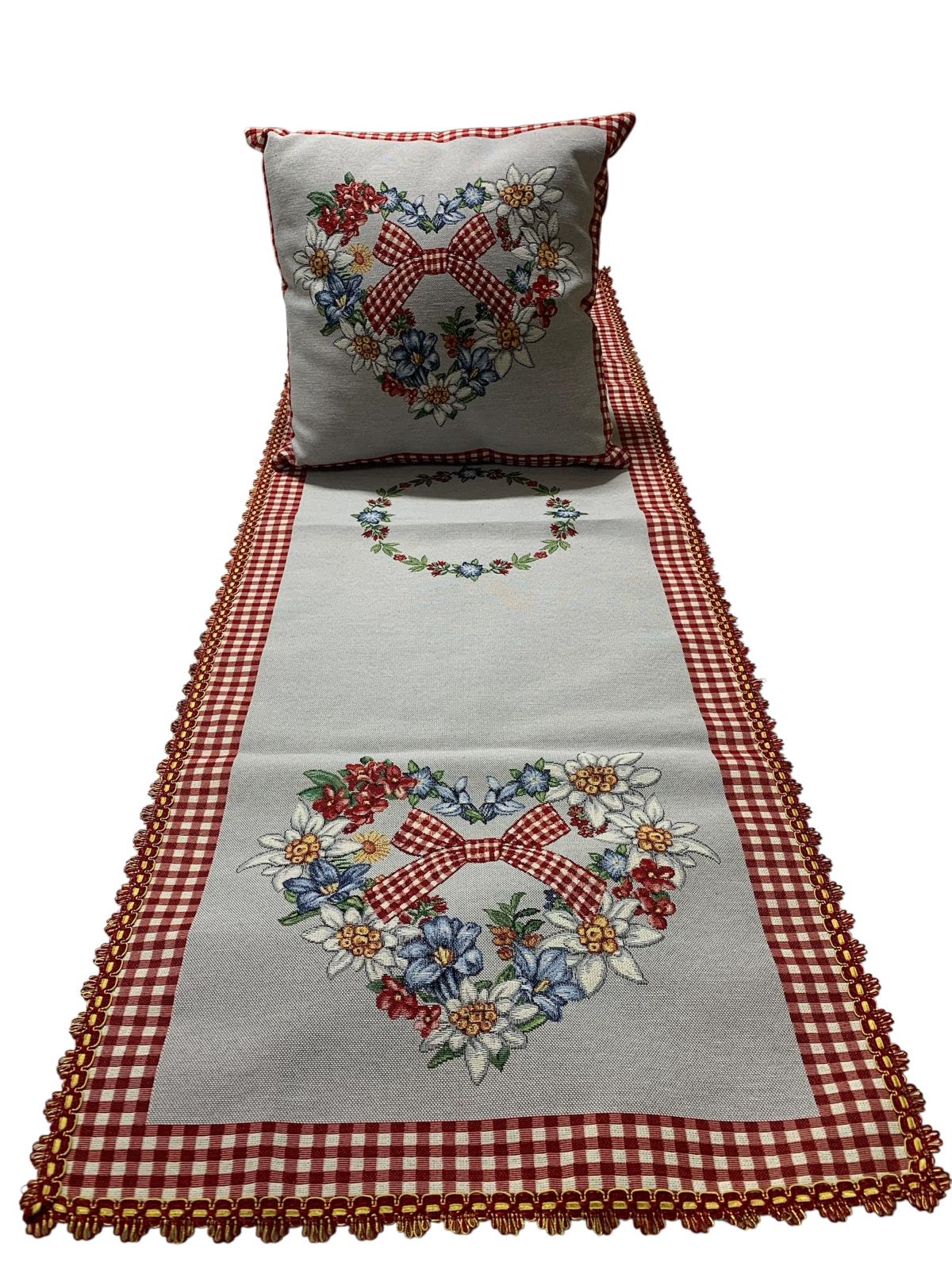 Runner con cuscino abbinato rifinito con passamaneria rosso e oro.