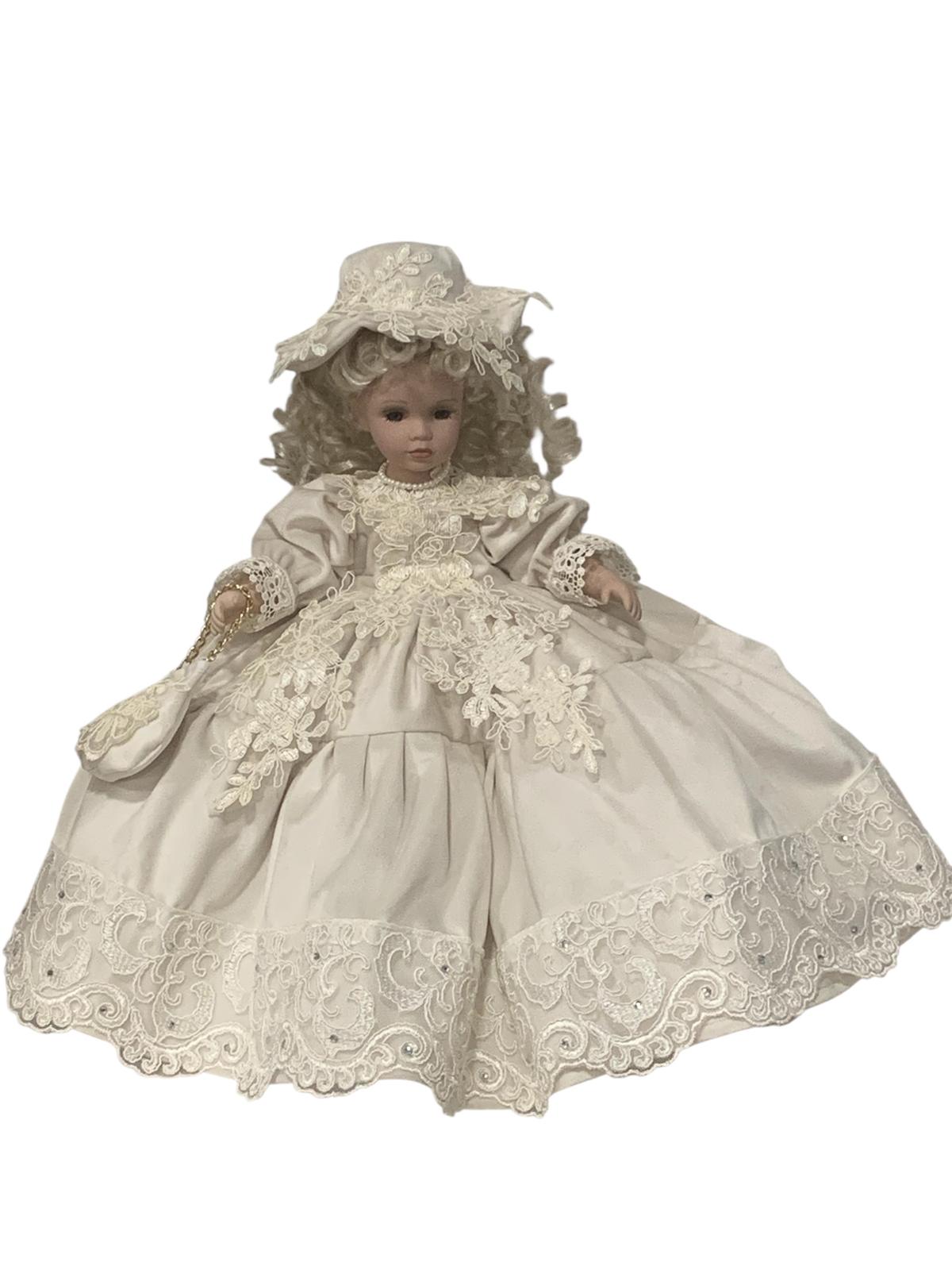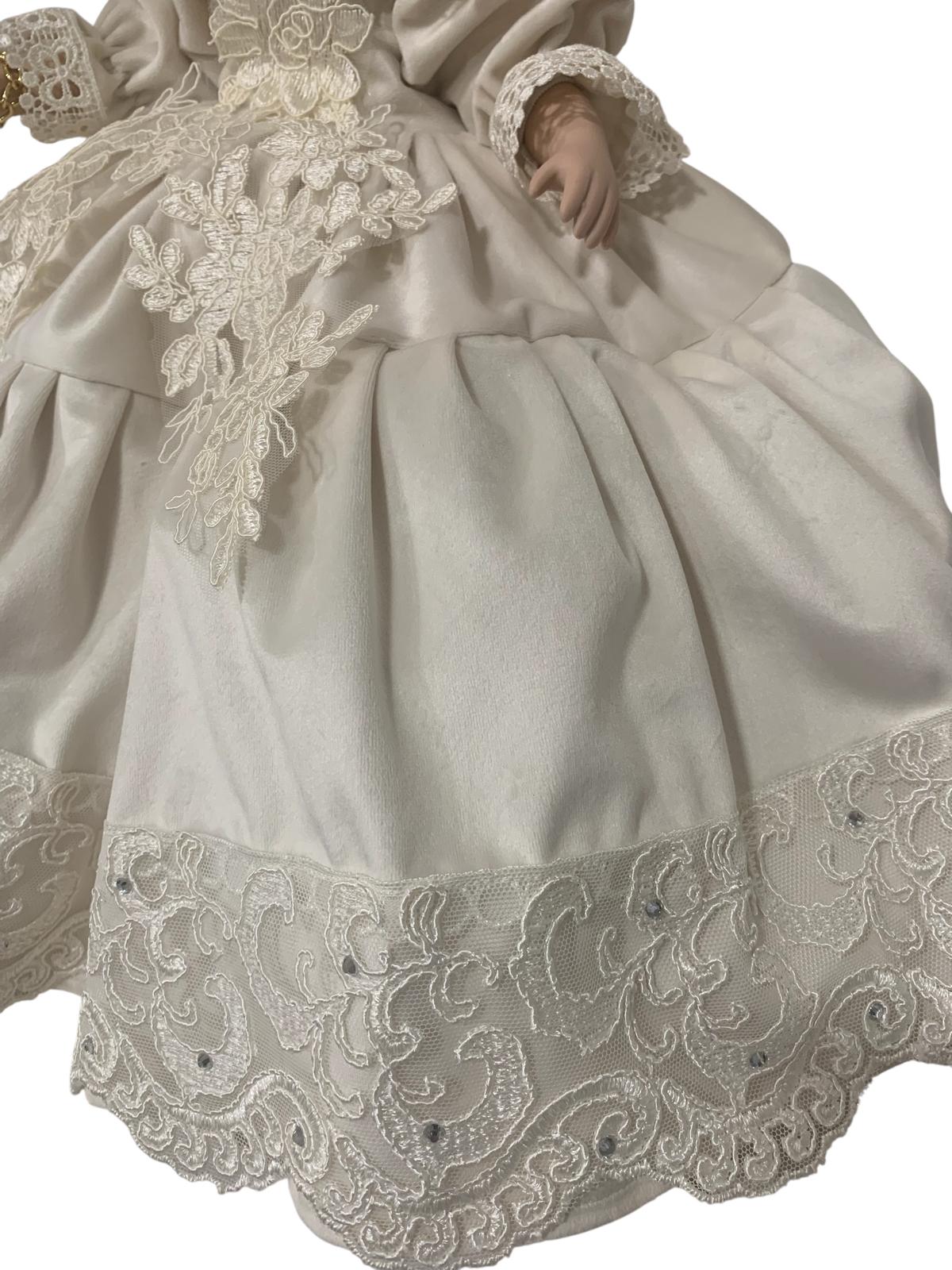 Bambola in porcellana con vestito stile 800 in velluto in cotone avorio rifinita con pizzi pregiati di nostra produzione .
