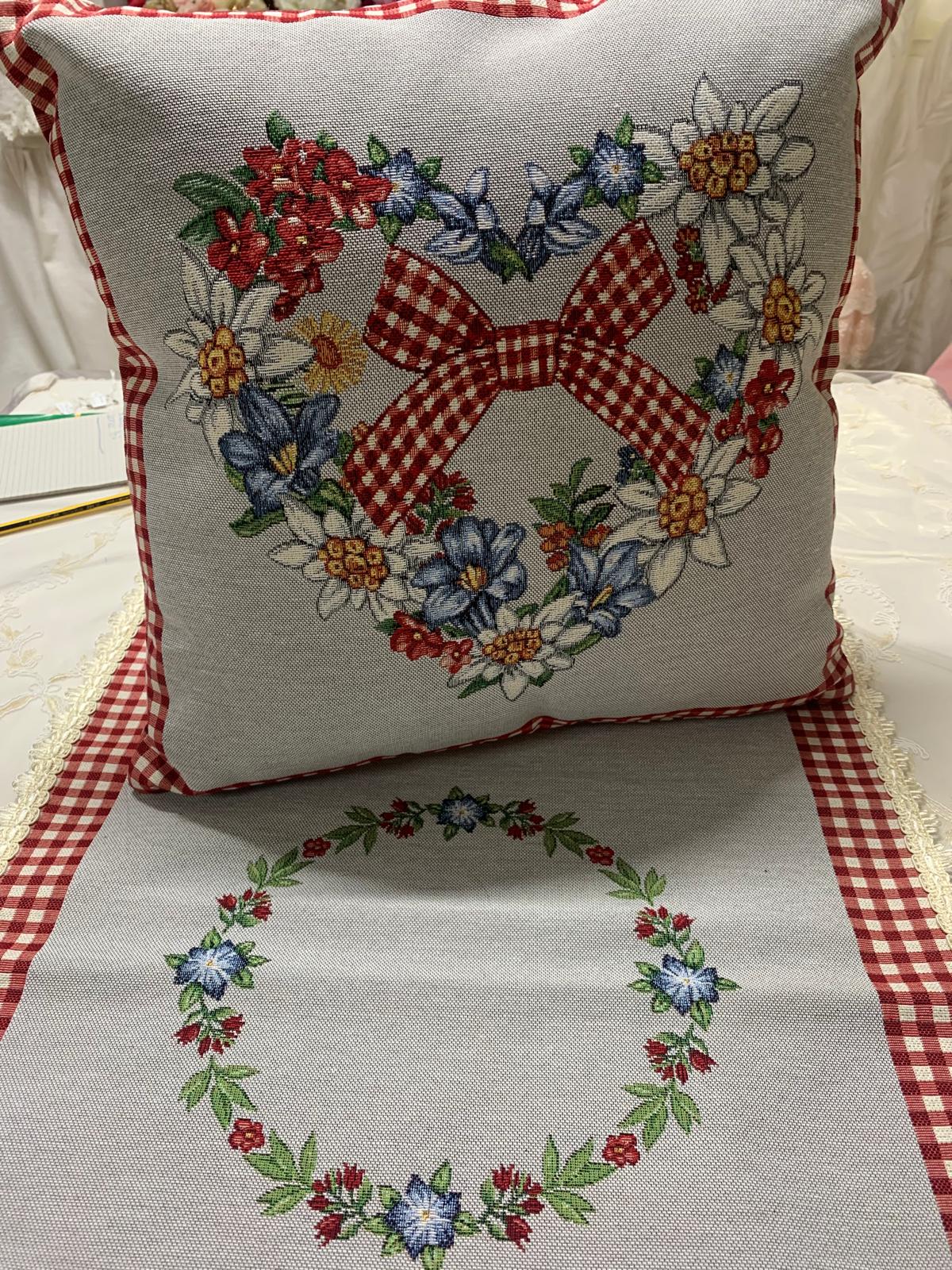 Runner con cuscino abbinato rifinito con passamaneria avorio.
