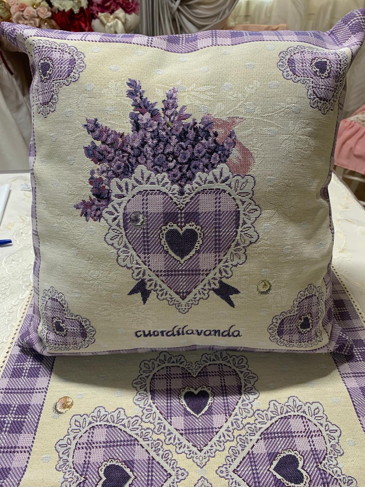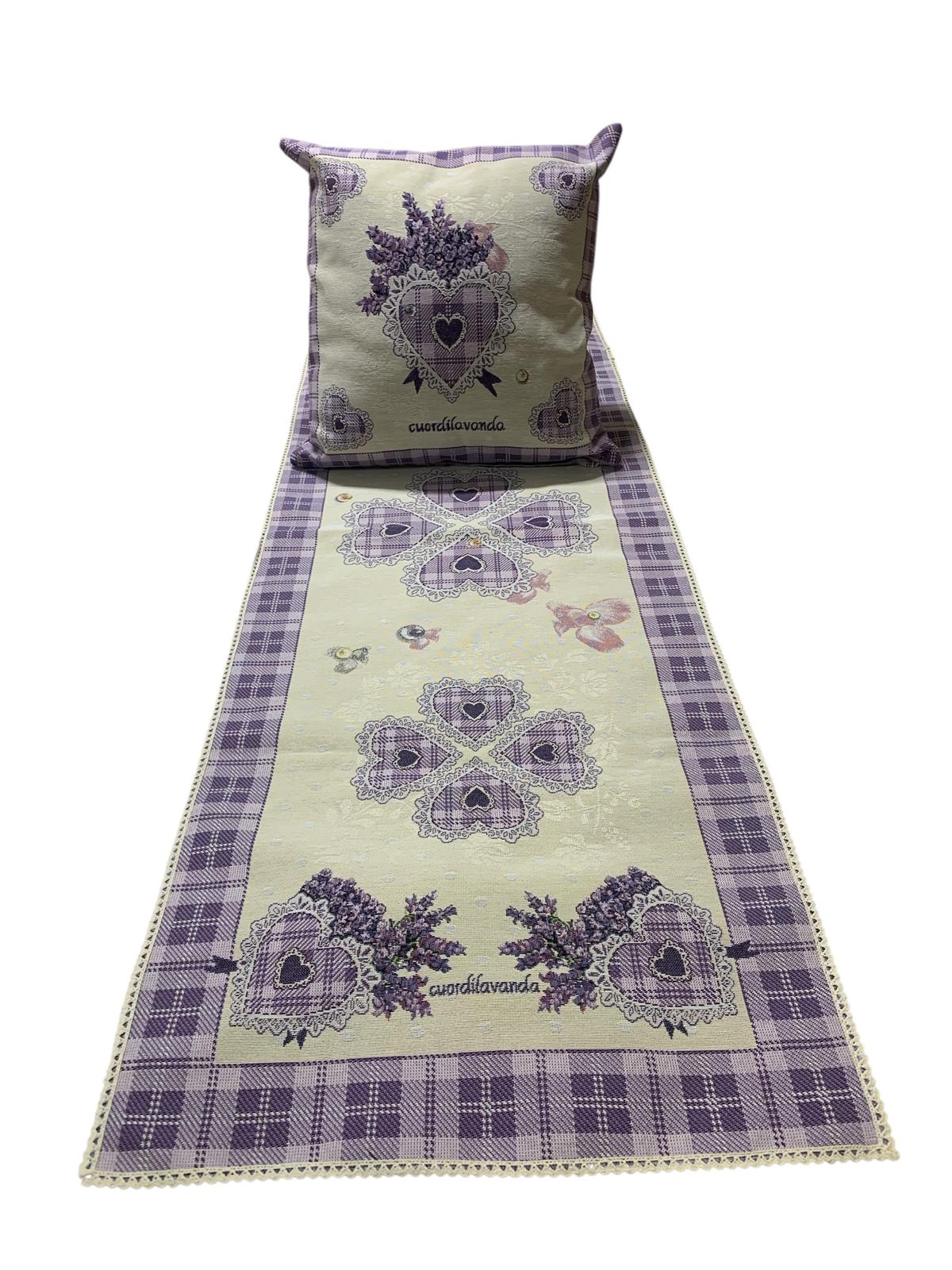 Runner con cuscino abbinato rifinito con pizzo tombolo.