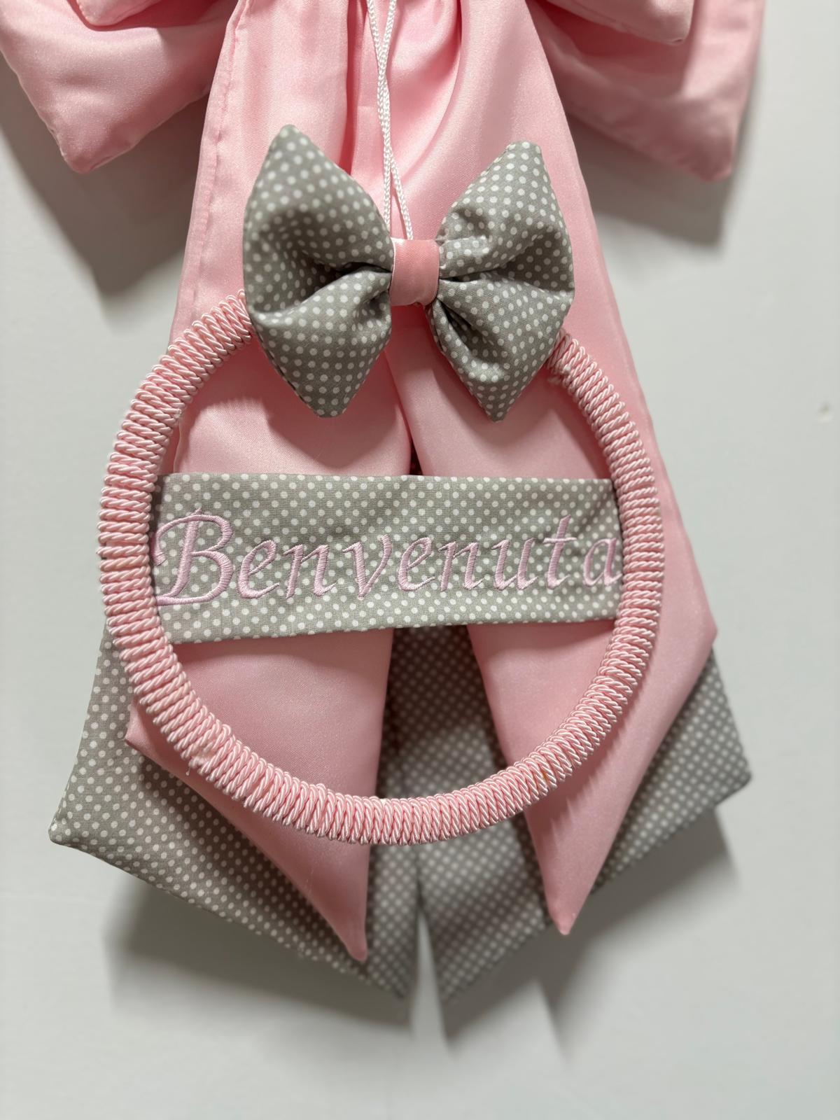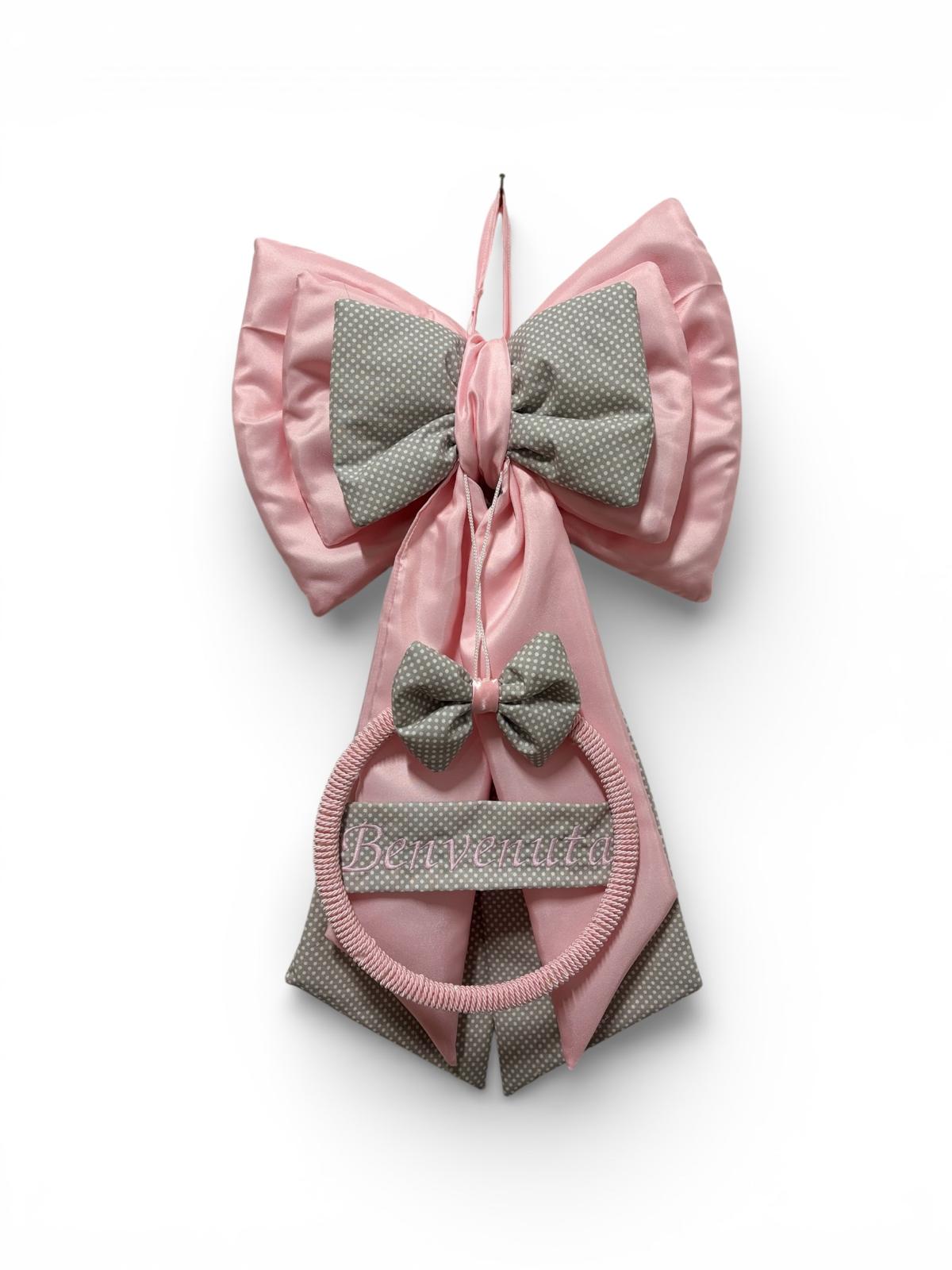 Coccarda nascita rosa con fiocco superiore tortora a pois bianchi.
