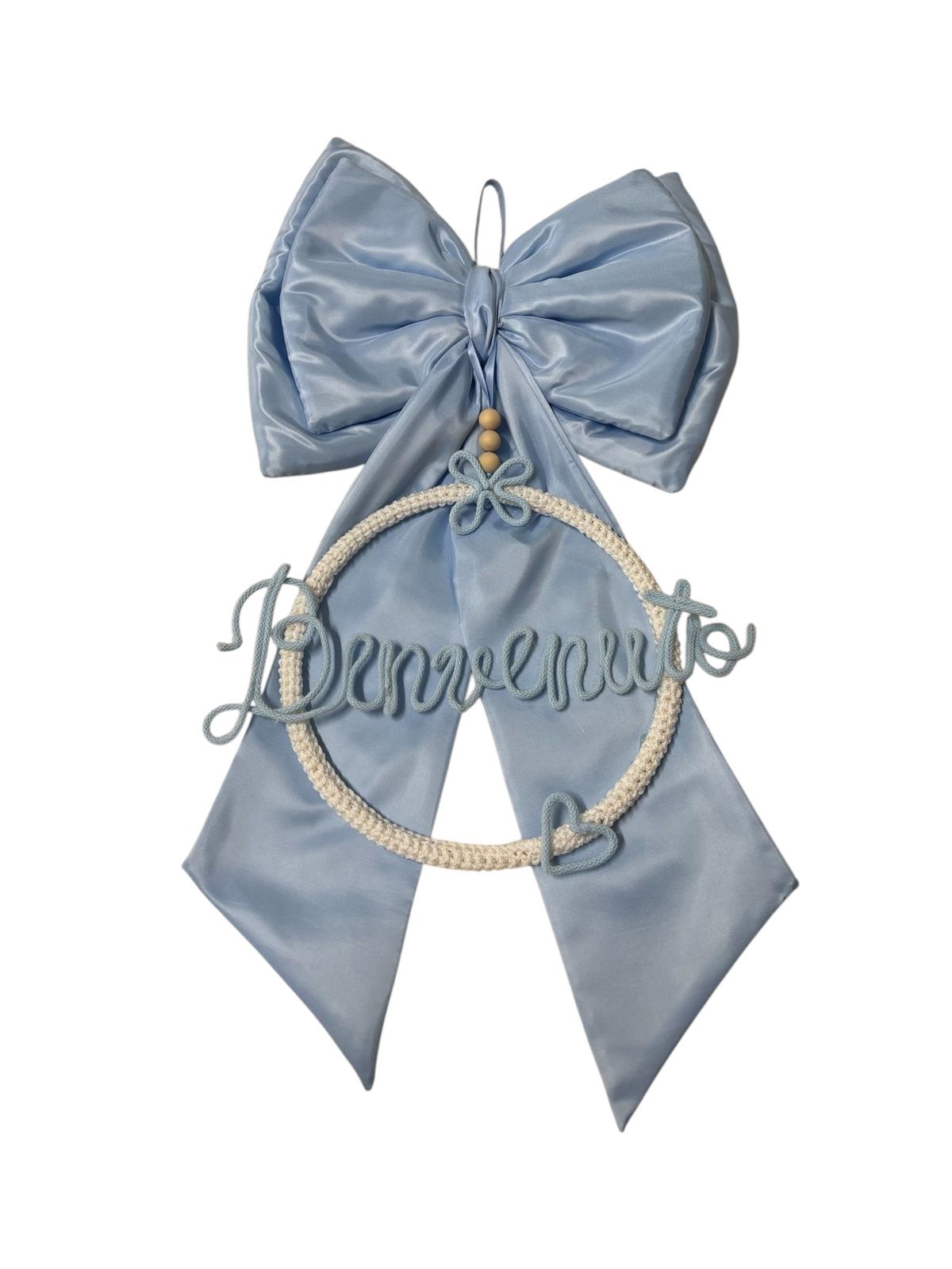 Coccarda nascita azzurra in raso decorata con scritta di benvenuto.