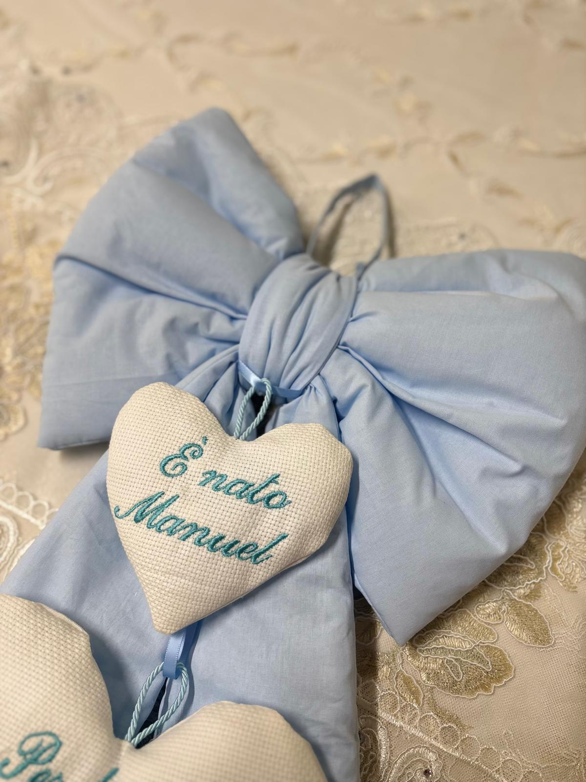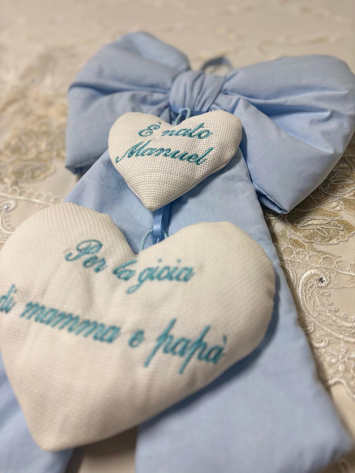 Coccarda nascita azzurra in lino con cuscinetti a forma di cuore.