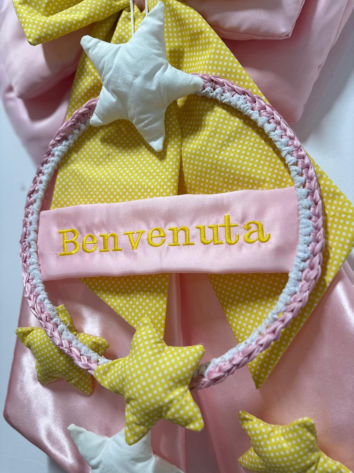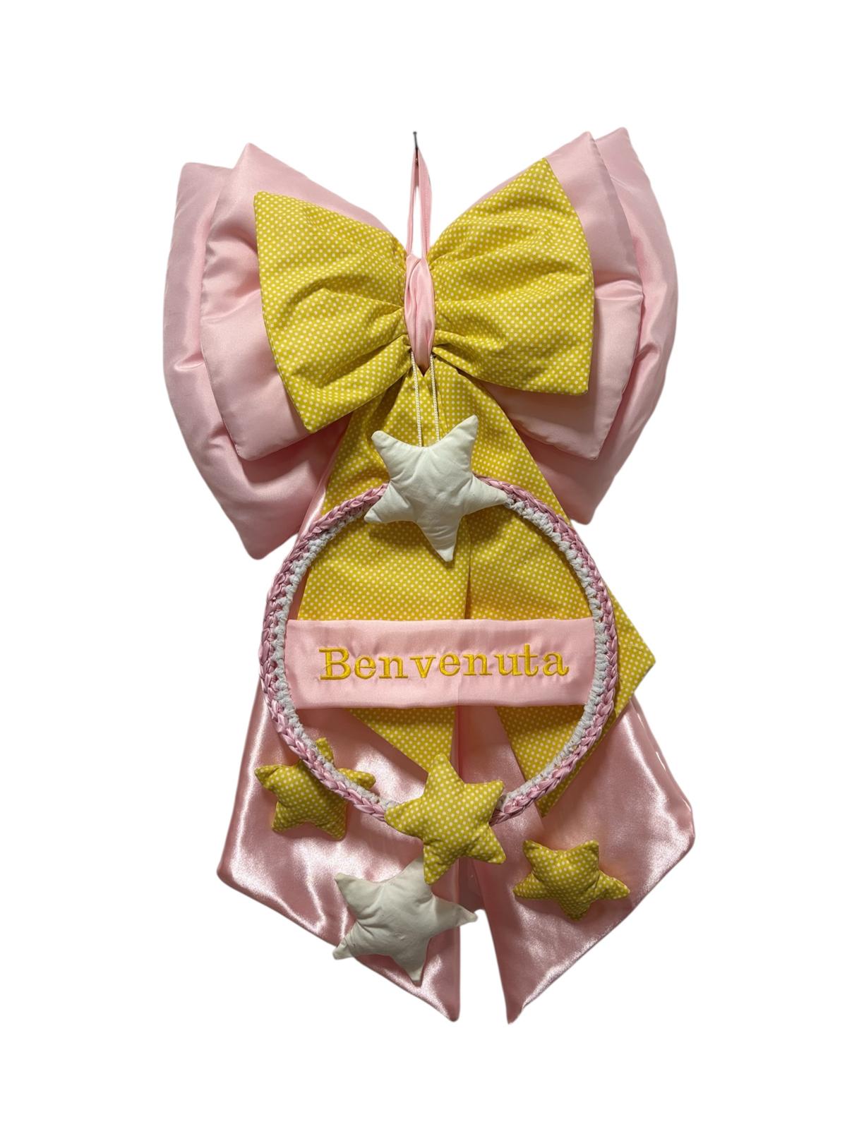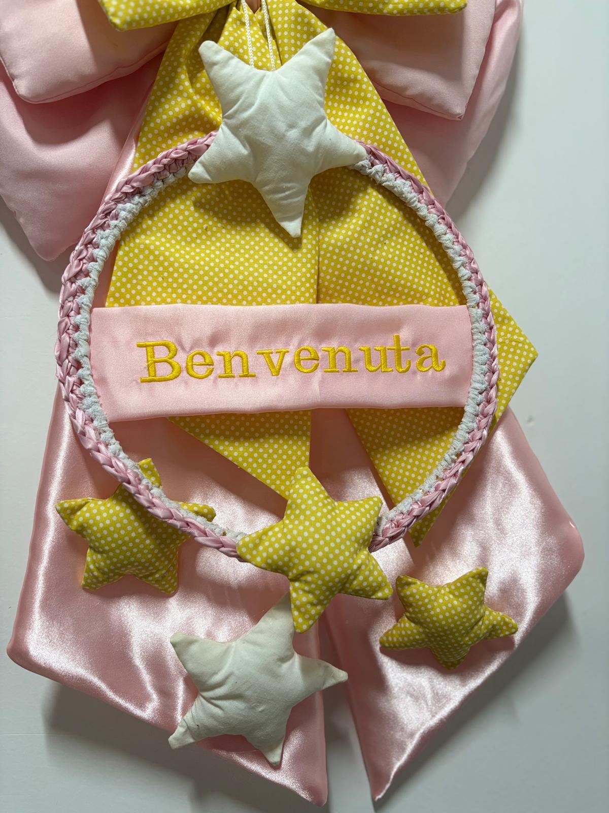 Coccarda nascita rosa e gialla decorata on stelle e scritta “Benvenuta”