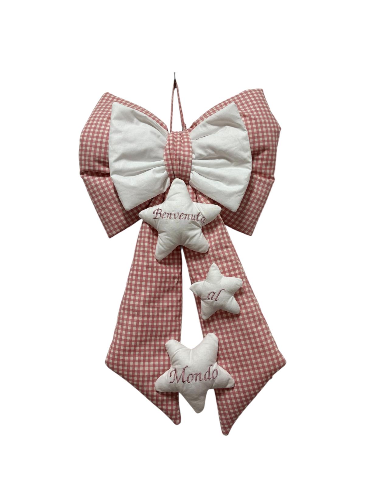 Coccarda nascita a quadretti bianchi e rossi decorata con nuvolette.