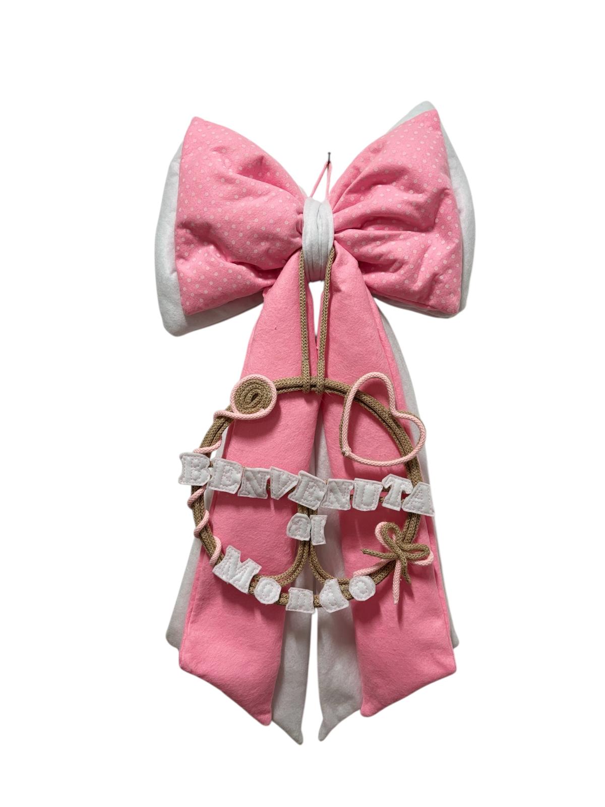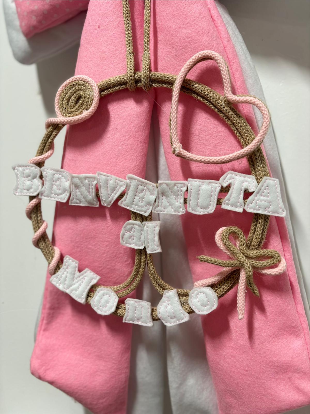 Coccarda nascita rosa e bianca in pannolenci decorata con scritta “Benvenuta al mondo”.