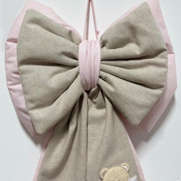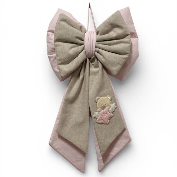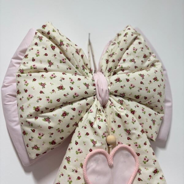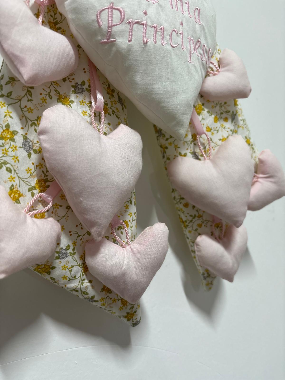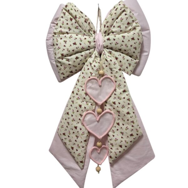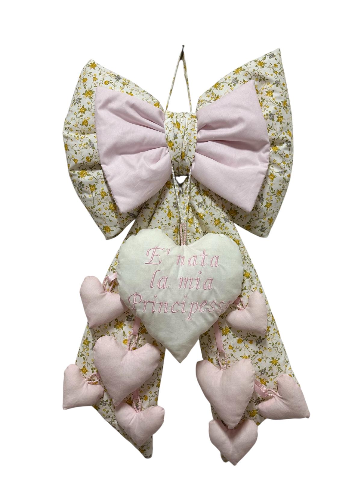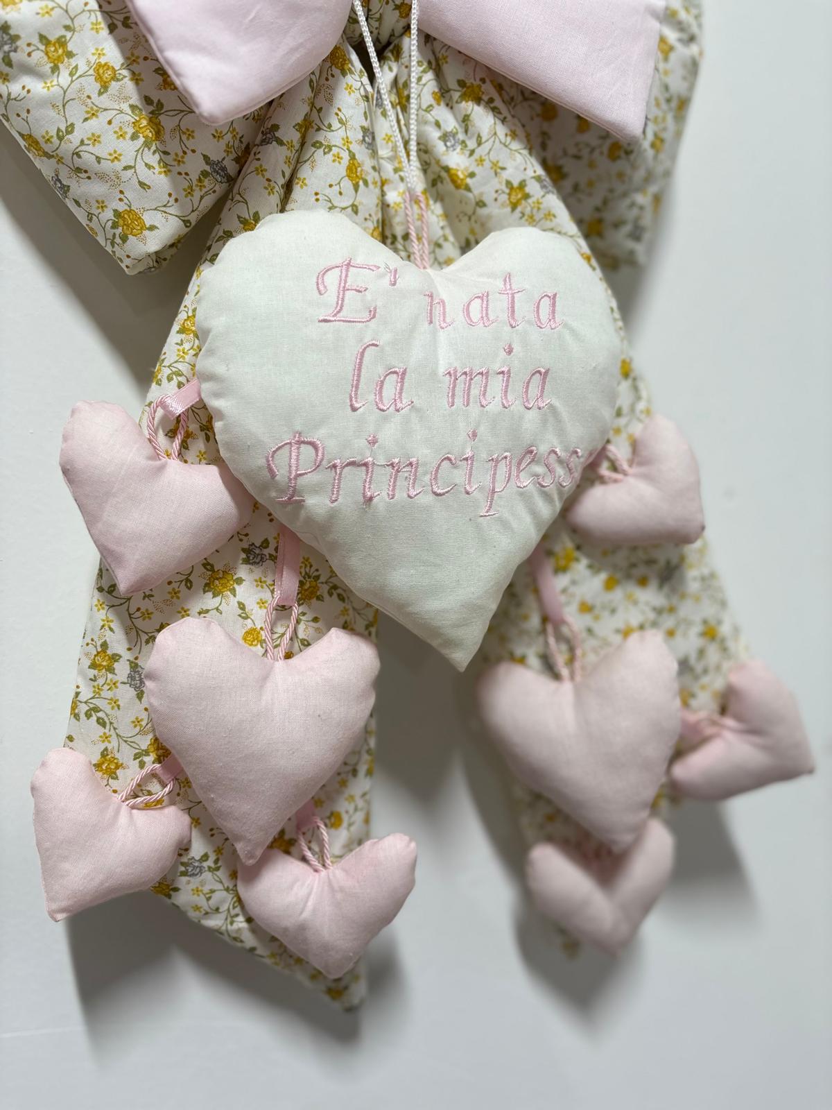 Coccarda nascita stampa floreale e rosa decorata con cuori rosa e con nuvoletta con scritta “è nata la mia principessa”.