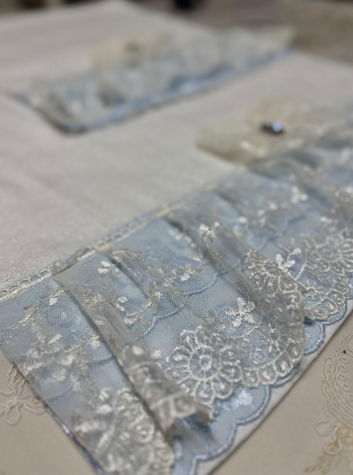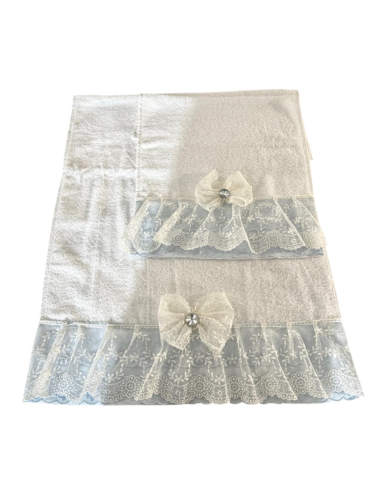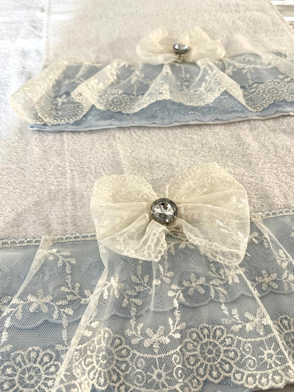 Coppia di asciugamani in spugna bianchi decorate con pizzo san gallo in celeste, pizzo bianco in tulle e fiocco in pizzo coordinato, lavorazione artigianale.