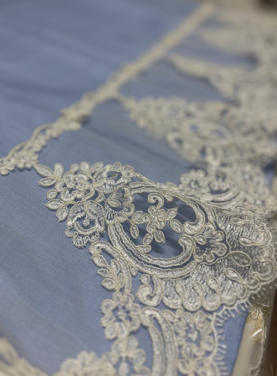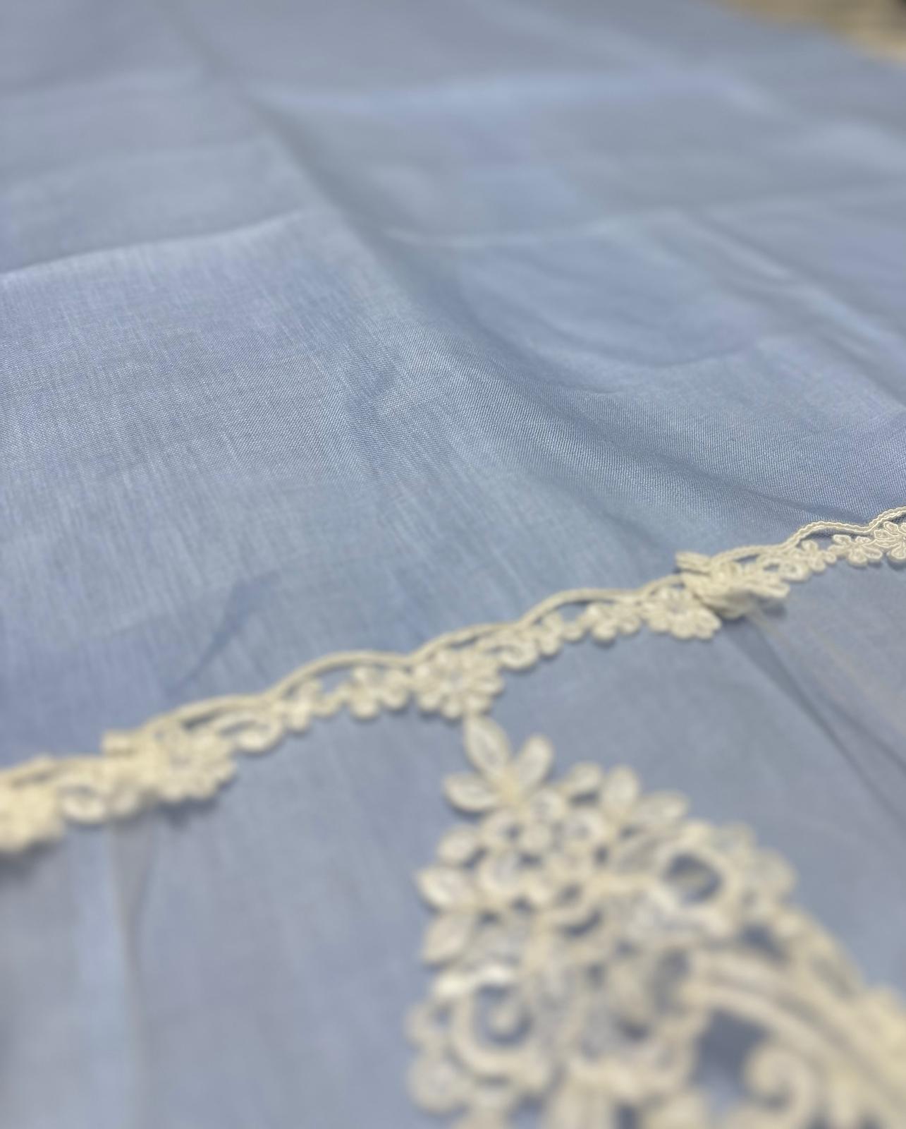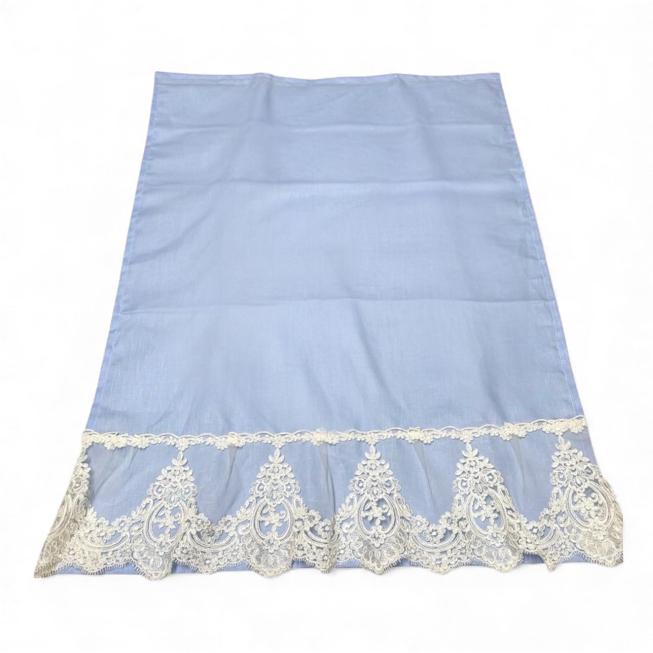 Asciugamano in puro lino celeste con pizzo bianco, lavorazione artigianale.