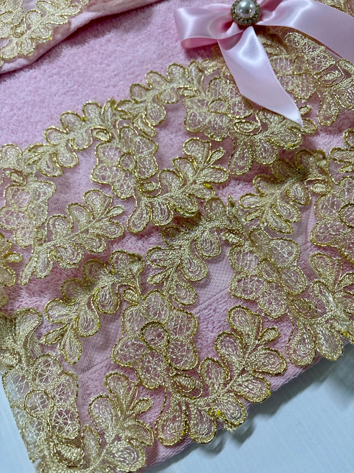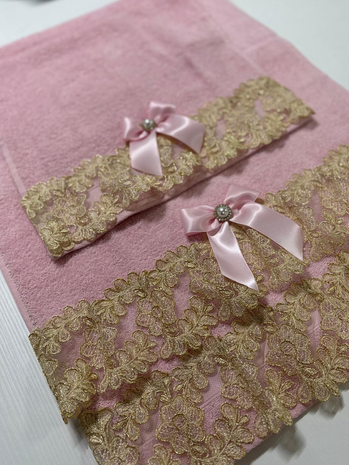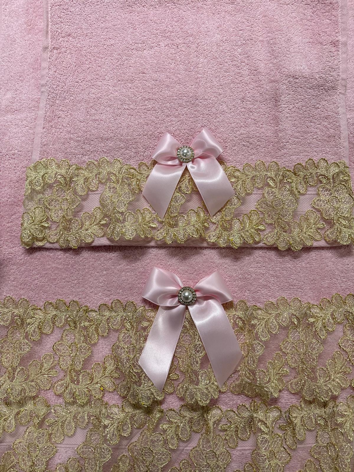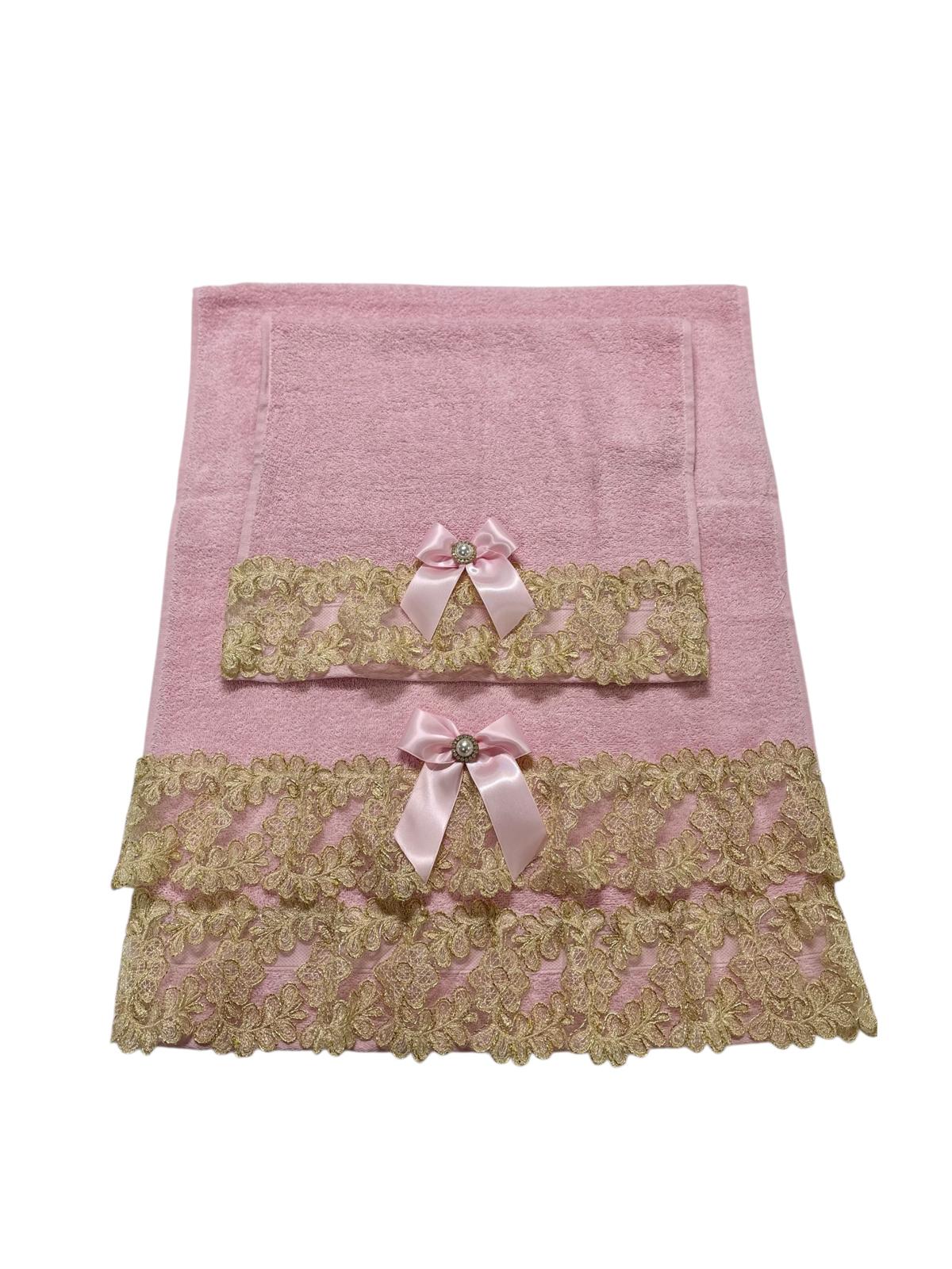Coppia di asciugamani in spugna rosa decorate con pizzo oro e fiocco in raso rosa.