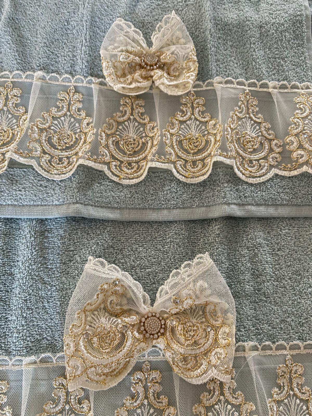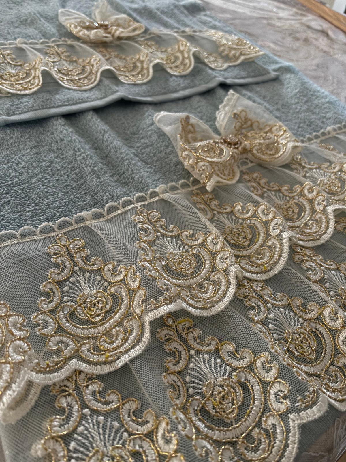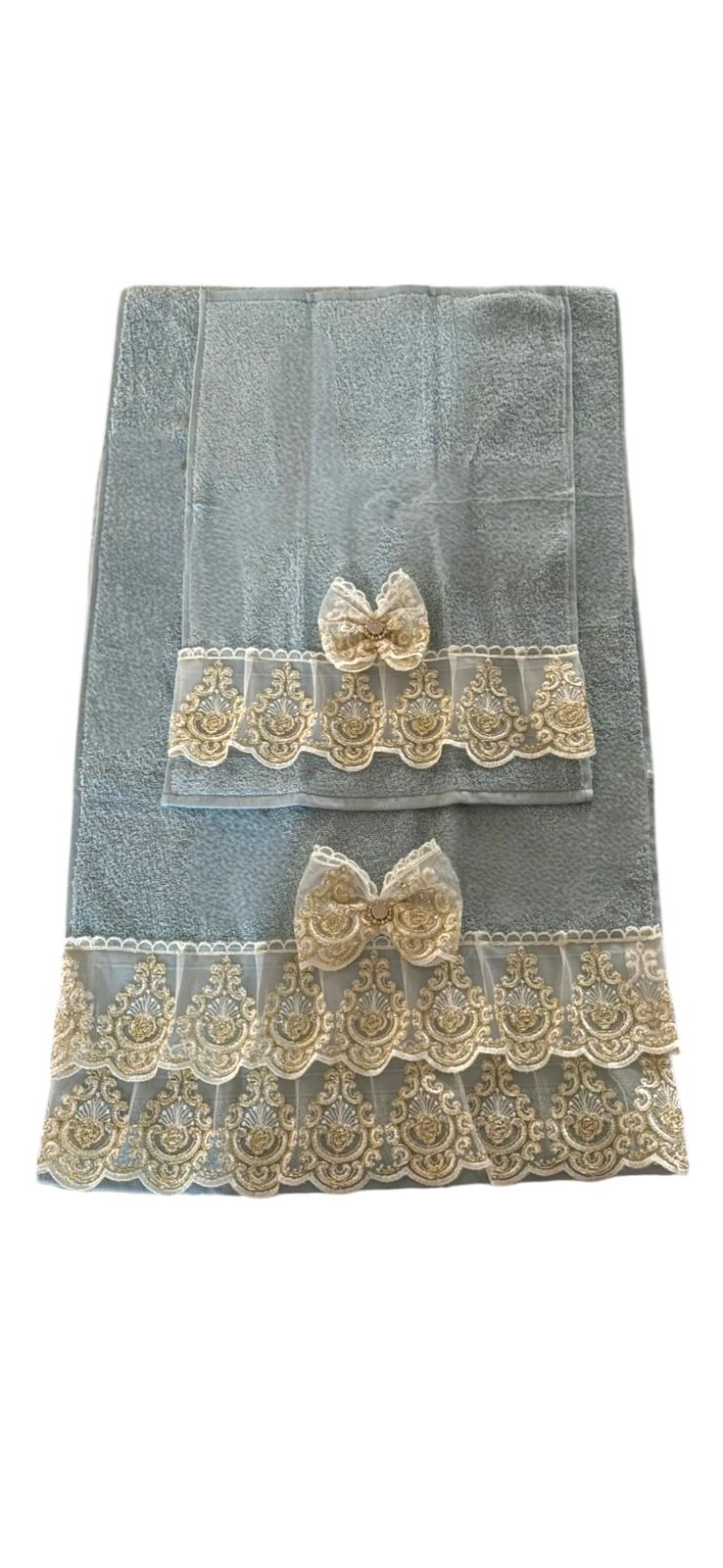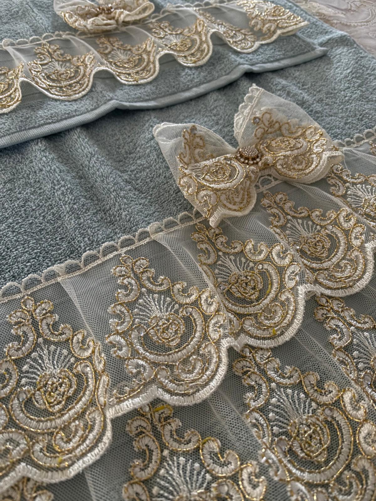 Coppia di asciugamani spugna celesti decorate con pizzo oro con swarovski e con fiocco in pizzo.
