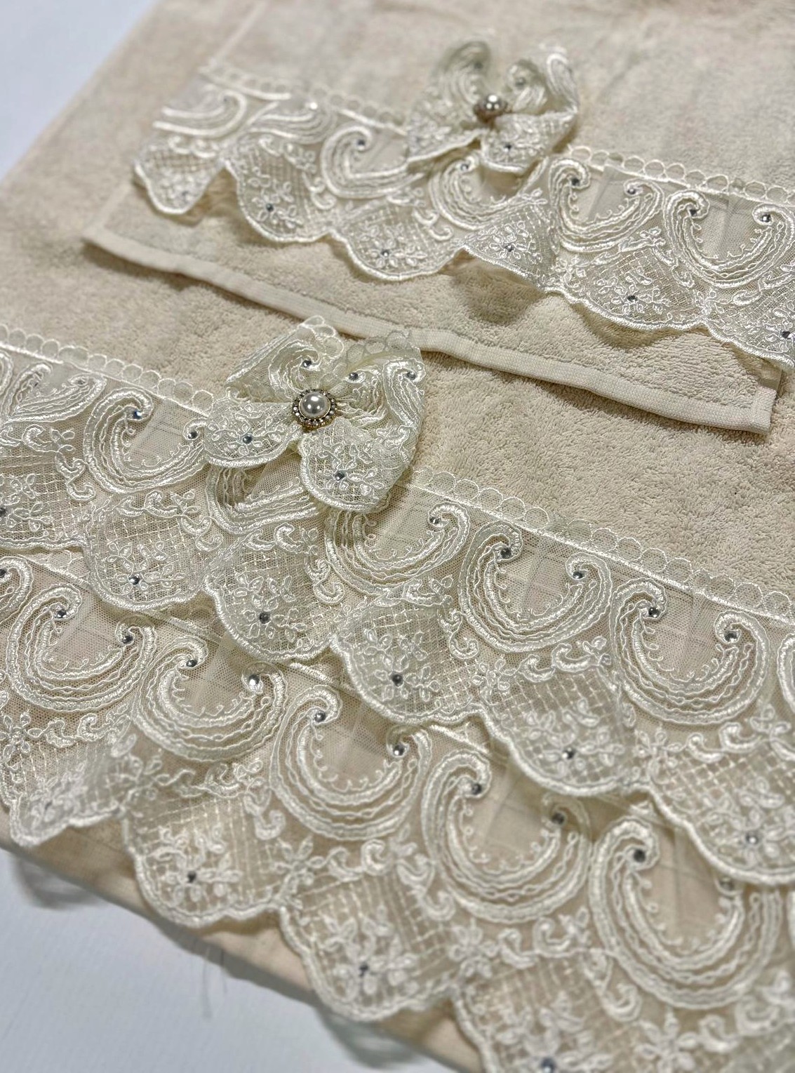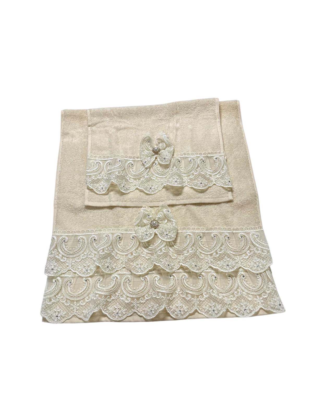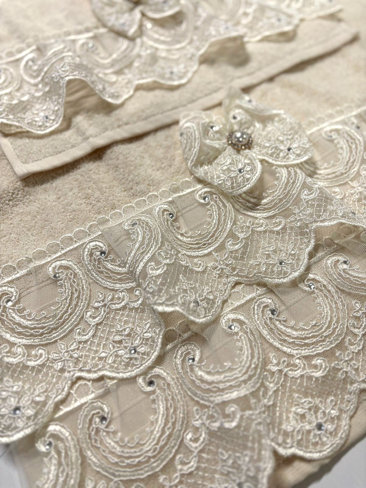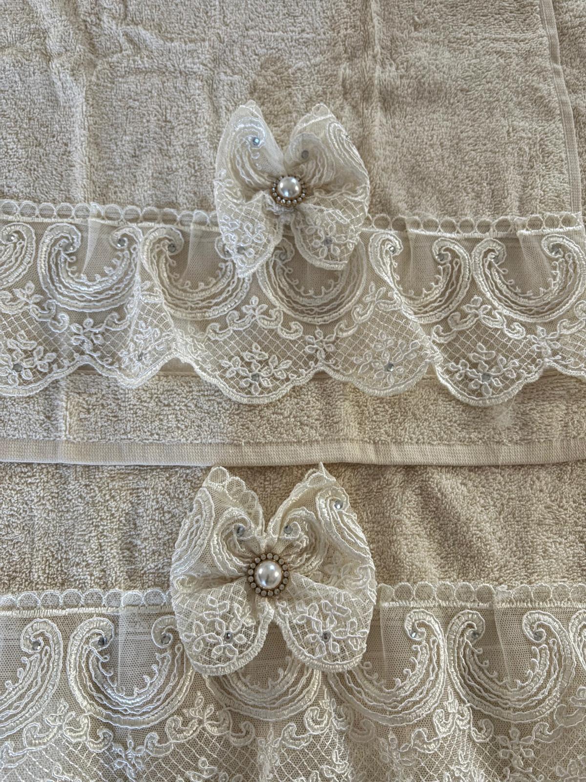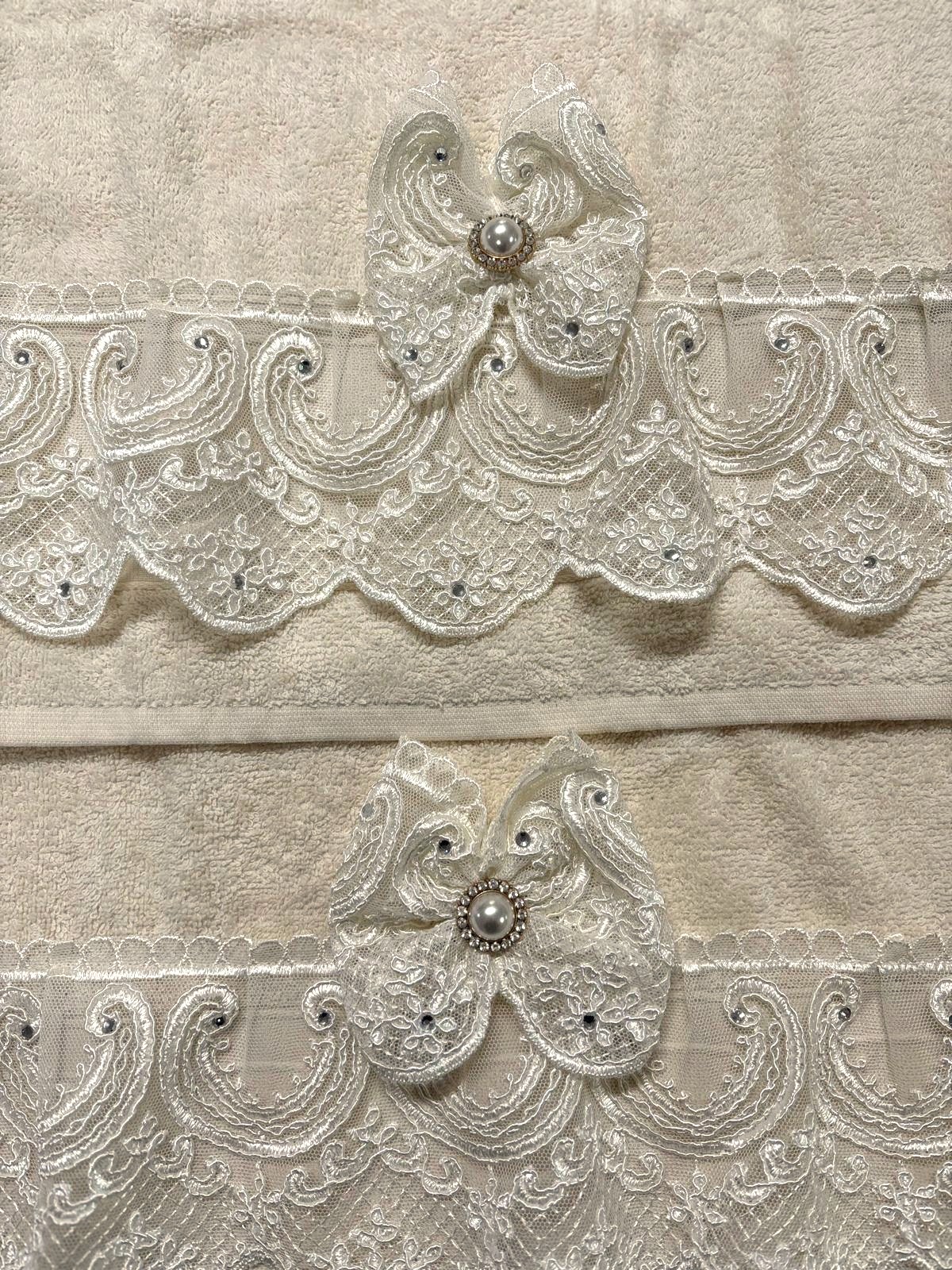 Coppia di asciugamani avorio decorate con pizzo rebrodè e swarovski e con fiocco in pizzo coordinato.
