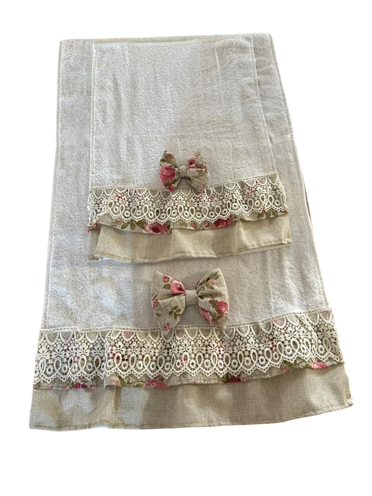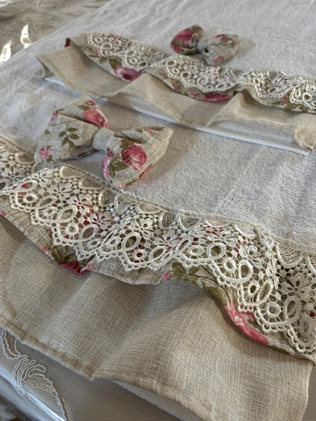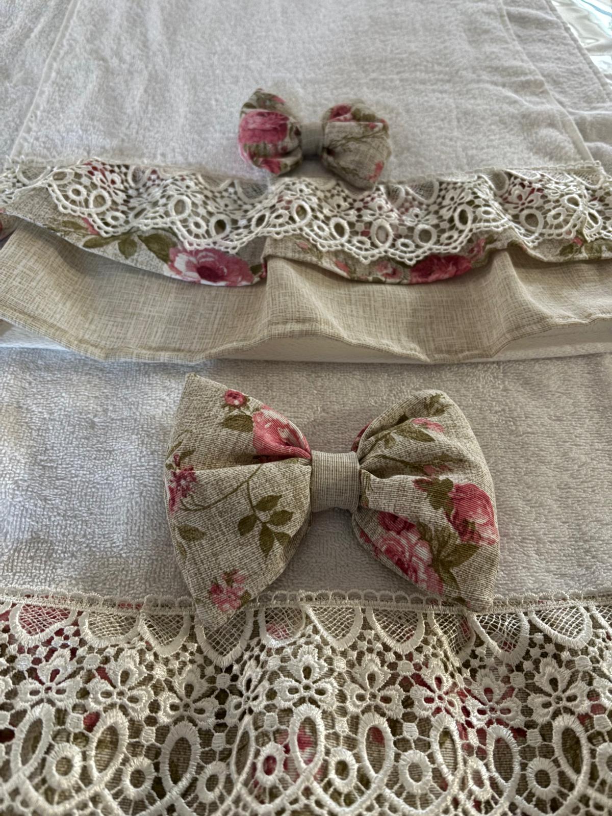 Coppia di asciugamani in spugna bianche decorate con tessuto di cotone in panama e floreale e con fiocco coordinato.