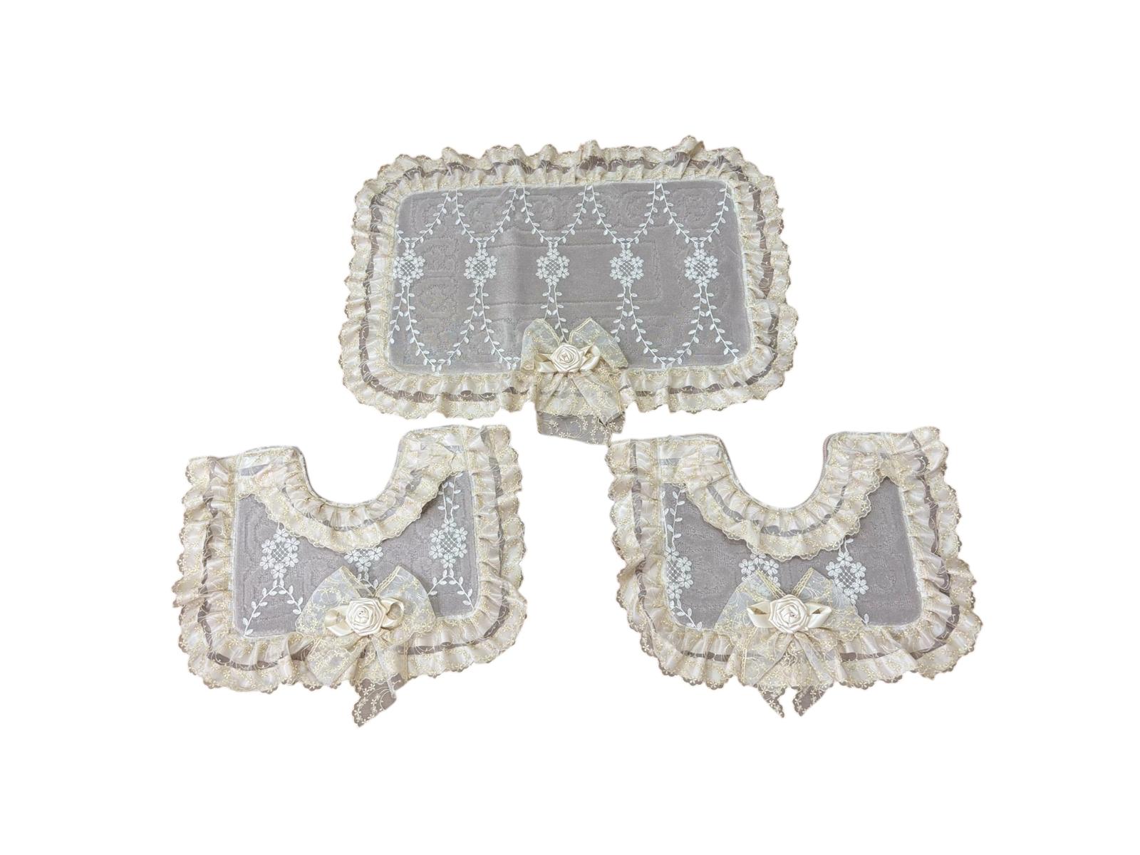 Tappeti crema per il bagno decorati con pizzo bianco e oro antico e con fiocco in pizo con rosa avorio.