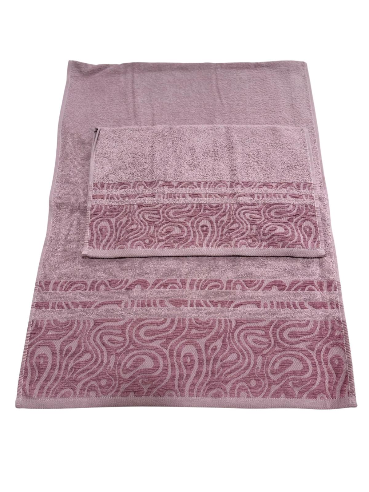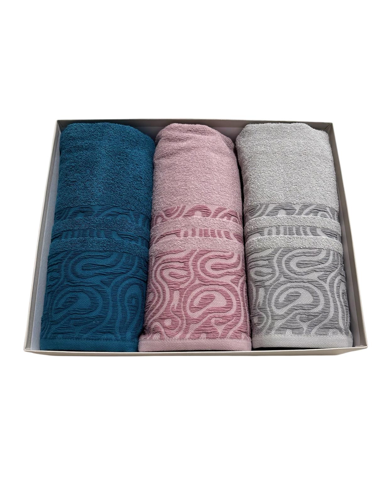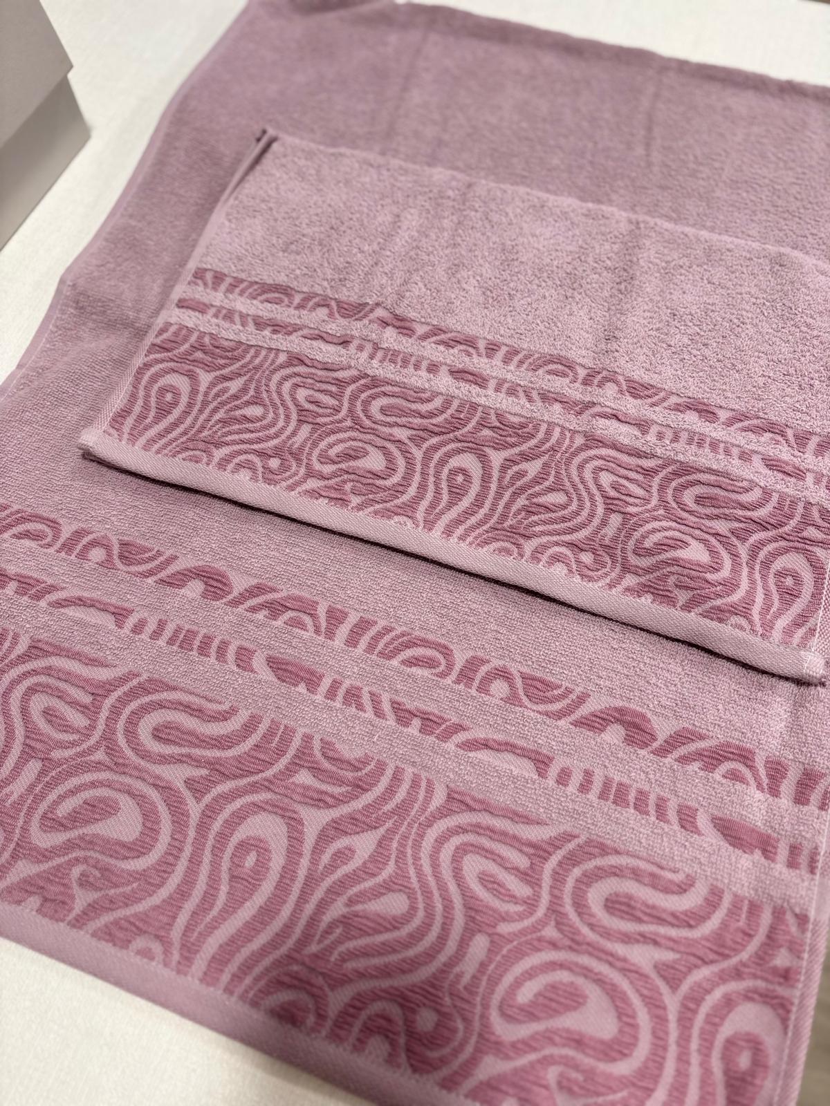 Set 3+3 (tre asciugamani grandi e tre piccole) asciugamani in spugna jacquard di tre colori: malva, grigio, ottanio.