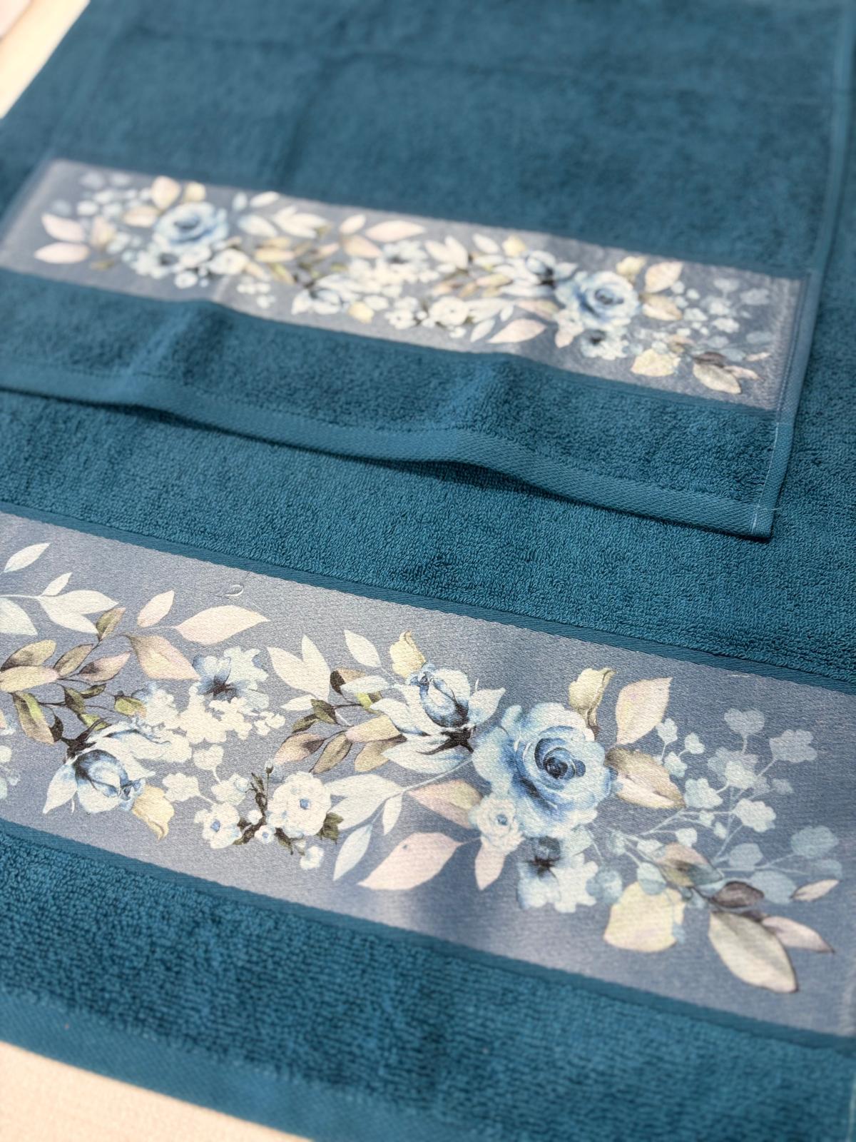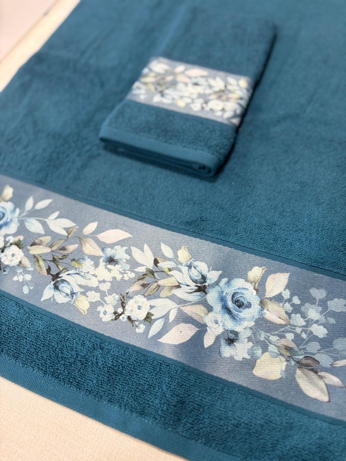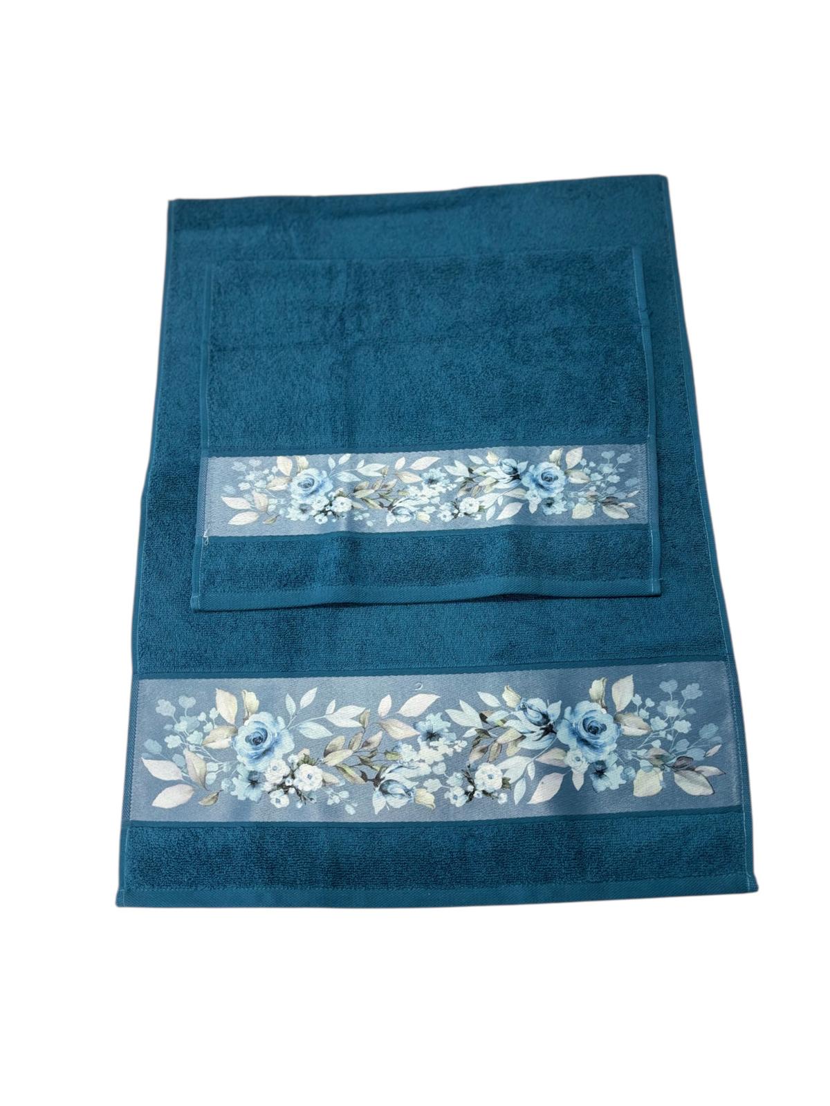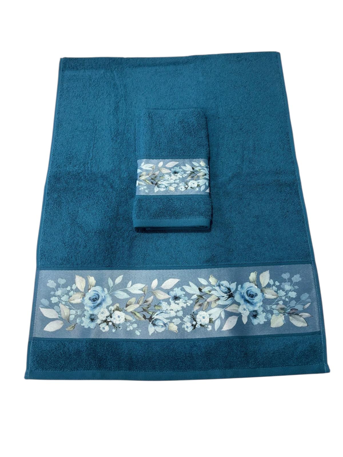 Set asciugamani 1+1 ottanio con stampa floreale.