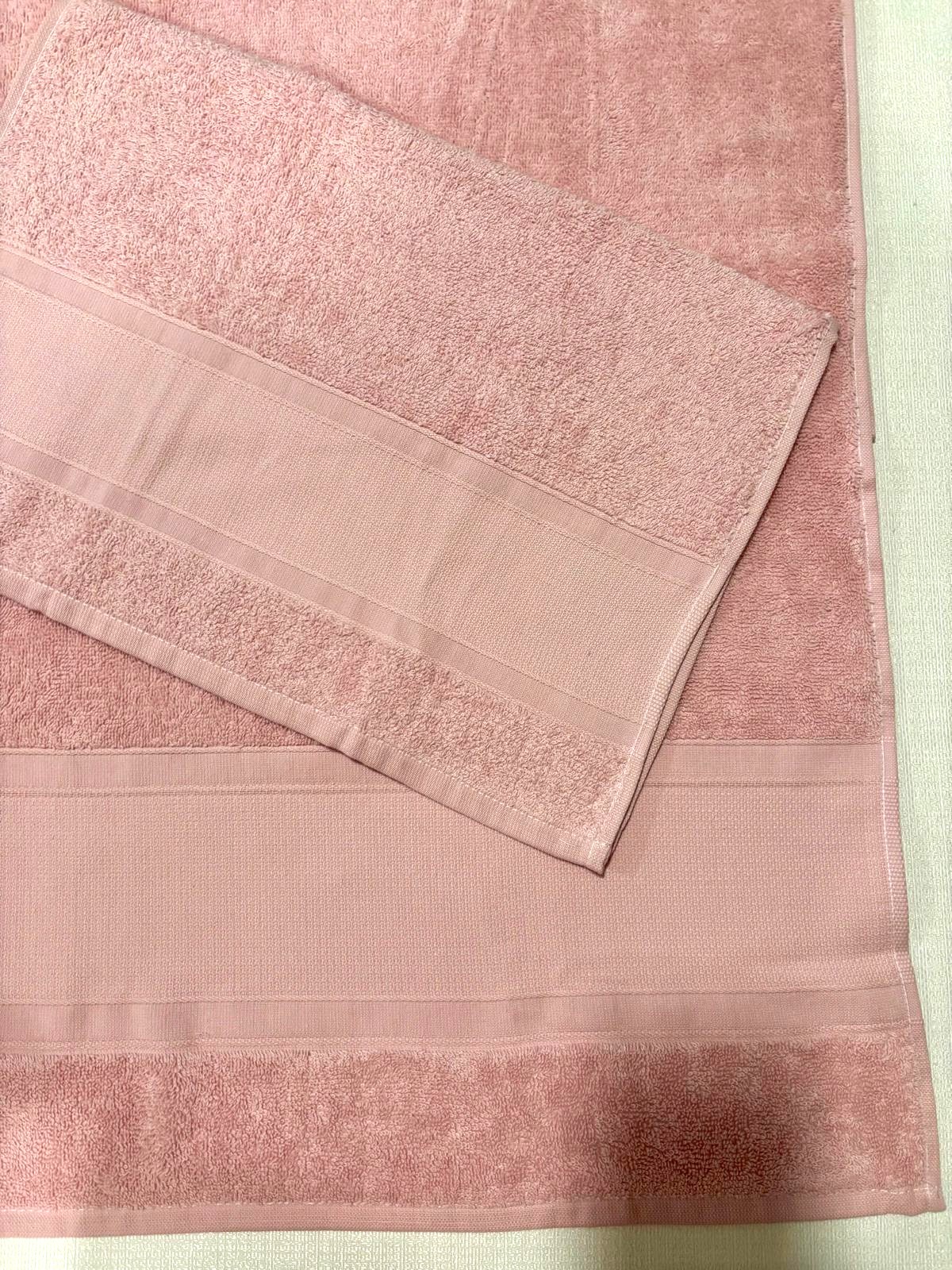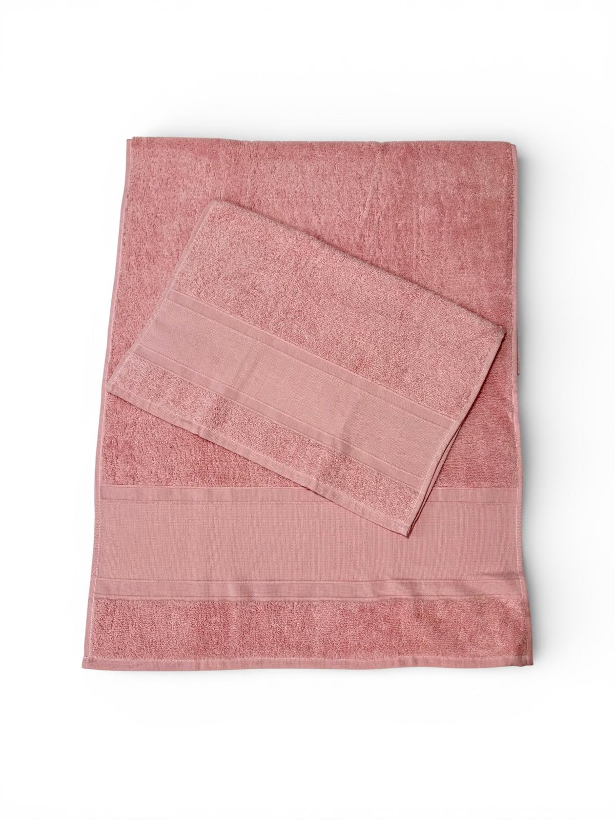 Set asciugamani 1+1 rosa in spugna con fascia larga.