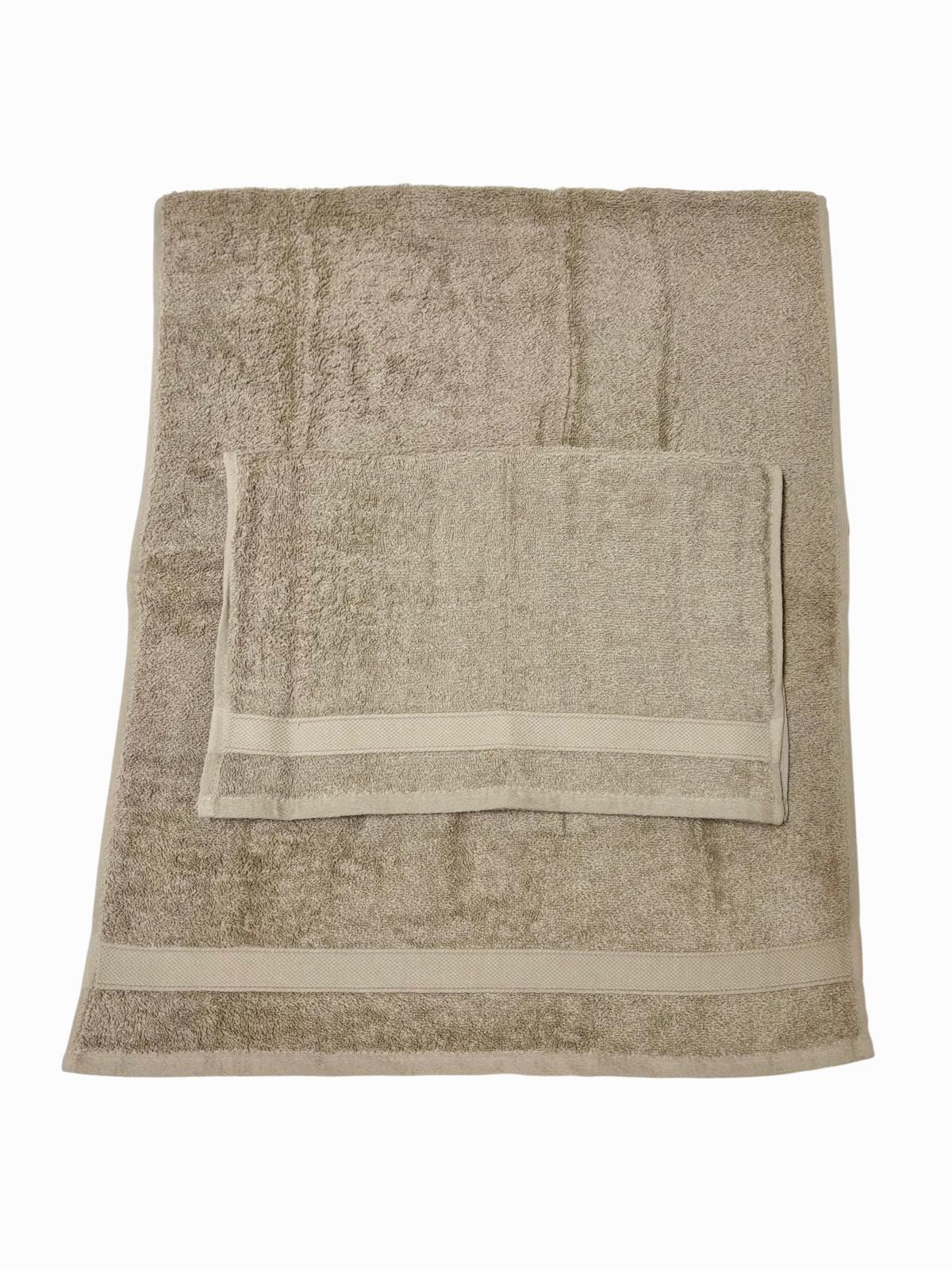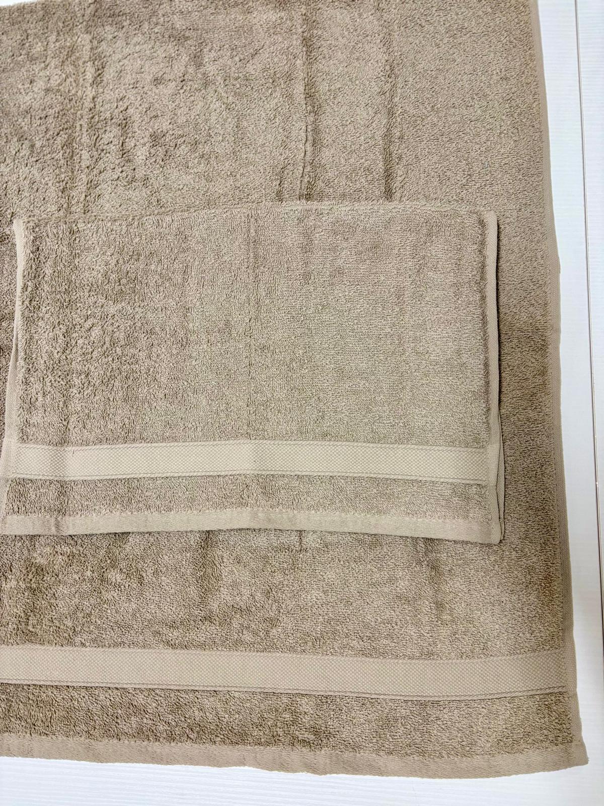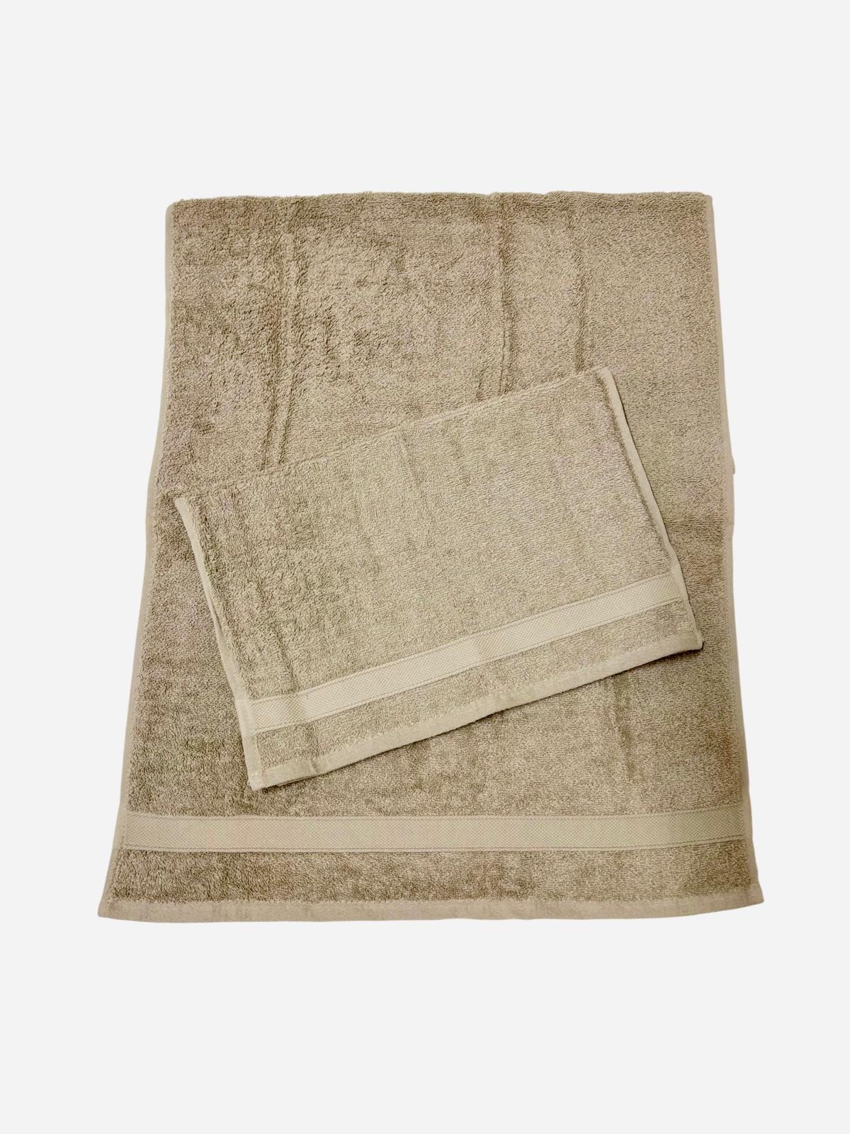 Set asciugamani 1+1 tortora in spugna con fascia stretta.